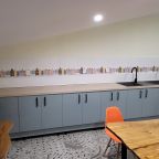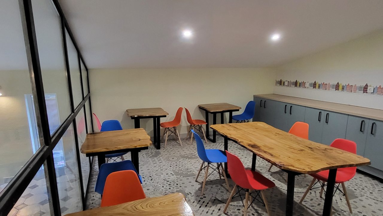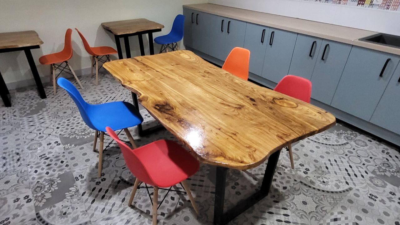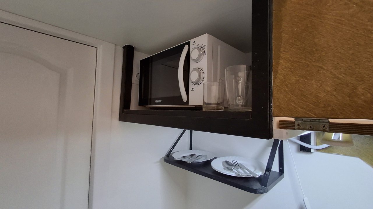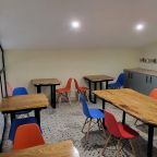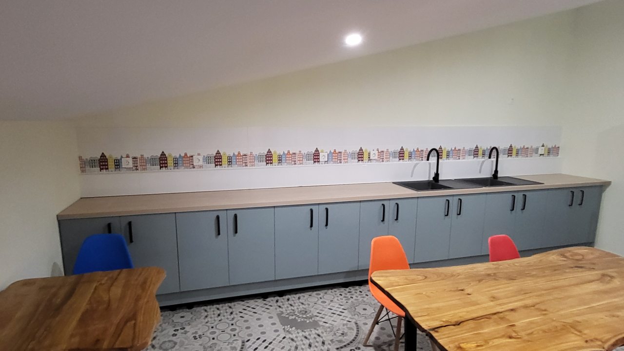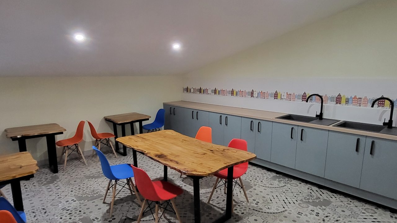 Имеется общая кухонная зона с чайником и микроволновой печью, а также обеденными столами.