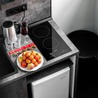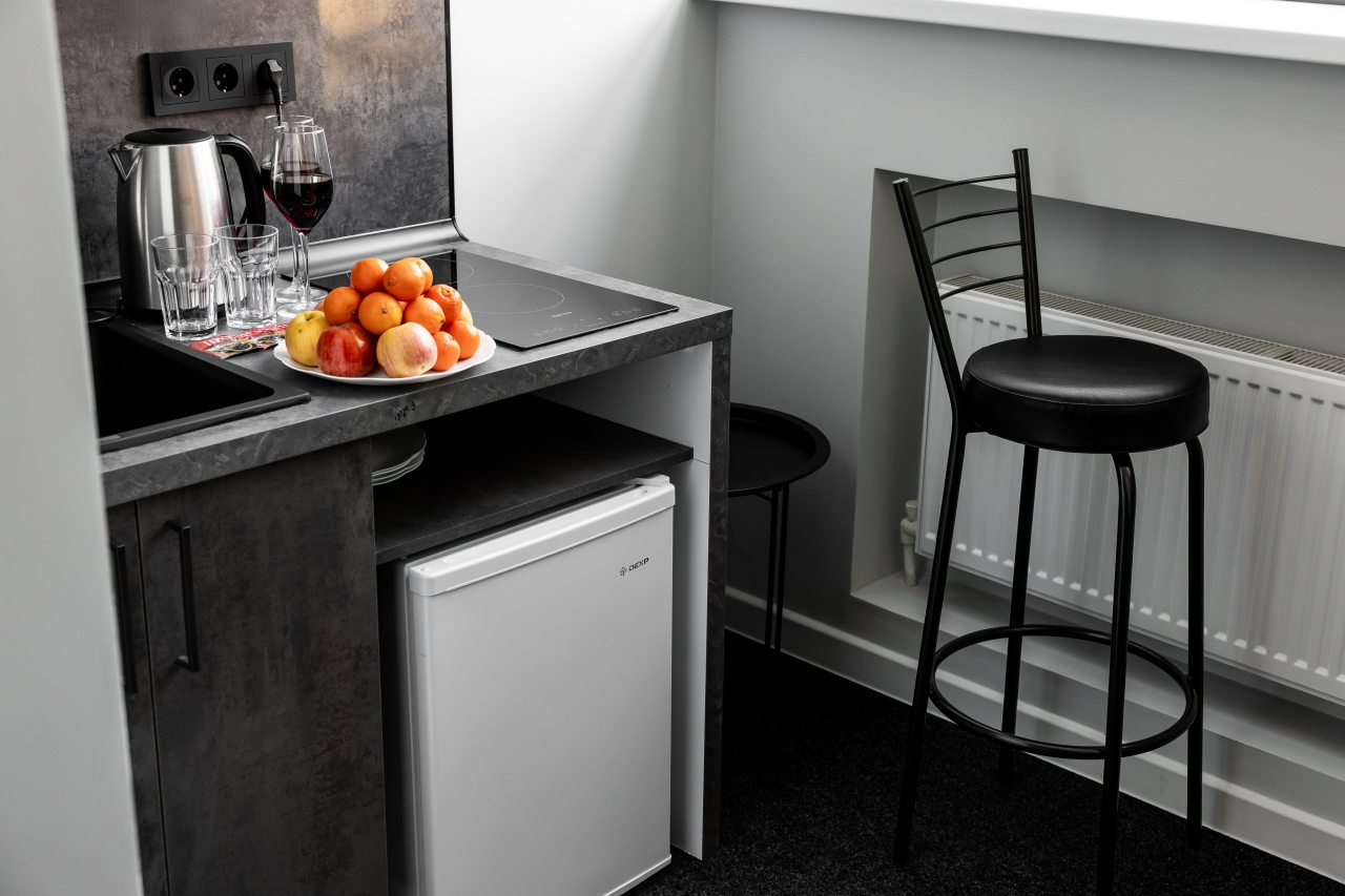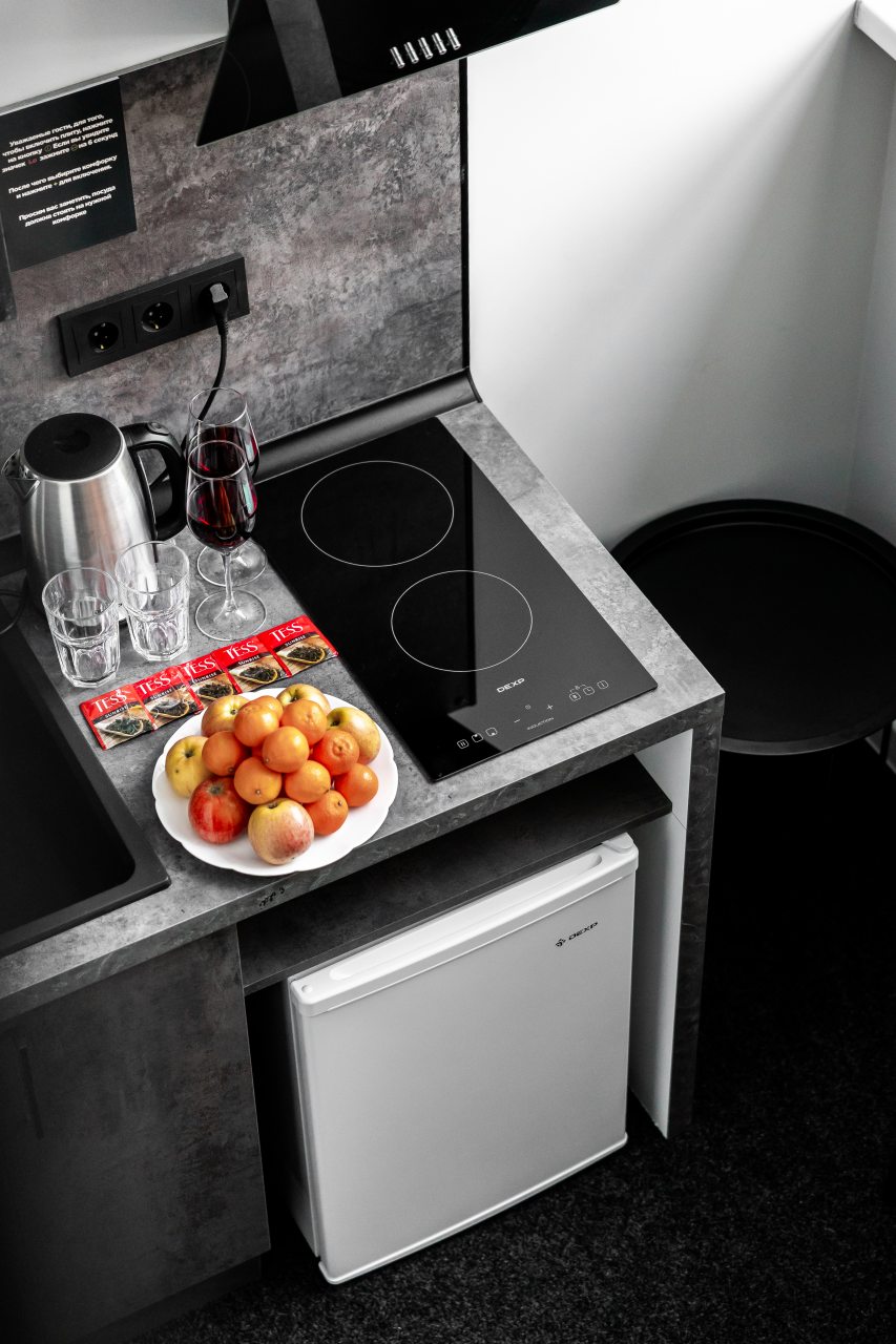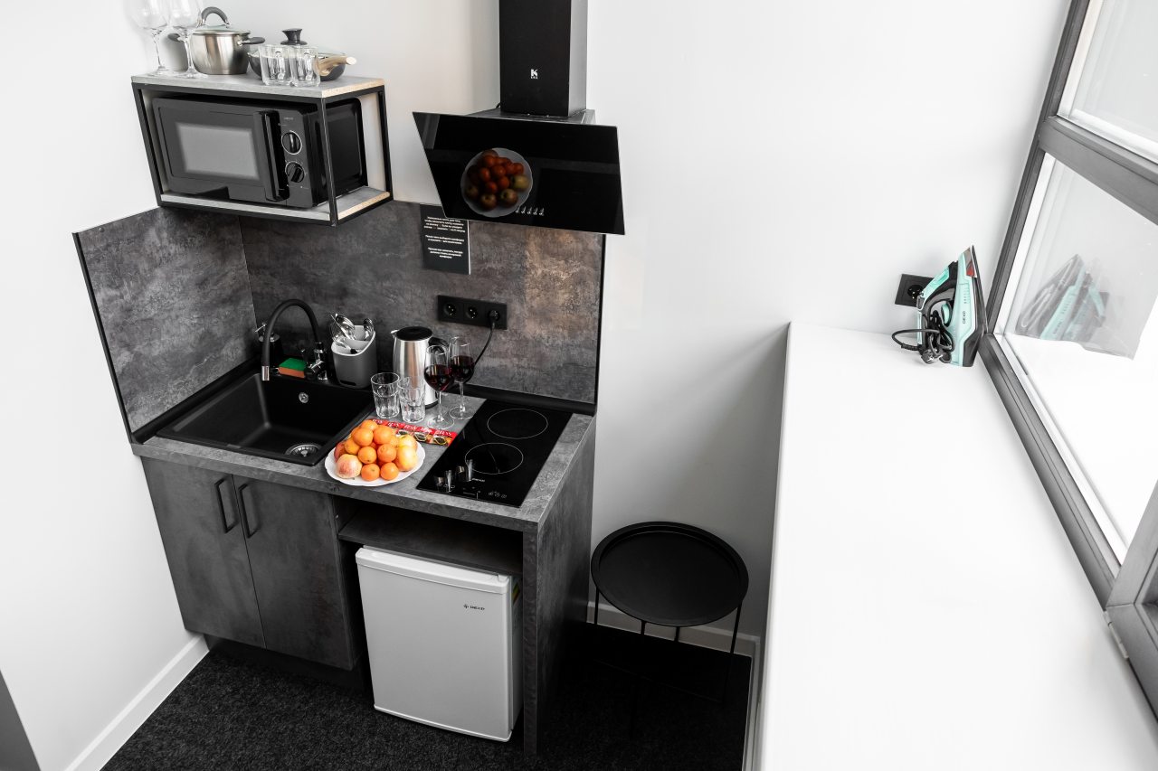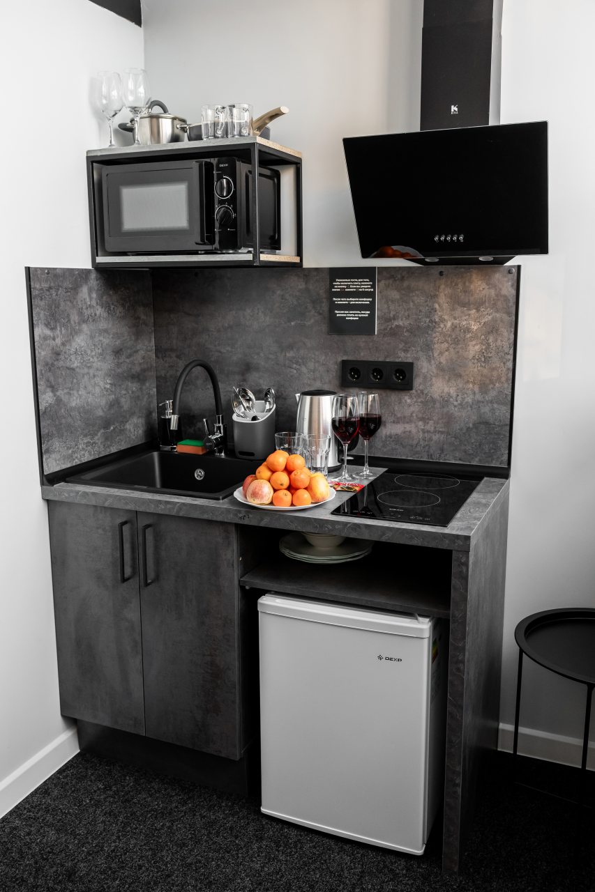 Мини-кухня оборудована бытовой техникой и посудой для приготовления еды. Рядом находятся кафе «Лемонграсс» и ресторан «Кавказский дворик».