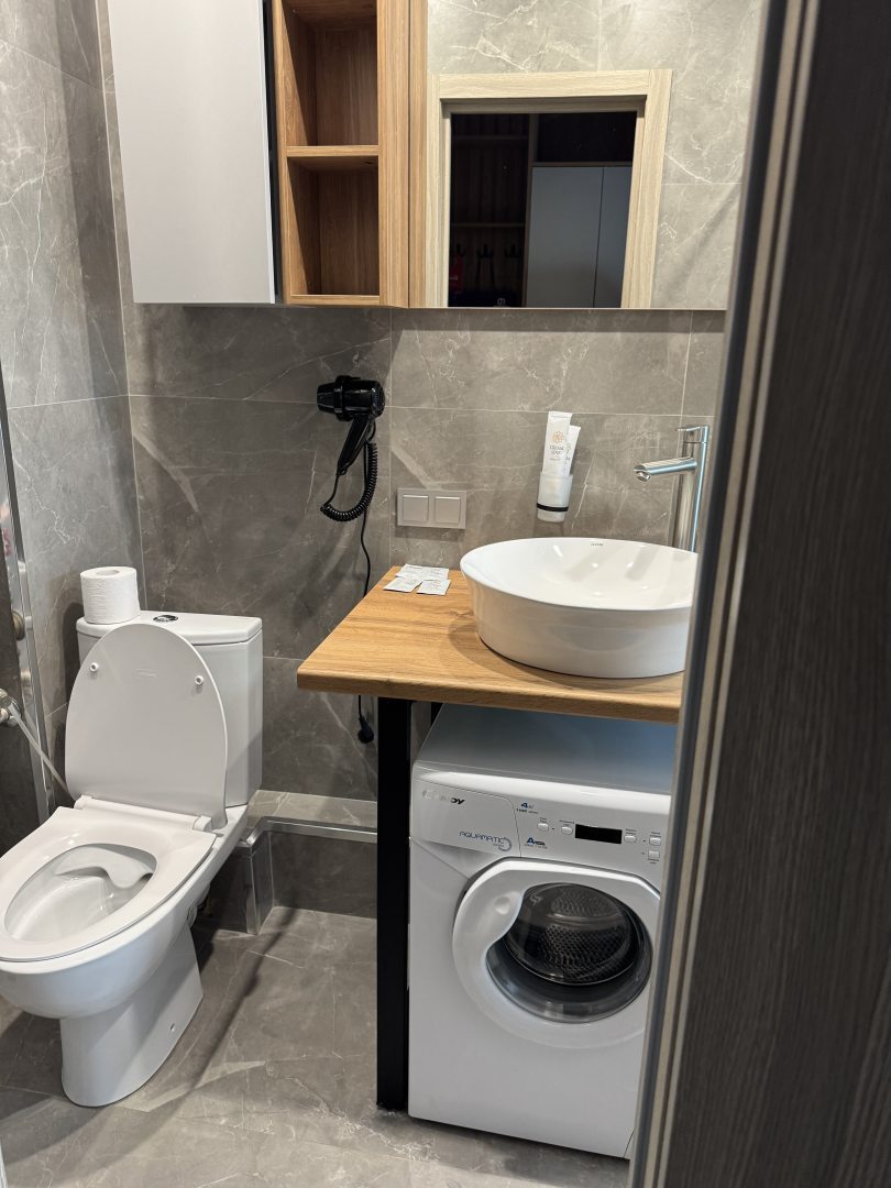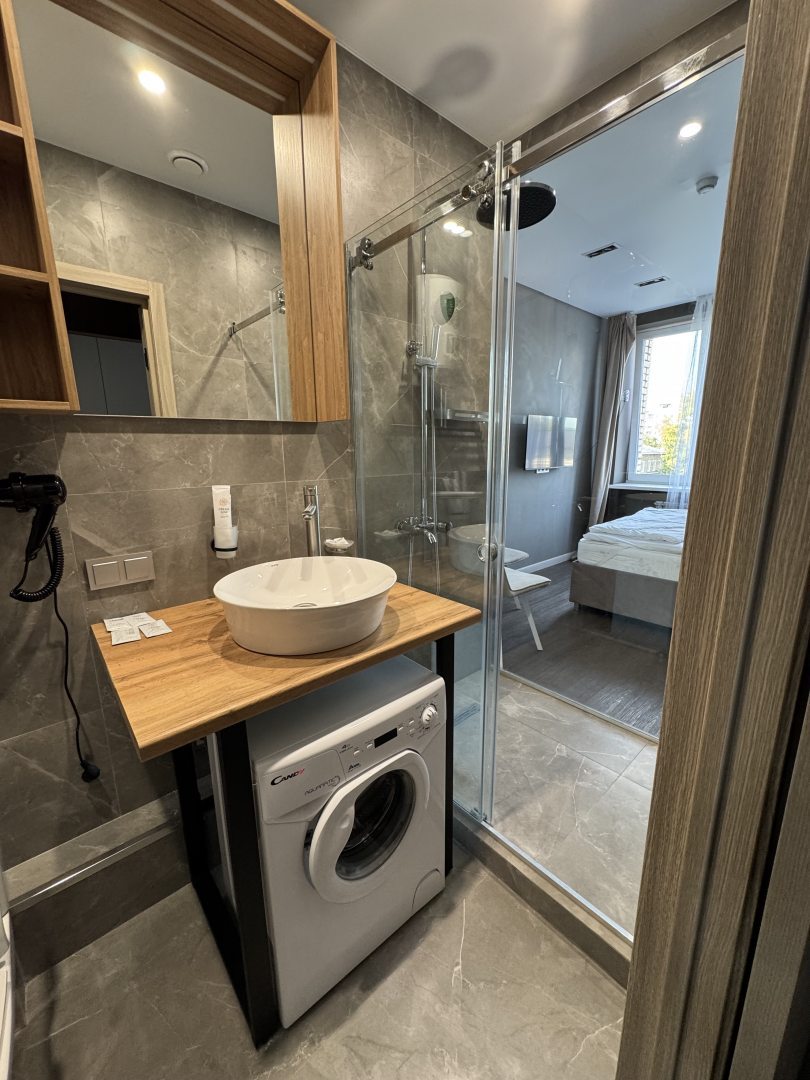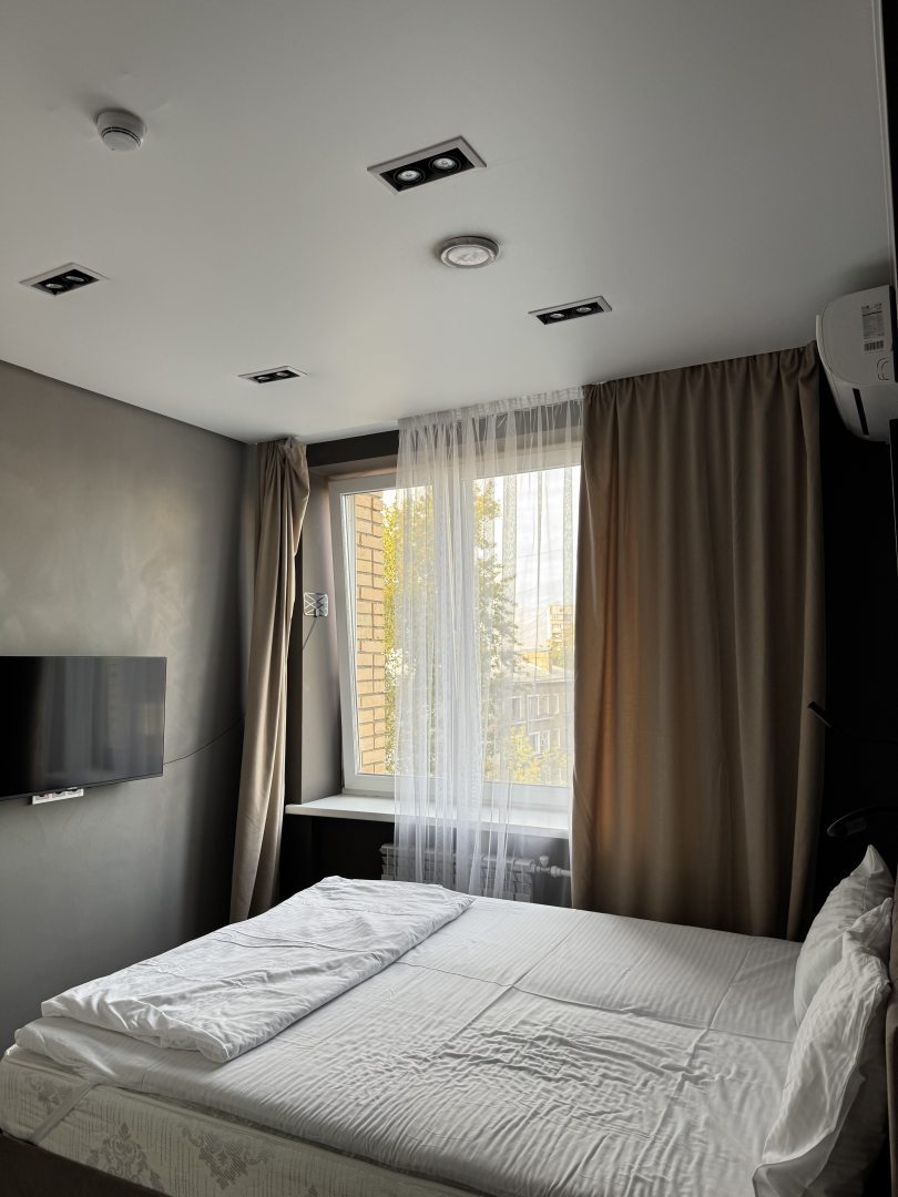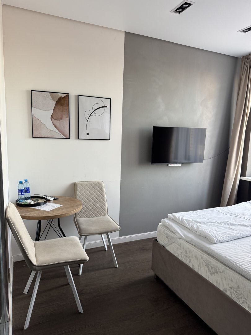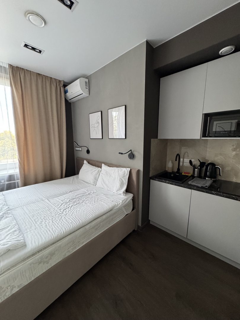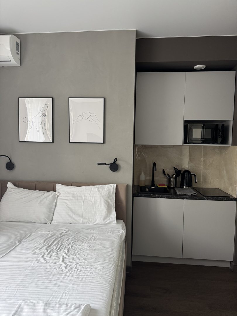 Свежий ремонт, все чистое, бытовая техника исправно работает, на кухне есть все необходимое, приятно находиться в номере. В шаговой доступности расположены продуктовые магазины. Переживала за сон, но матрас оказался удобный, соседей не слышно.