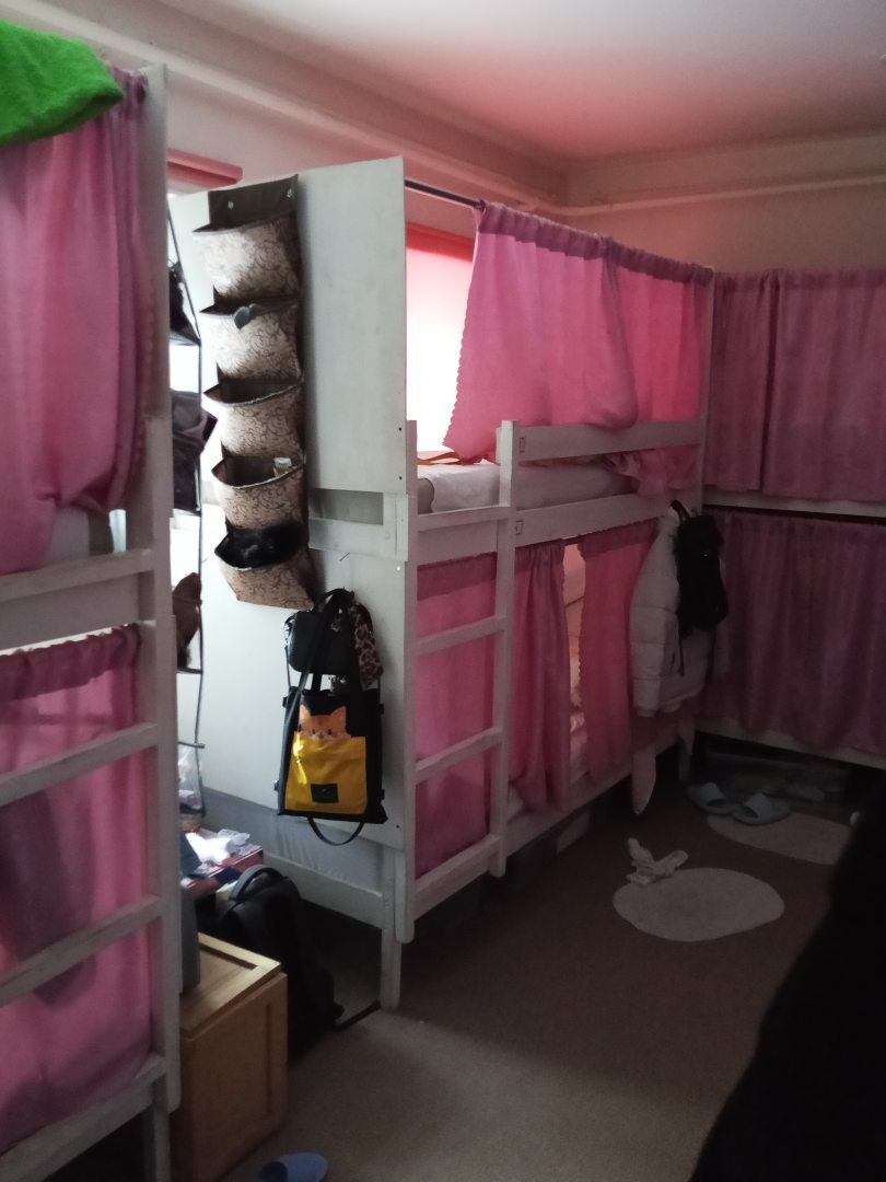 Жила в общем женском номере, кровати двухъярусные, койко-место оснащено розеткой, бра, полочкой, шторкой.