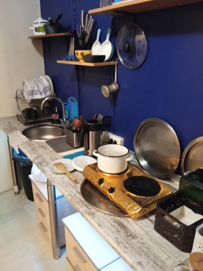 Кухня совместного пользования, оборудована всем необходимым: электрический чайник, посудные принадлежности, обеденный стол.