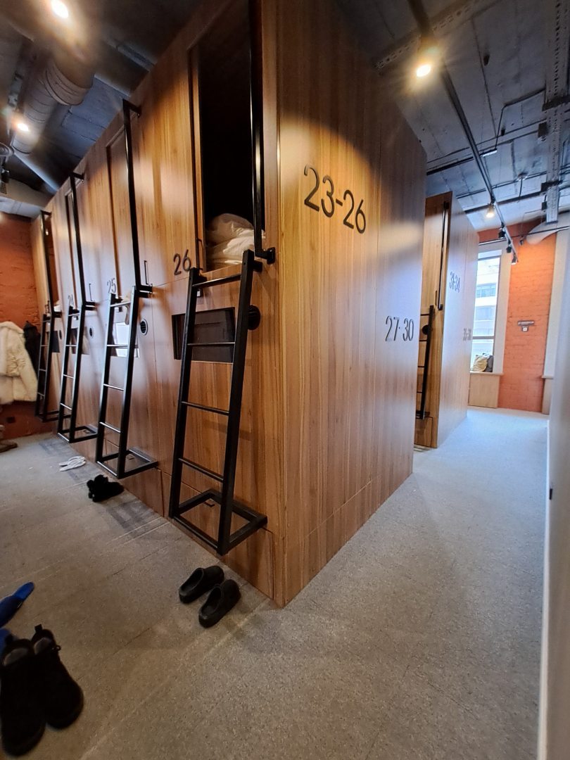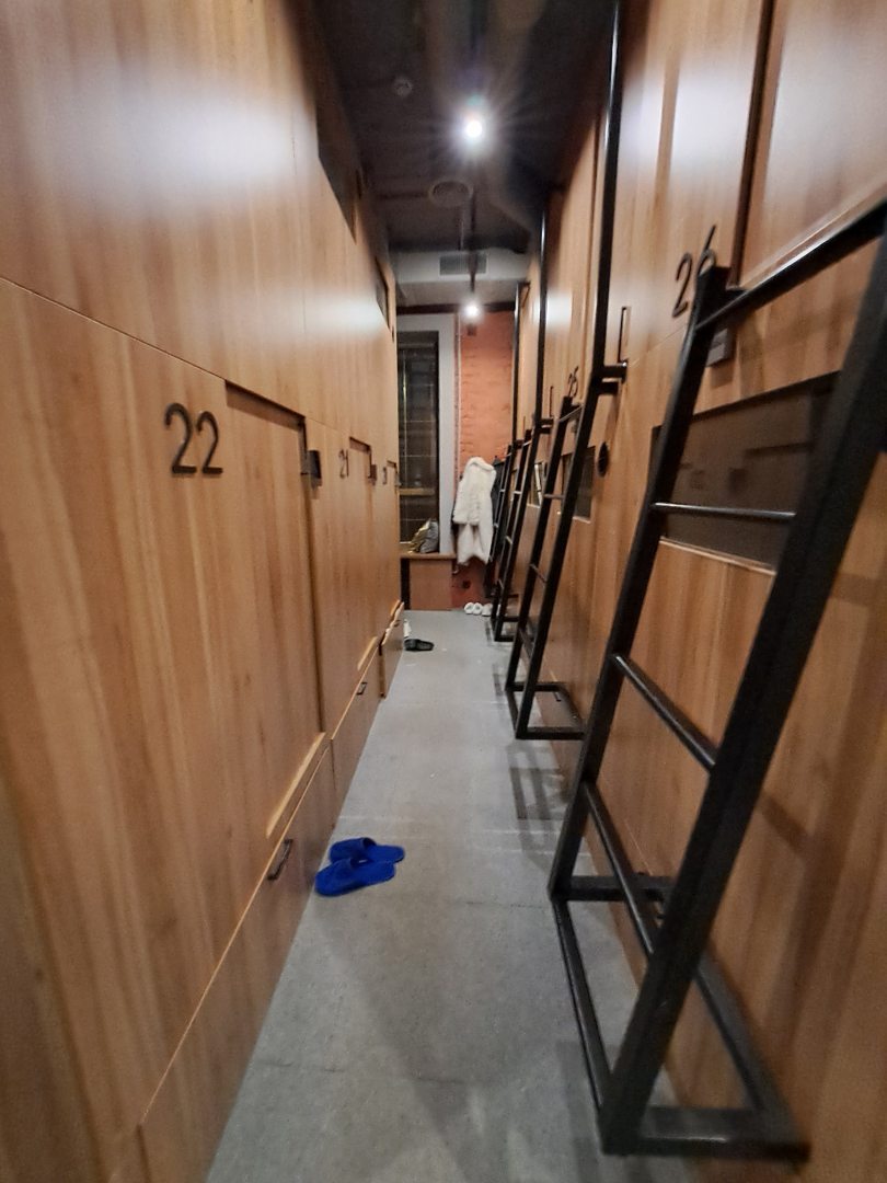 Уютно и соременное место для остановки. Вполне комфортные капсулы на кодовом замке, с розеткой, мини столиком и тумбой внутри, чистая постель, полотенце. В женском блоке наличие примерочной, гладильной, макияжной с зеркалами, 3 туалета, 3 душевых с мылом и шампунем.