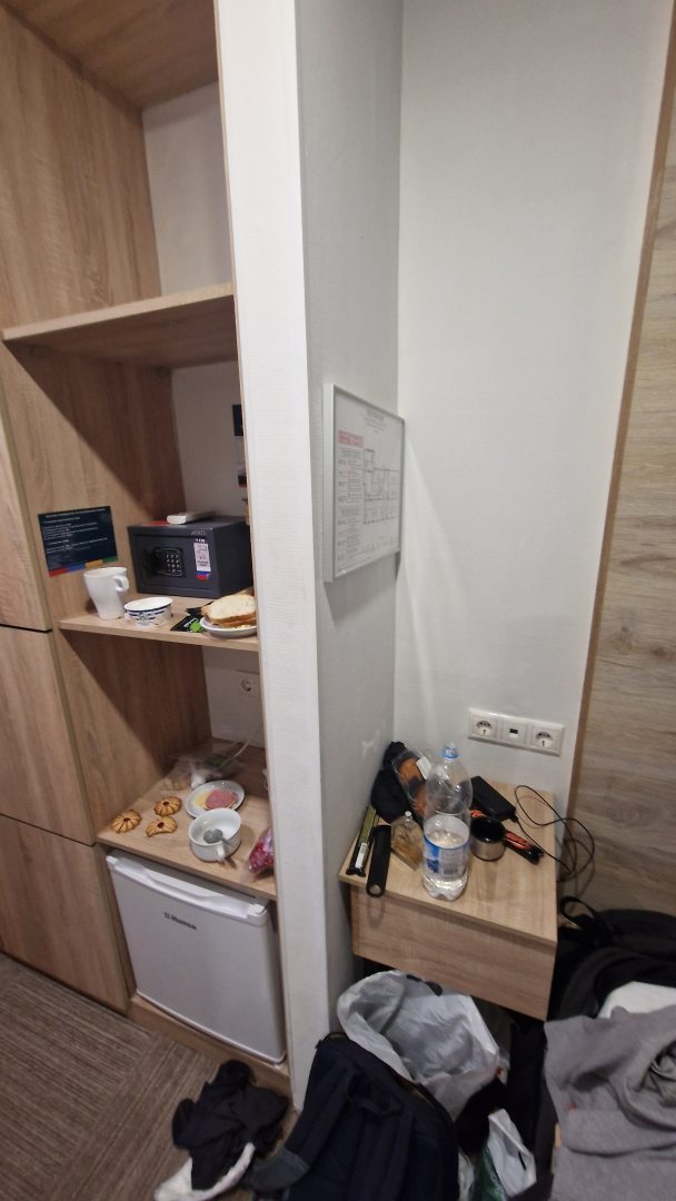 В номера чисто, есть холодильник, фен, чайник. Шампунь, гель для душа и мыло в наличии. Завтраки свежие, вкусные. Есть кофемашина.На кухне чай с печеньем в доступе круглосуточно. Рядом магазин "Евроспар" с большим выбором готовым блюд ( от каш и супов до шашлыка), все свежее и цены не как в кафе.