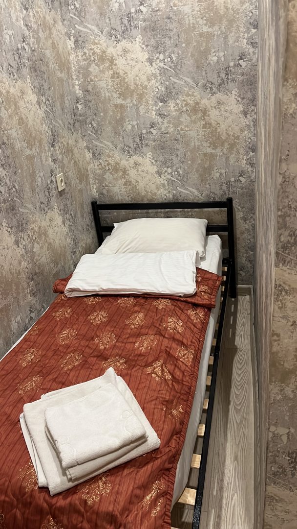 Удобная кровать, белые полотенца, тапочки. Всё для комфортного проживания.