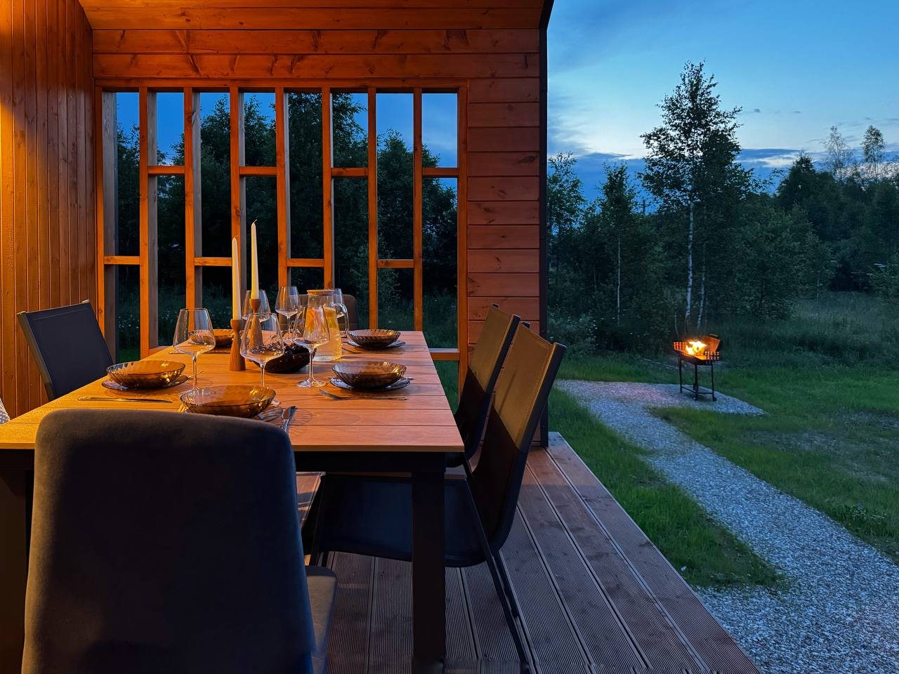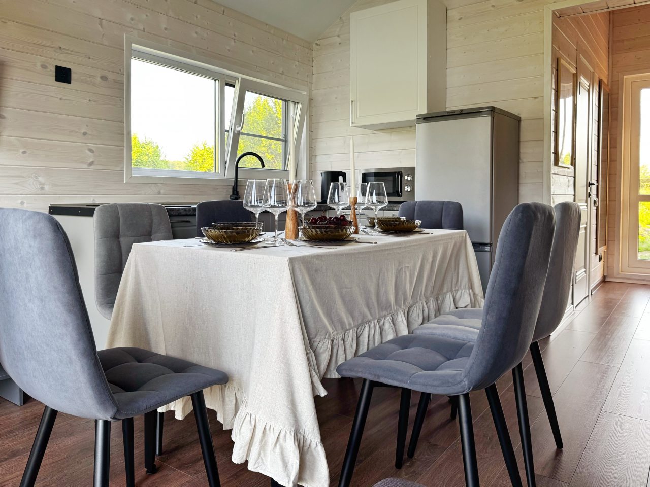 Для вашего удобства предусмотрено 2 обеденные зоны: внутри помещения и на террасе, оборудованная свч-печью, варочной панелью, посудой, холодильником кухня и мангальная зона на улице.