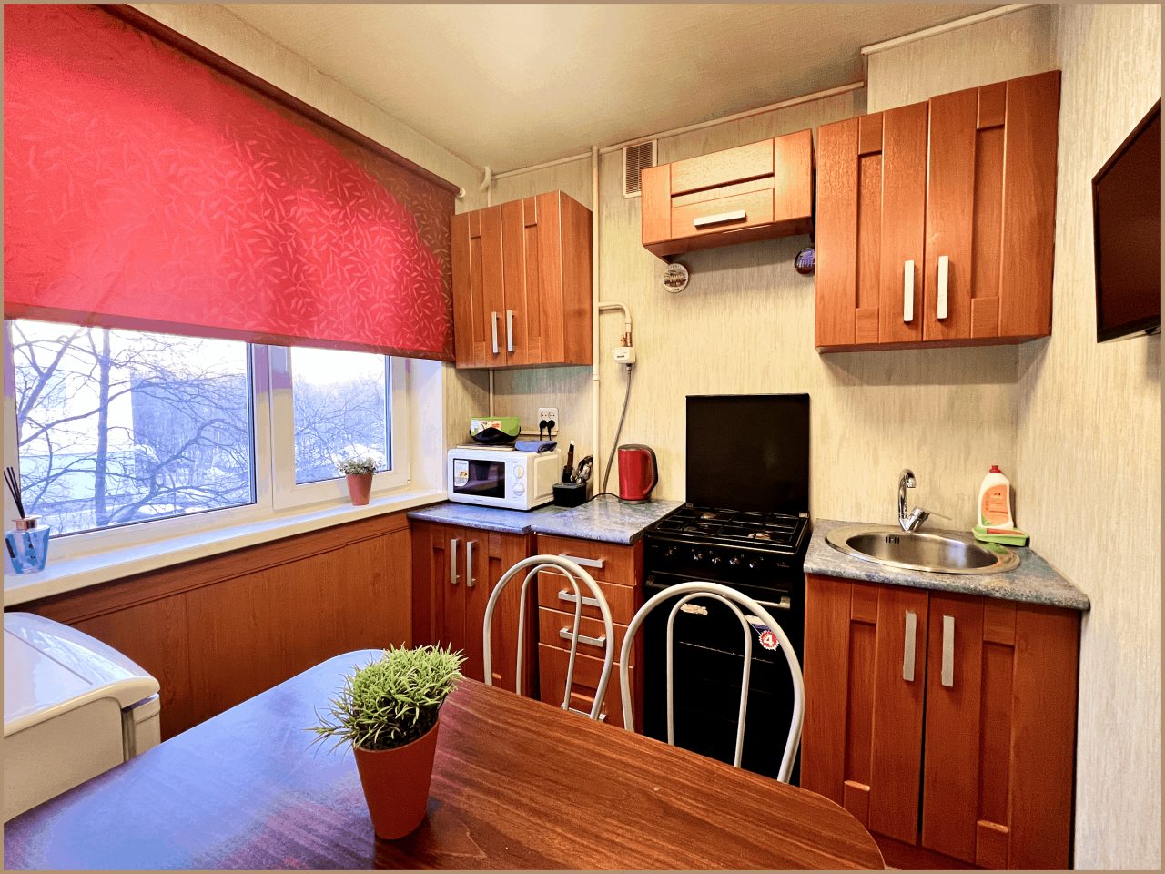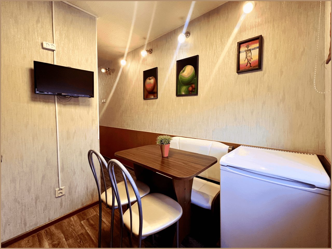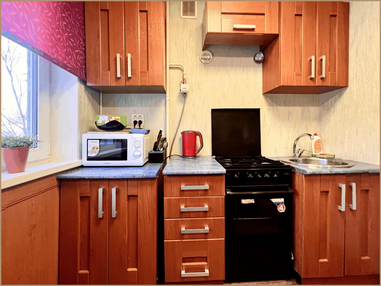 В кухонной зоне есть необходимые предметы бытовой техники, в том числе плита, электрический чайник, микроволновая печь и набор посуды. Рядом работают кафе и рестораны, где гости могут провести приятный вечер, наслаждаясь любимыми блюдами.