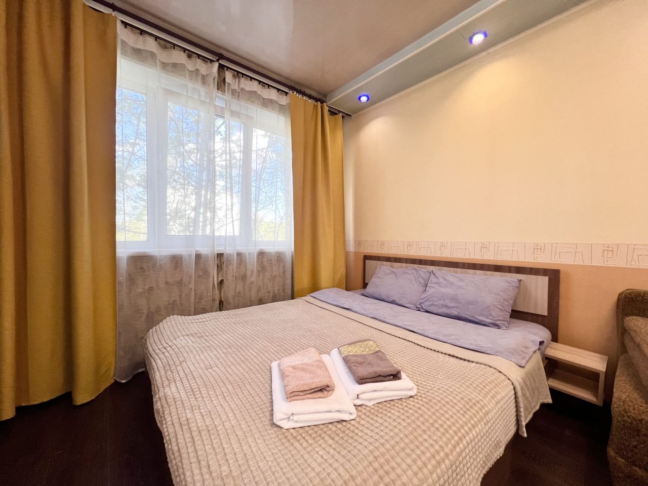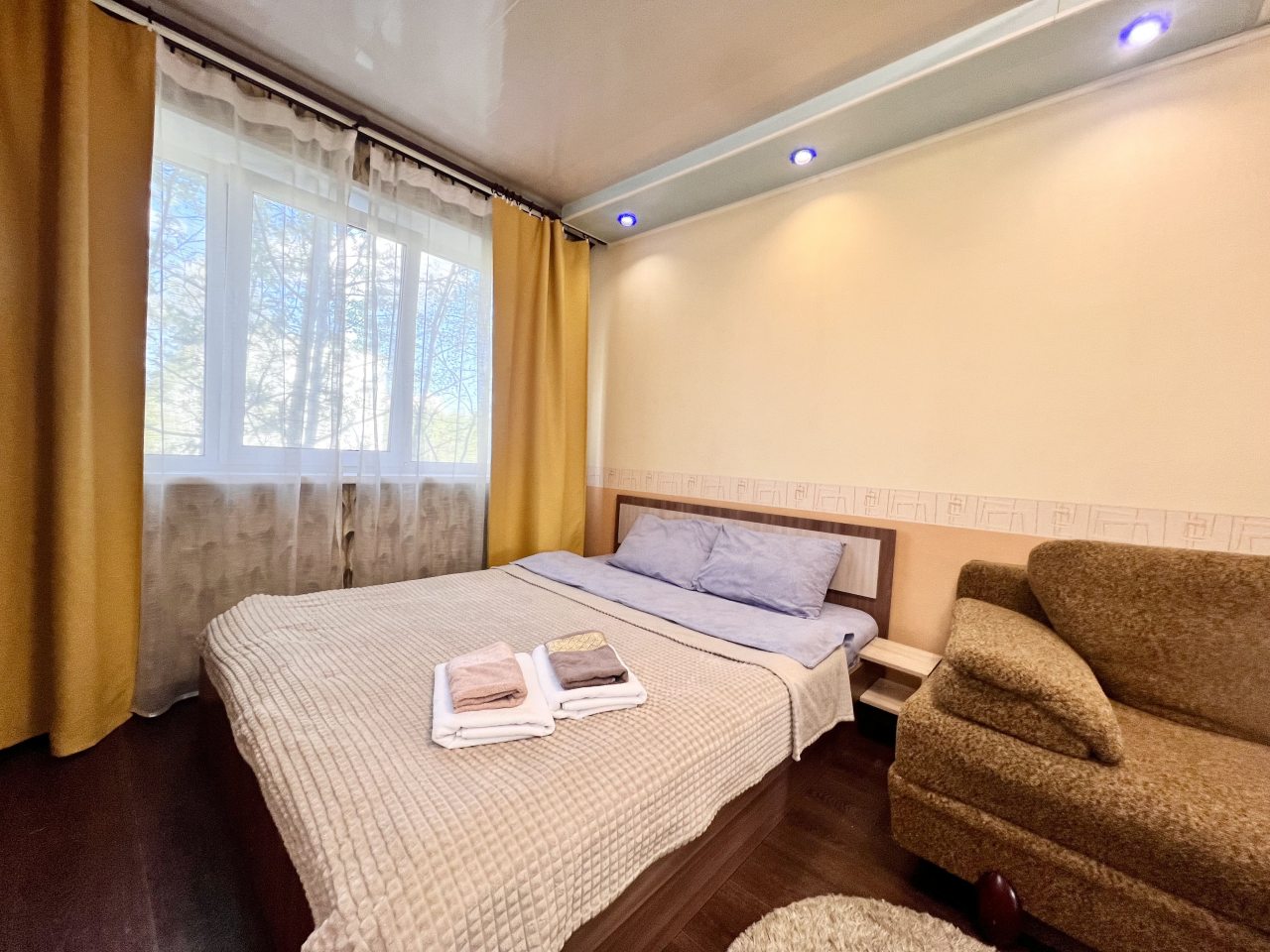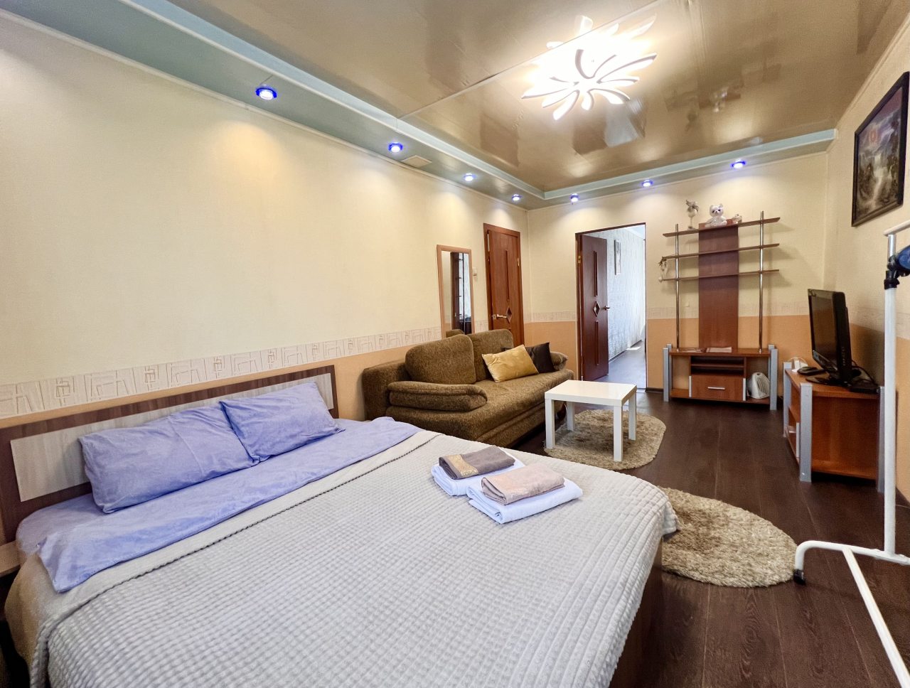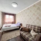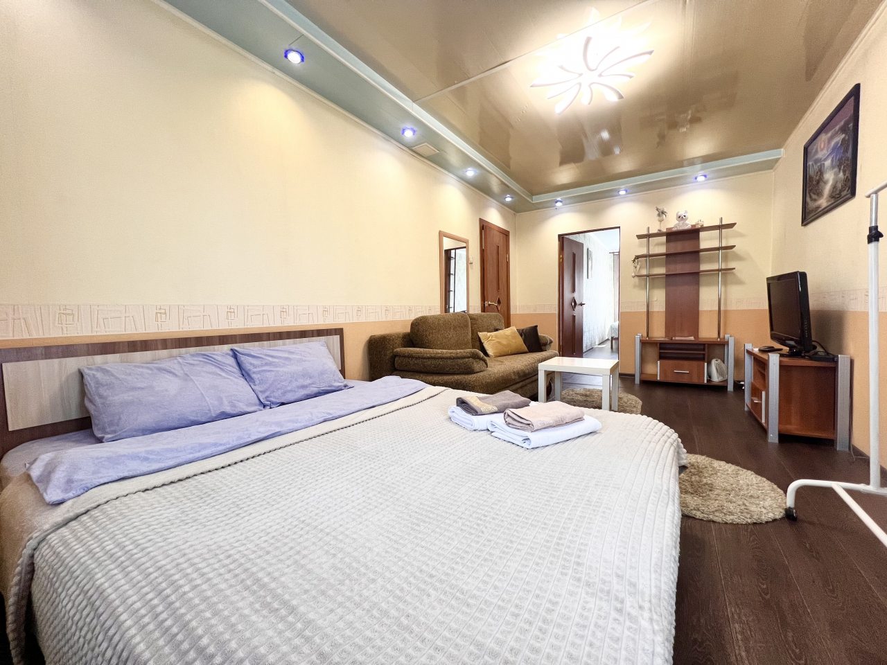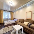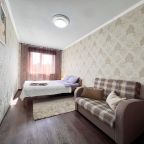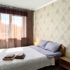 Для размещения предоставляется просторная квартира с современным ремонтом и планировкой. Здесь с комфортом может расположиться небольшая семья или компания друзей, так в апартаментах две спальни. В гостиной предусмотрены такие предметы техники и мебели, как диван, столик, телевизор, напольная вешалка. В ванной установлен водонагреватель и стиральная машина.