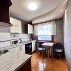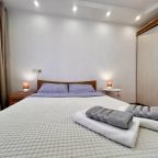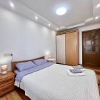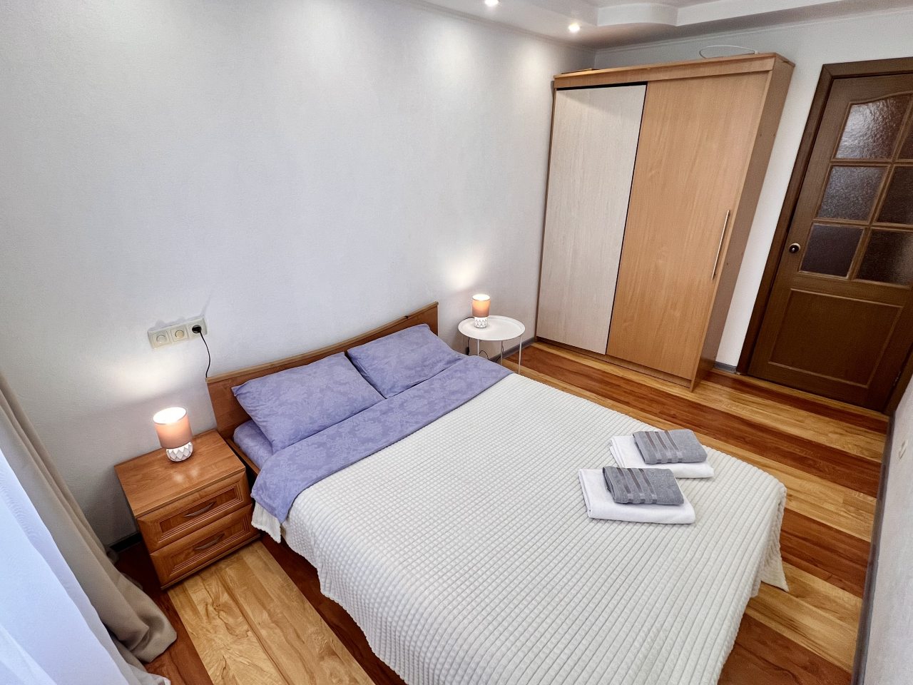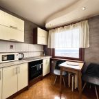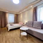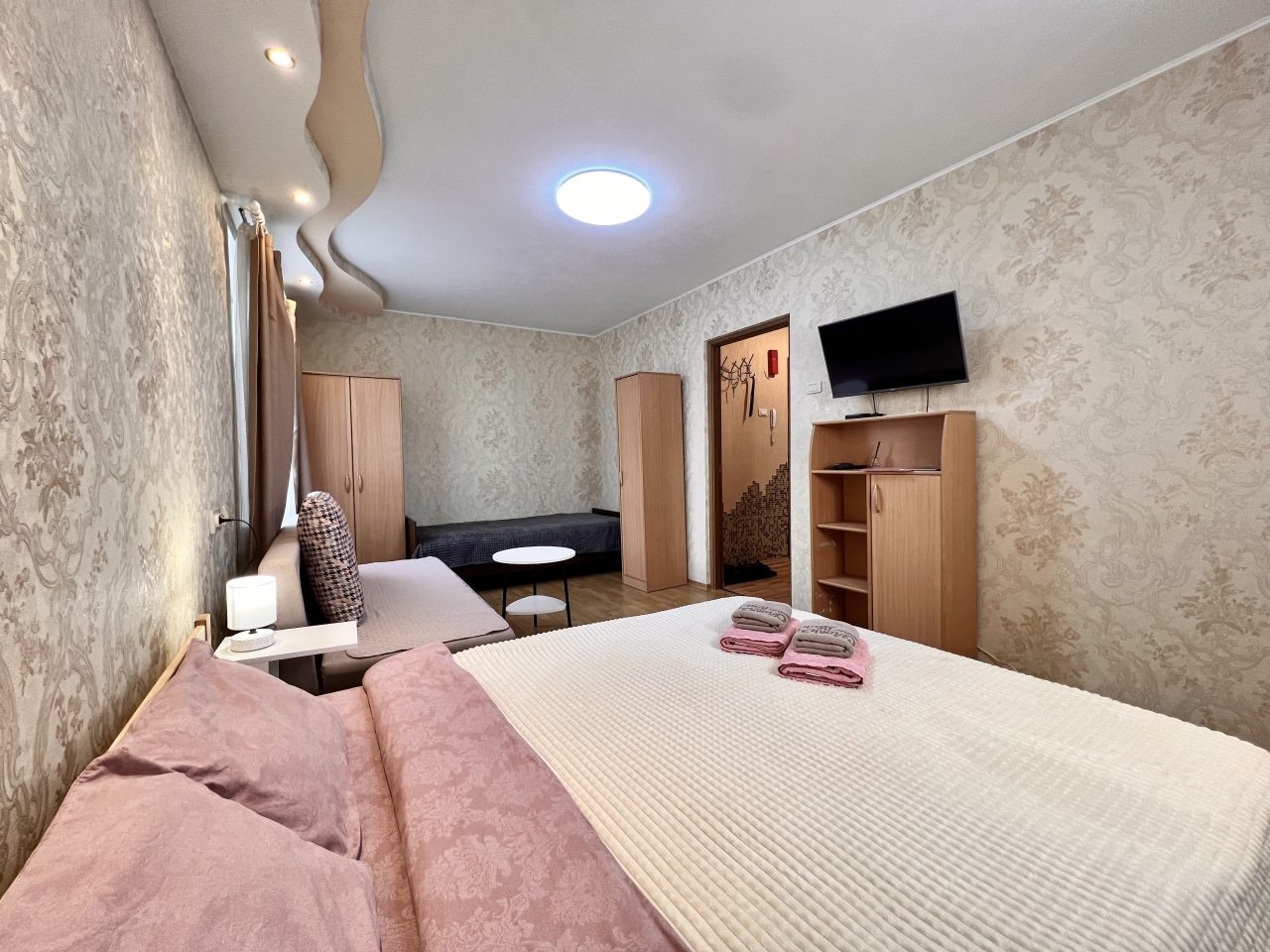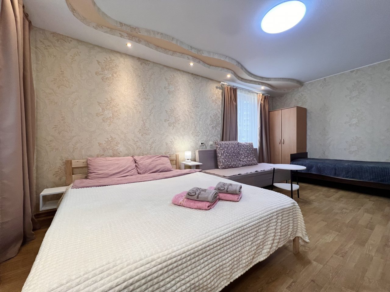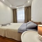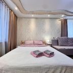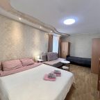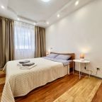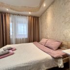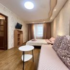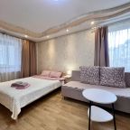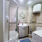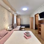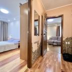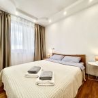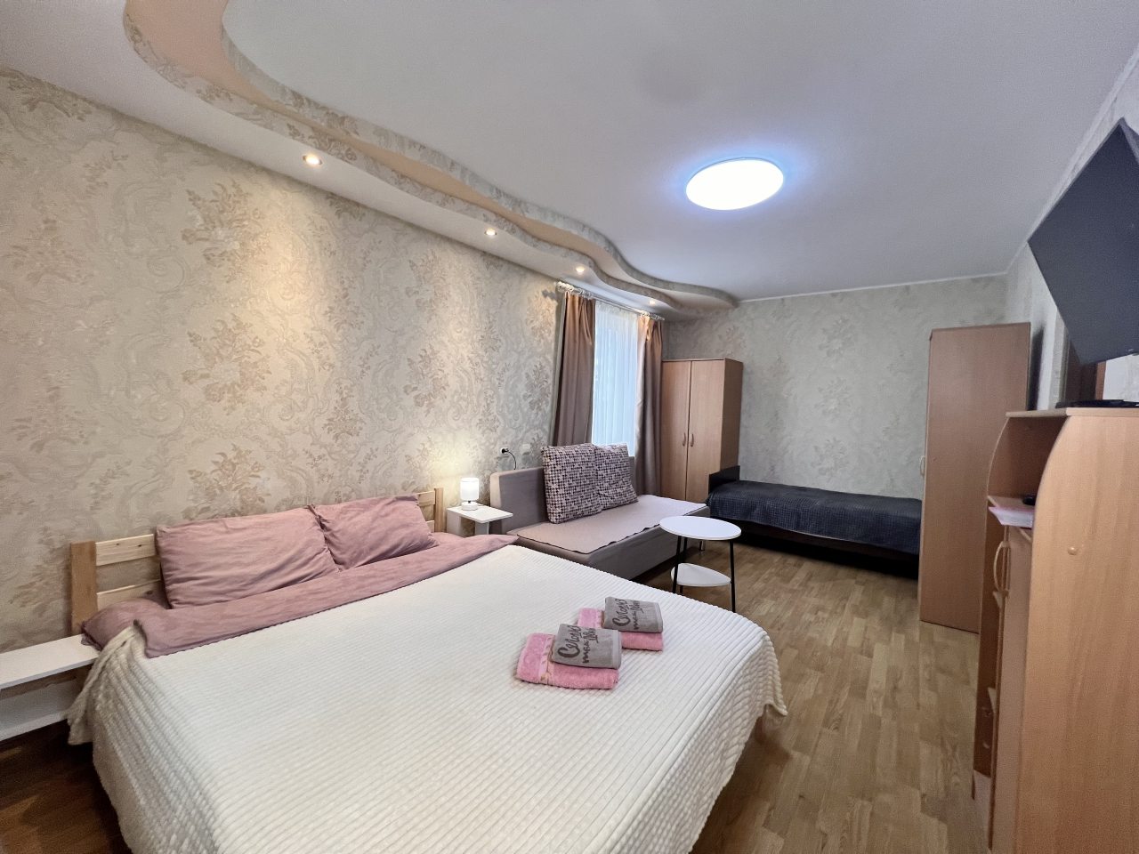 Апартаменты отлично подойдут для размещения семейной пары с детьми. Просторные комнаты оформлены в современном стиле интерьера и оснащены мебелью и техникой: двуспальные и односпальная кровати, мягкий диван, телевизор, вместительный шкаф для одежды. В санузле установлена душевая кабинка и есть средства гигиены.
