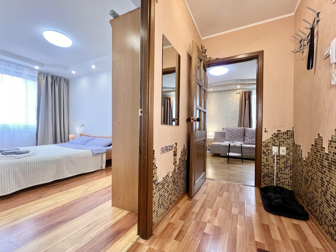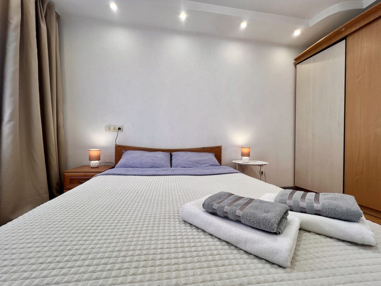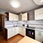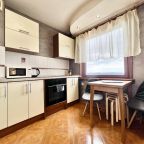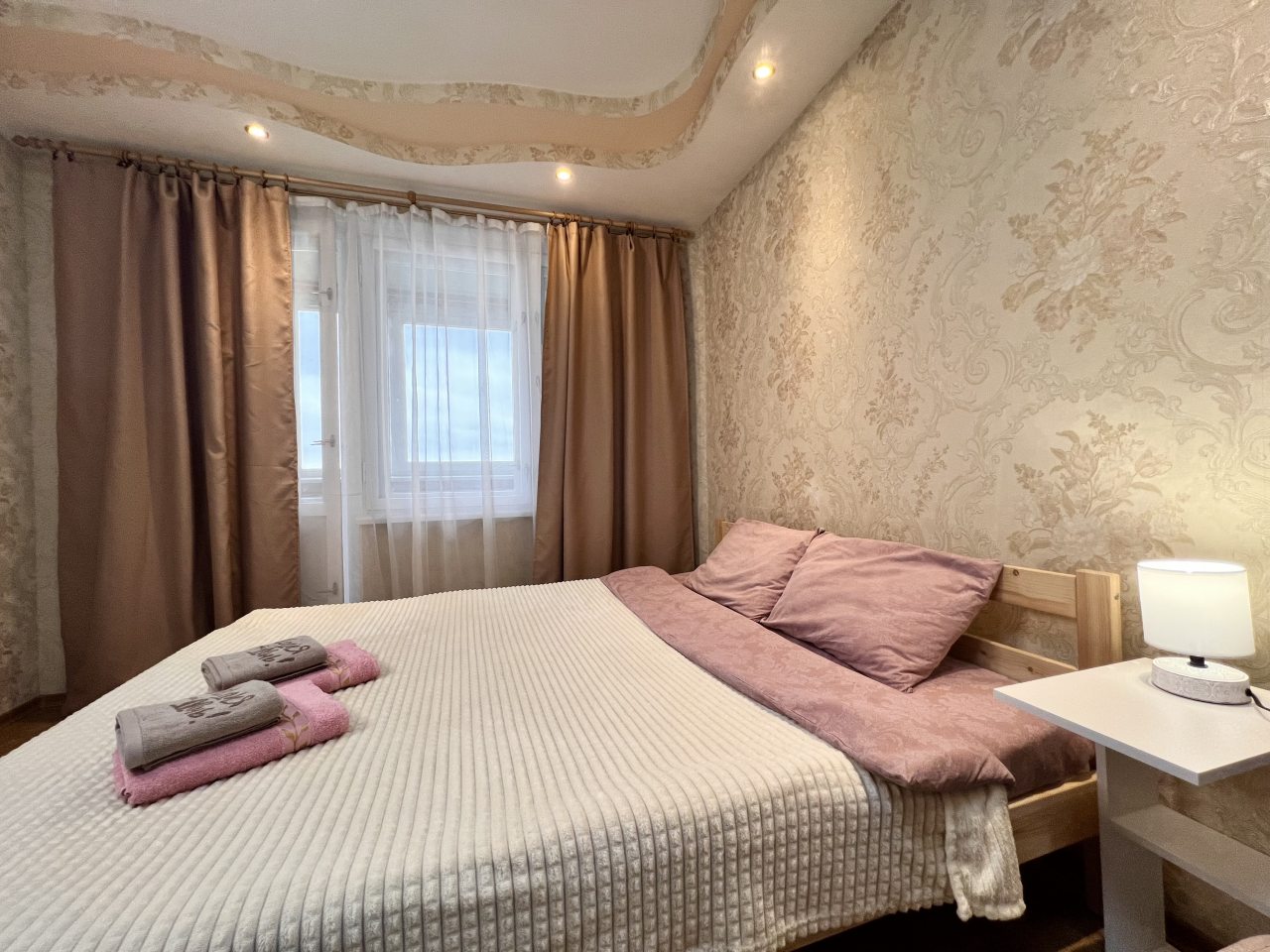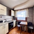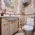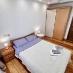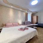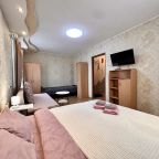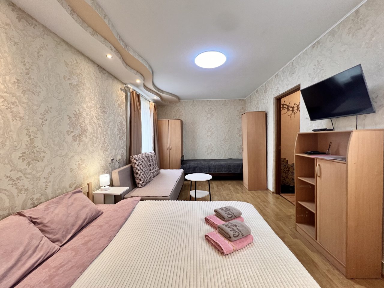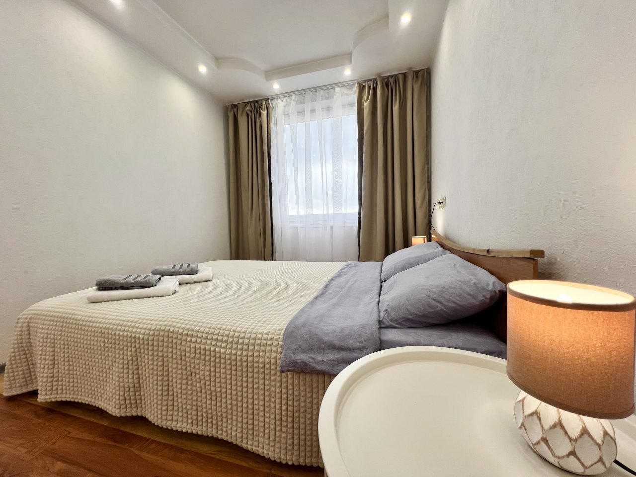 Апартаменты отлично подойдут для размещения семейной пары с детьми. Просторные комнаты оформлены в современном стиле интерьера и оснащены мебелью и техникой: двуспальные и односпальная кровати, мягкий диван, телевизор, вместительный шкаф для одежды. В санузле установлена душевая кабинка и есть средства гигиены.