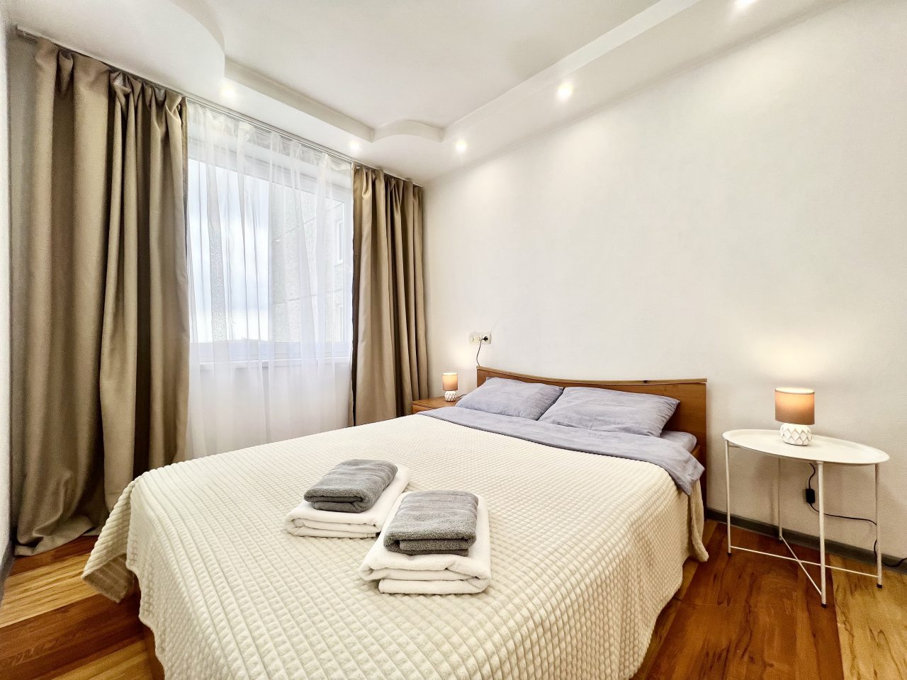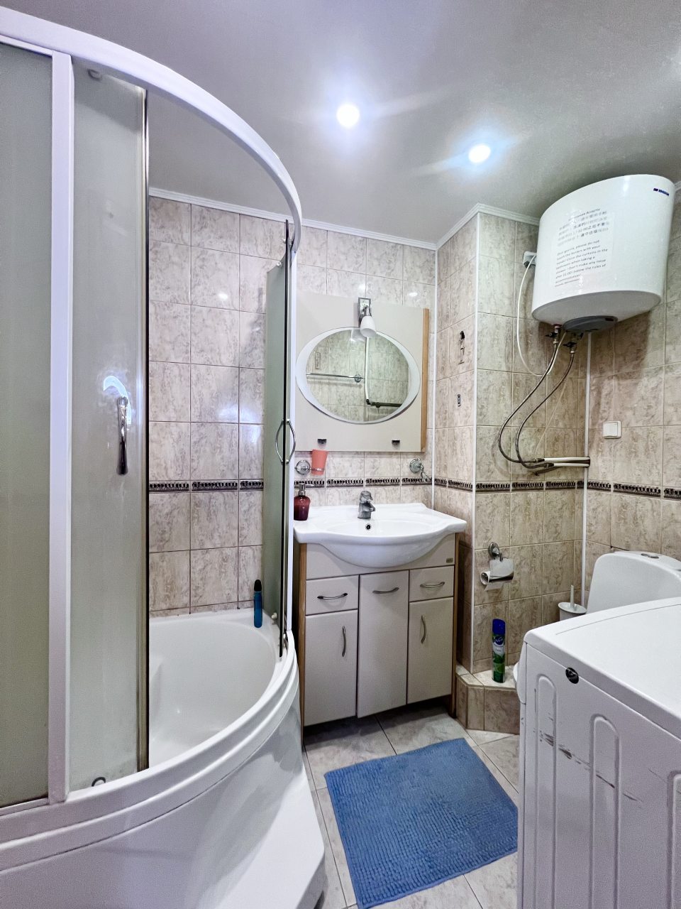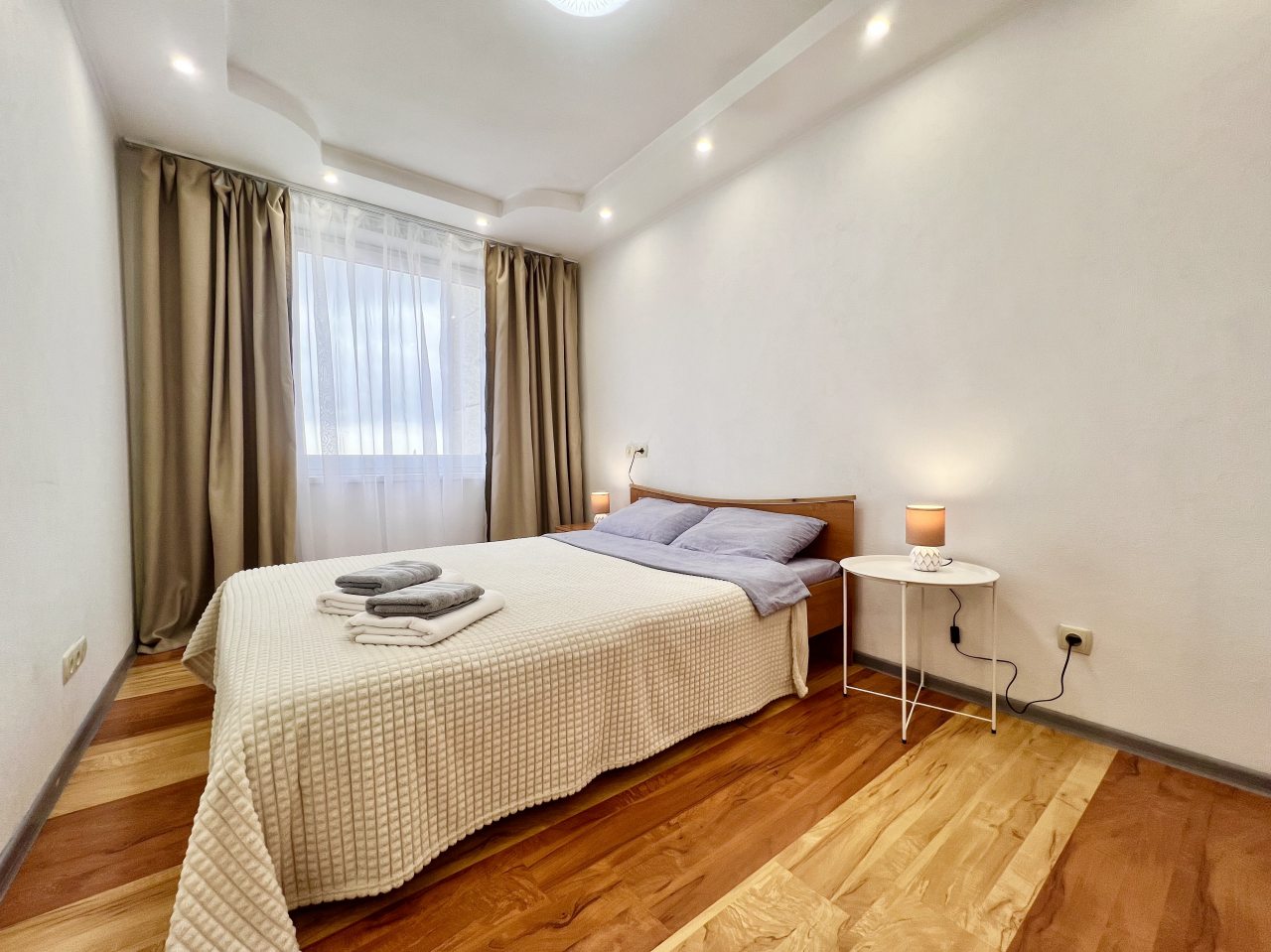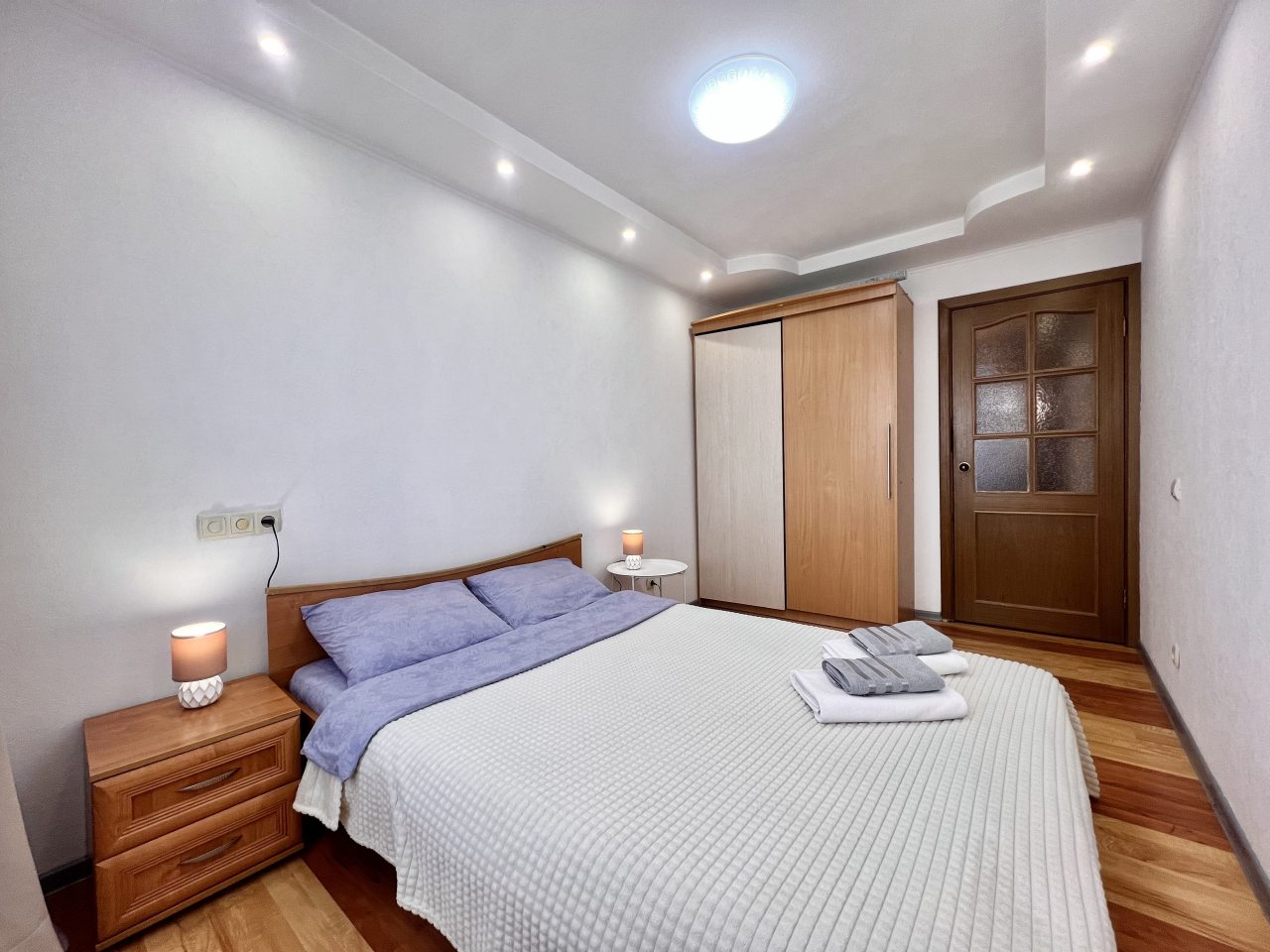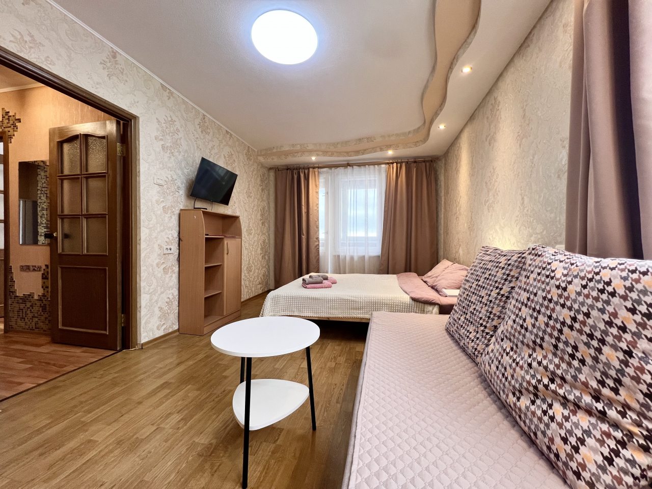 Апартаменты отлично подойдут для размещения семейной пары с детьми. Просторные комнаты оформлены в современном стиле интерьера и оснащены мебелью и техникой: двуспальные и односпальная кровати, мягкий диван, телевизор, вместительный шкаф для одежды. В санузле установлена душевая кабинка и есть средства гигиены.