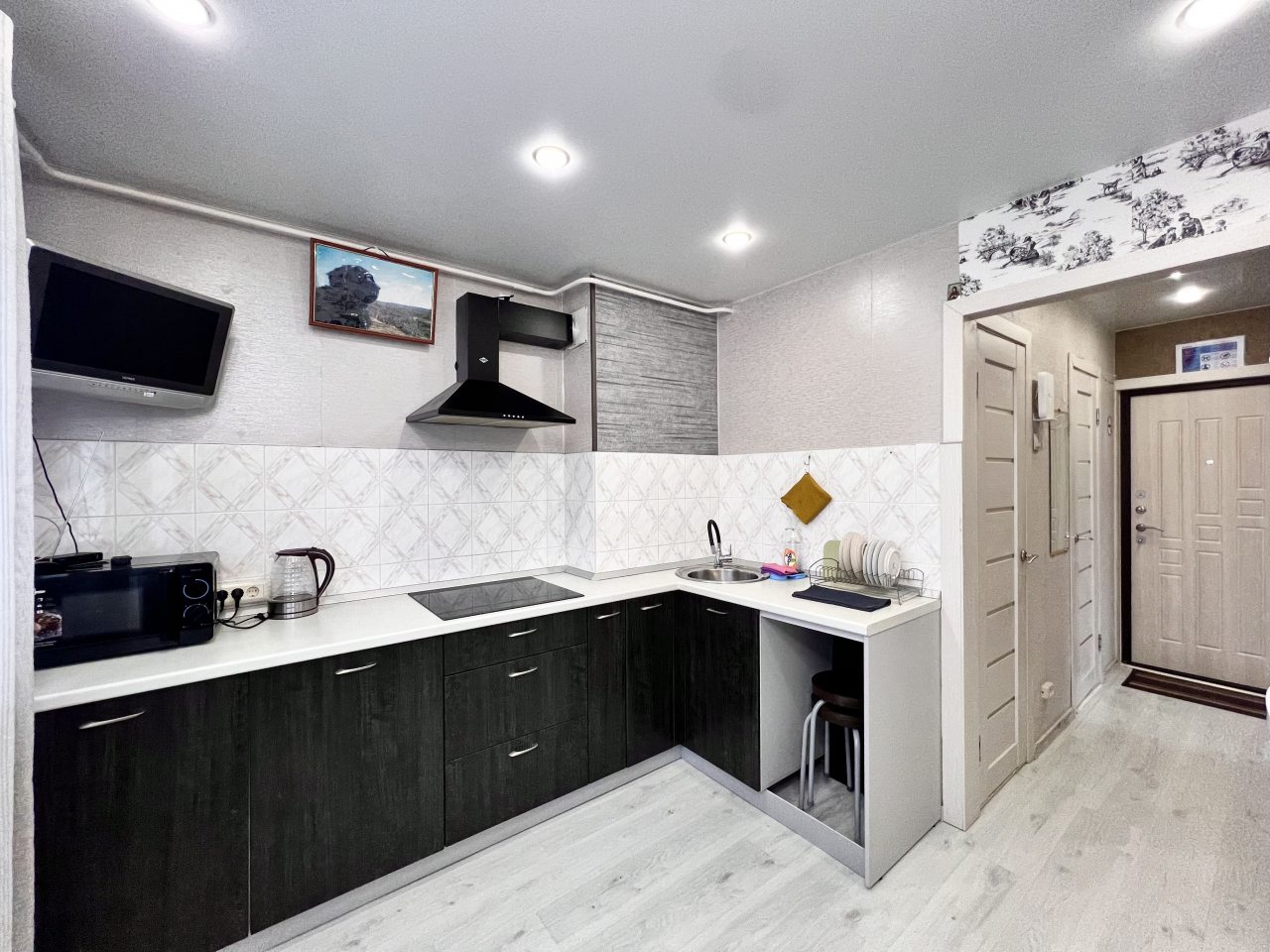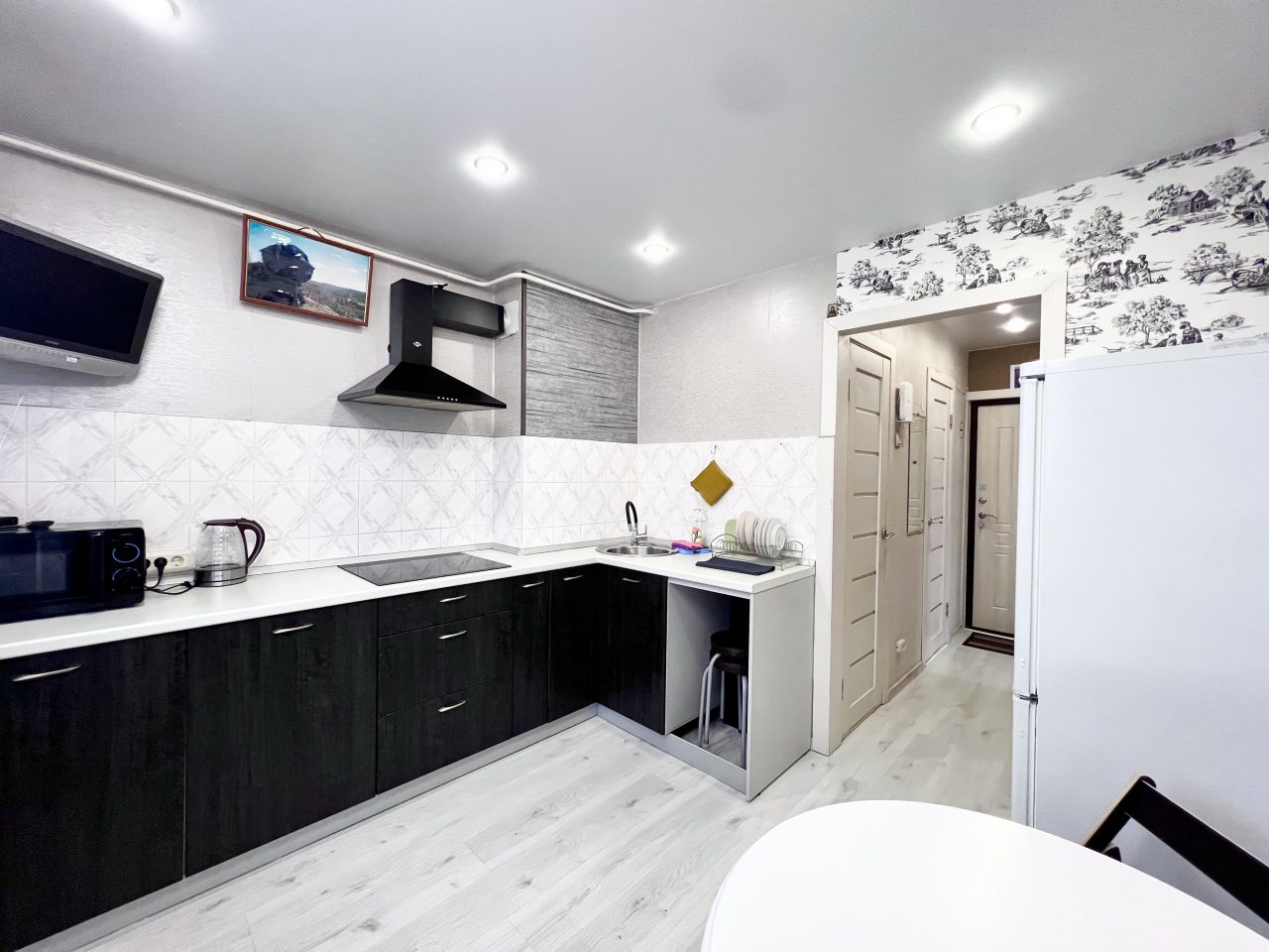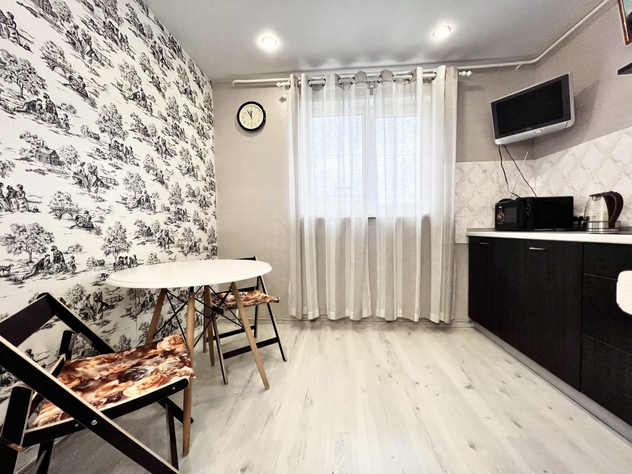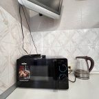 На кухне вы сможете готовить любимые домашние блюда и напитки, так как в наличии посуда, чайник, плита, СВЧ-печь, холодильник, уютная обеденная зона.