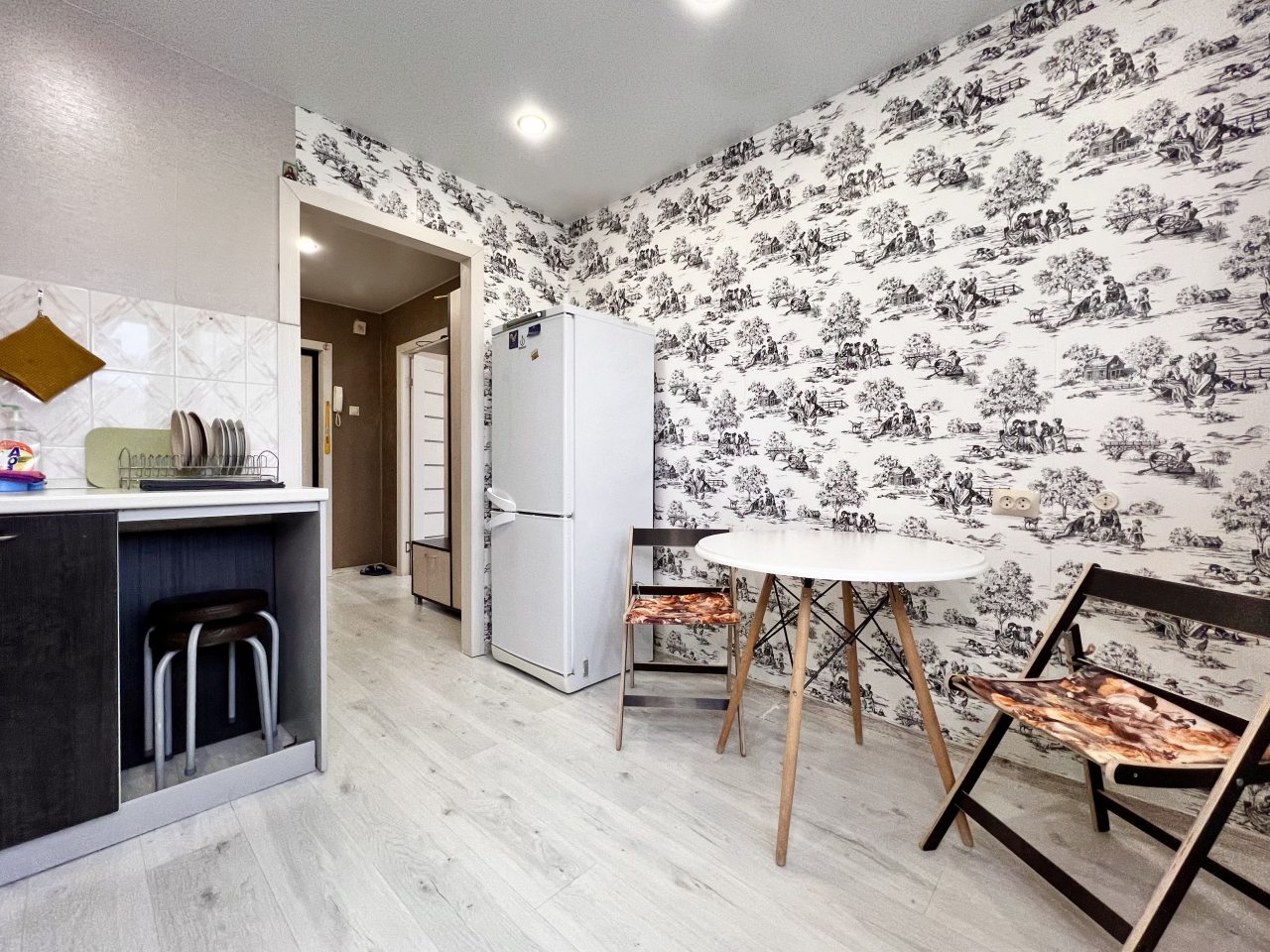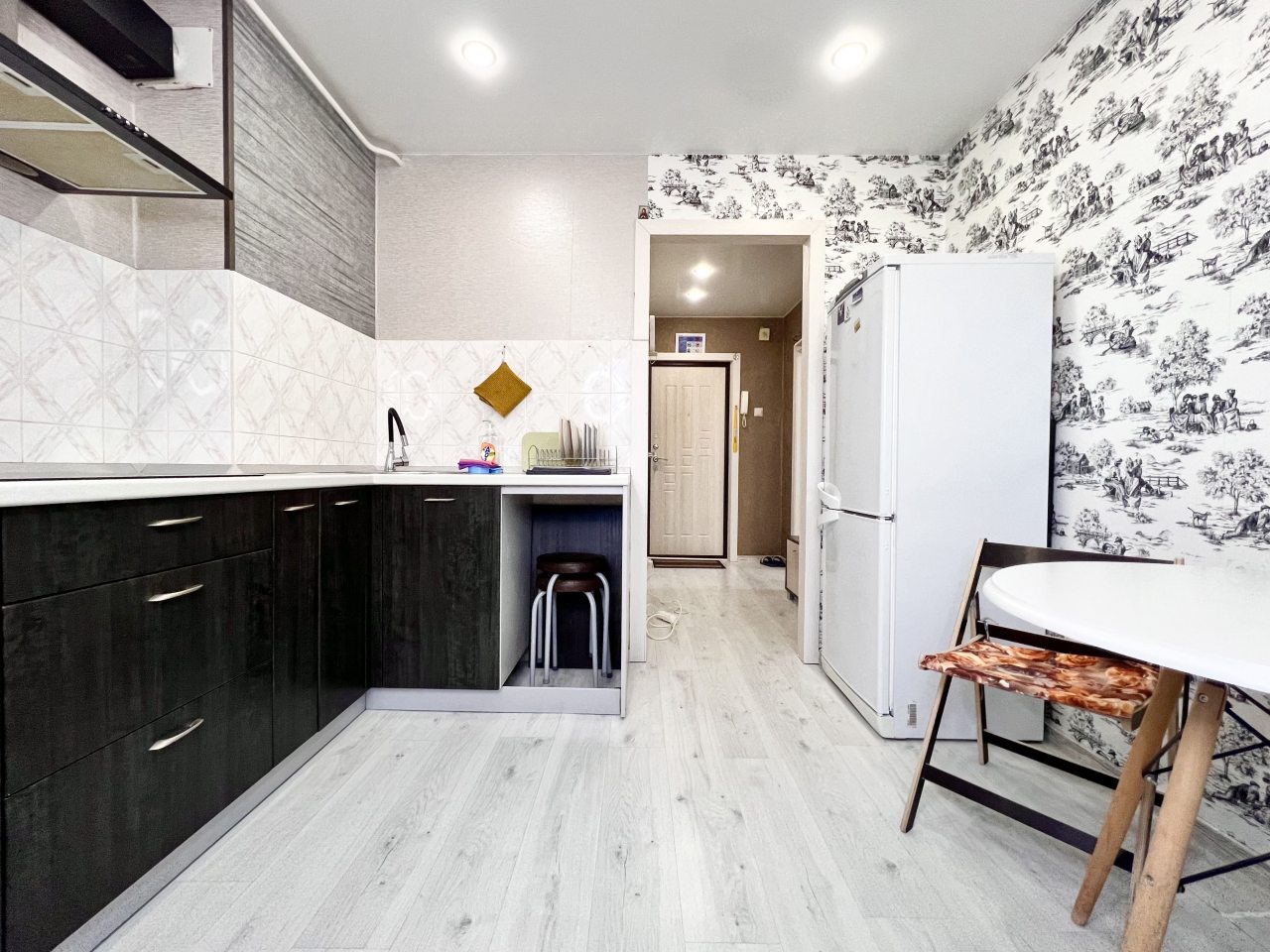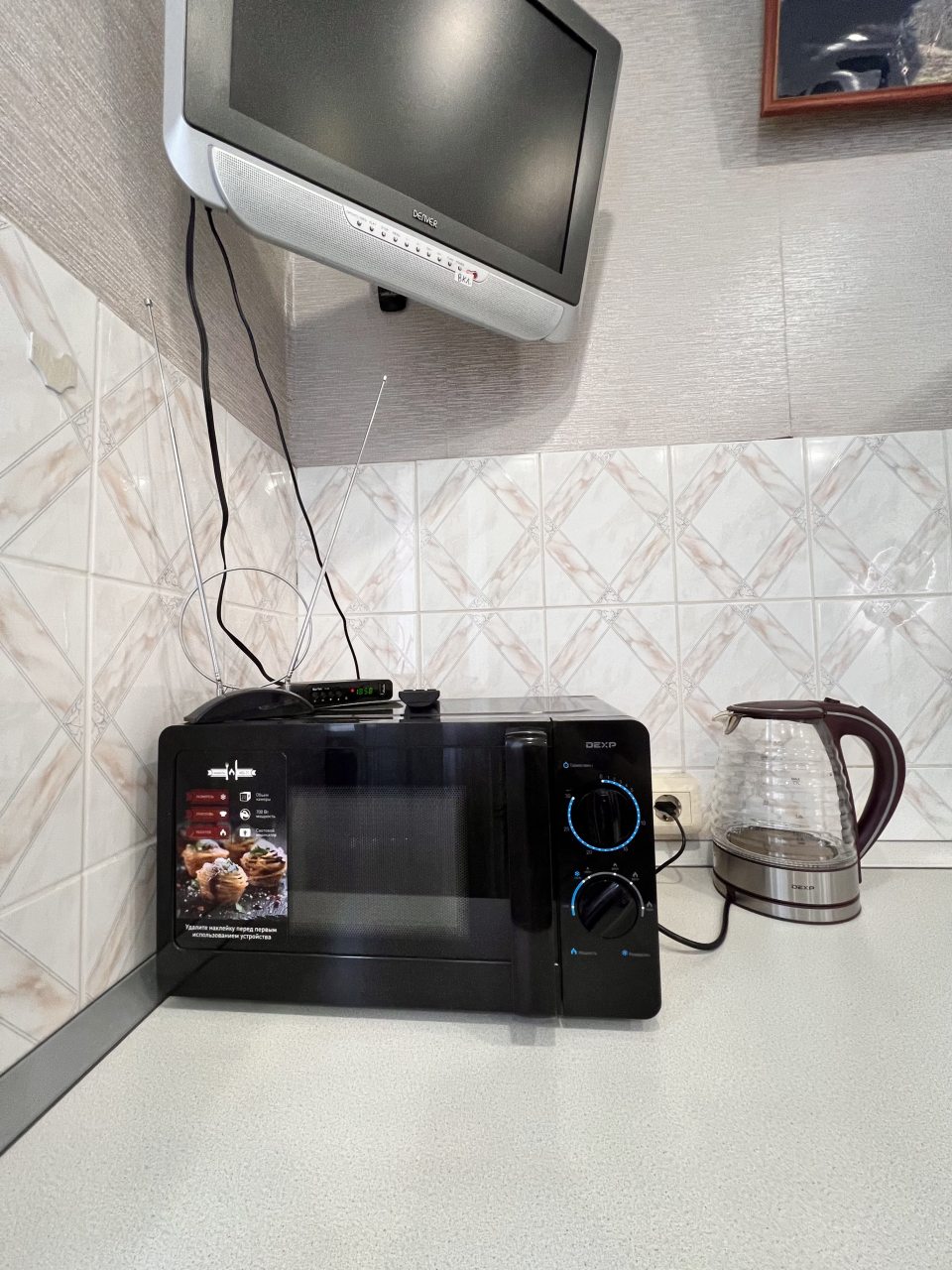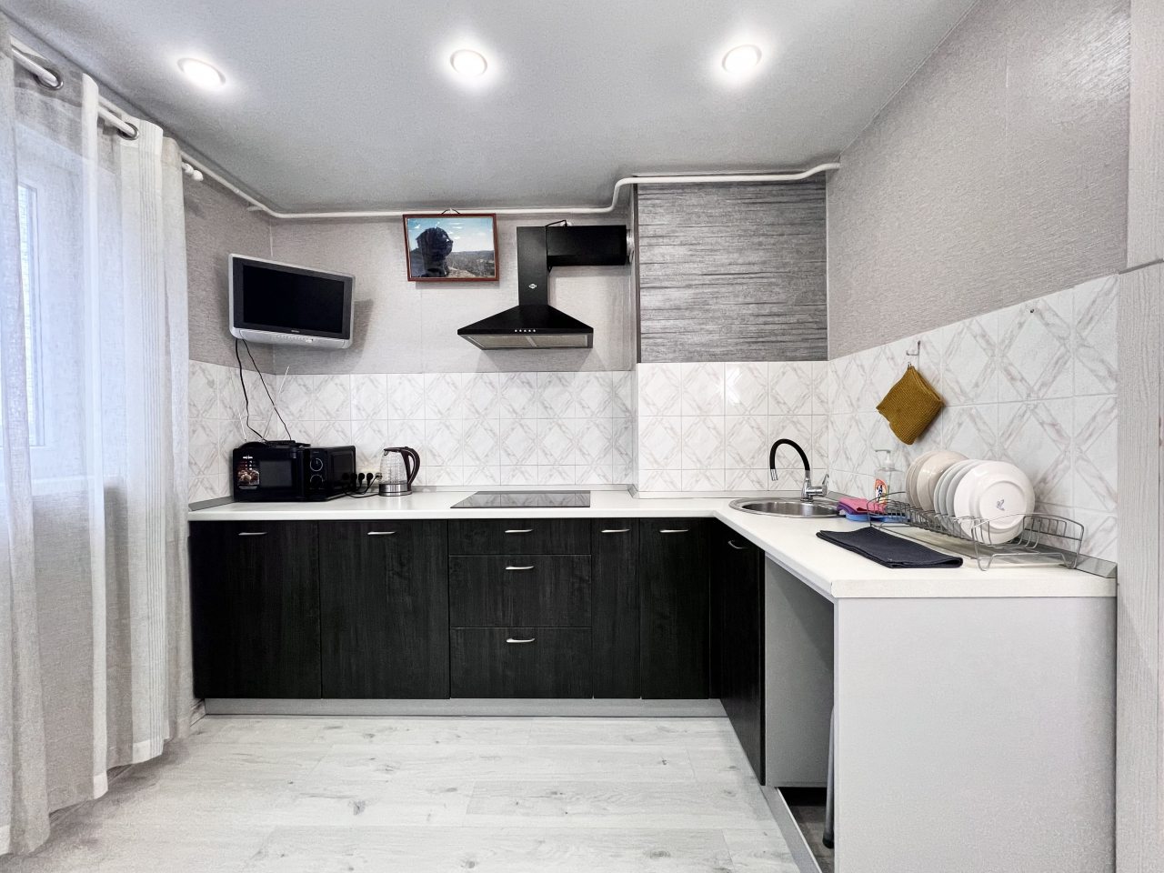 На кухне вы сможете готовить любимые домашние блюда и напитки, так как в наличии посуда, чайник, плита, СВЧ-печь, холодильник, уютная обеденная зона.