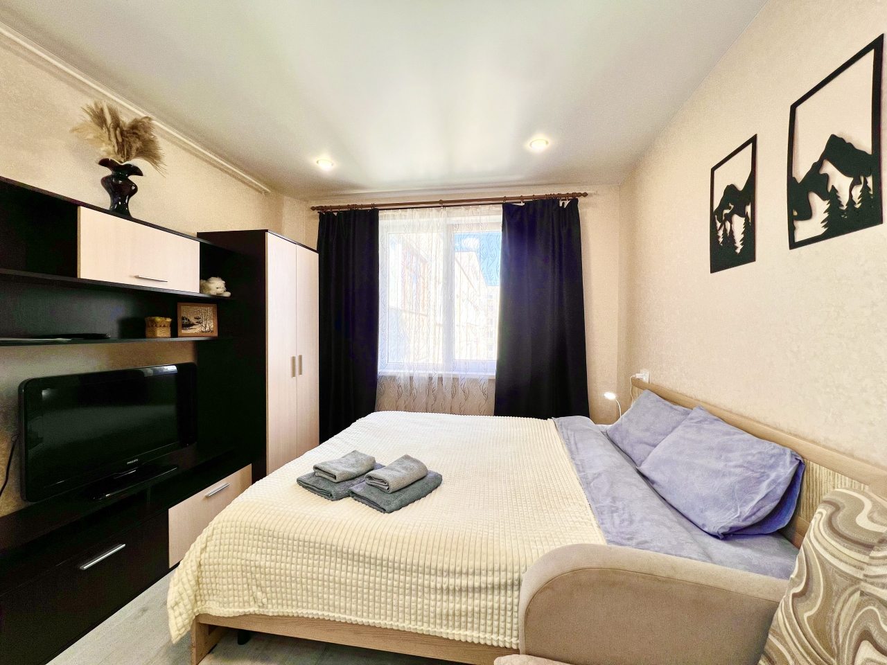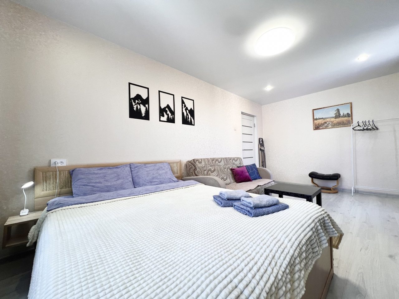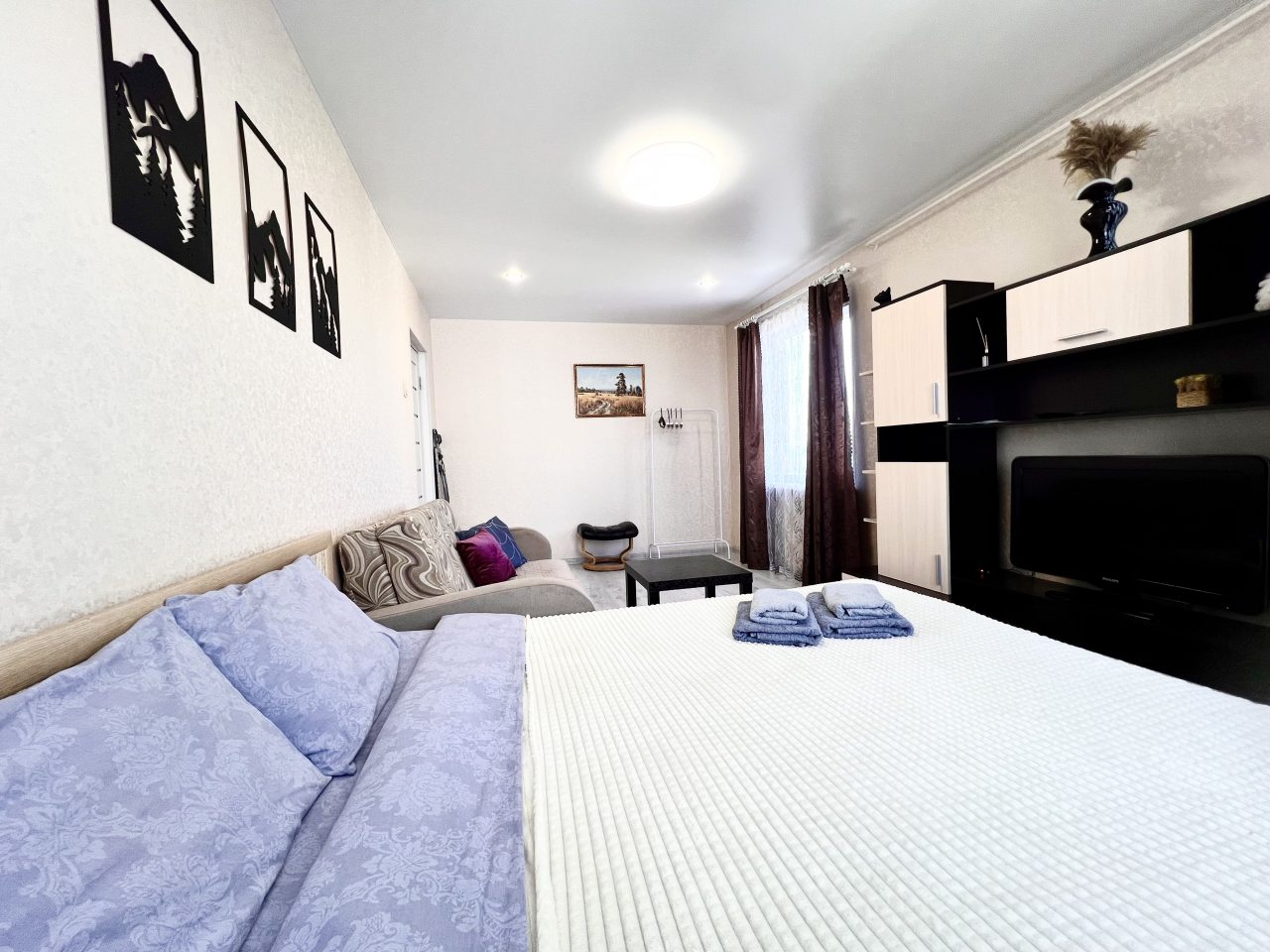 Внутри гостей ожидает качественная мебель и техника, включая кровать с удобным матрасом, мягкий диван, телевидение, прикроватную лампу, различные зоны для хранения вещей, полноценную ванну и стиральную машину.
