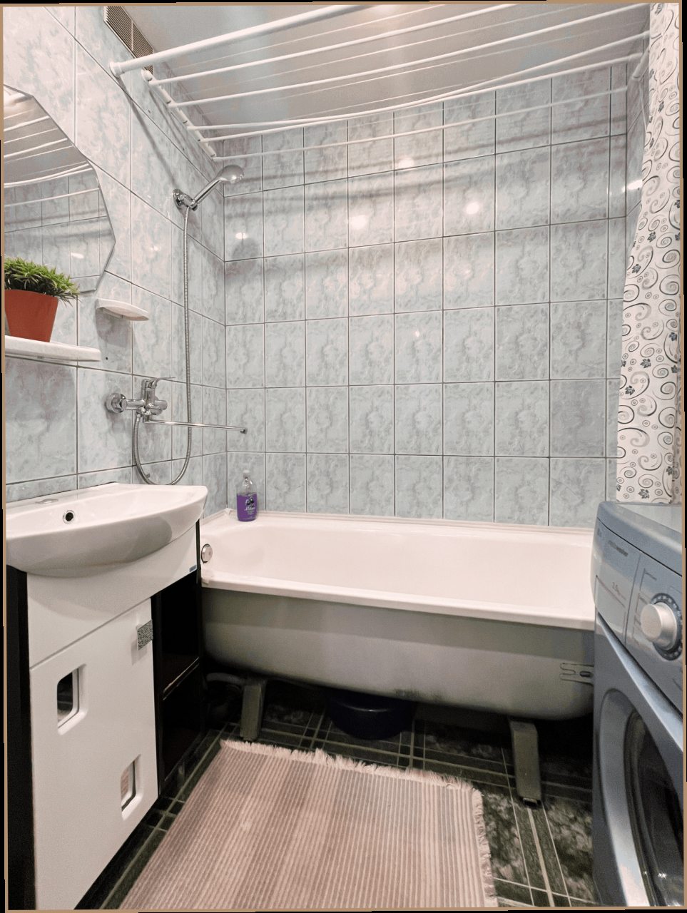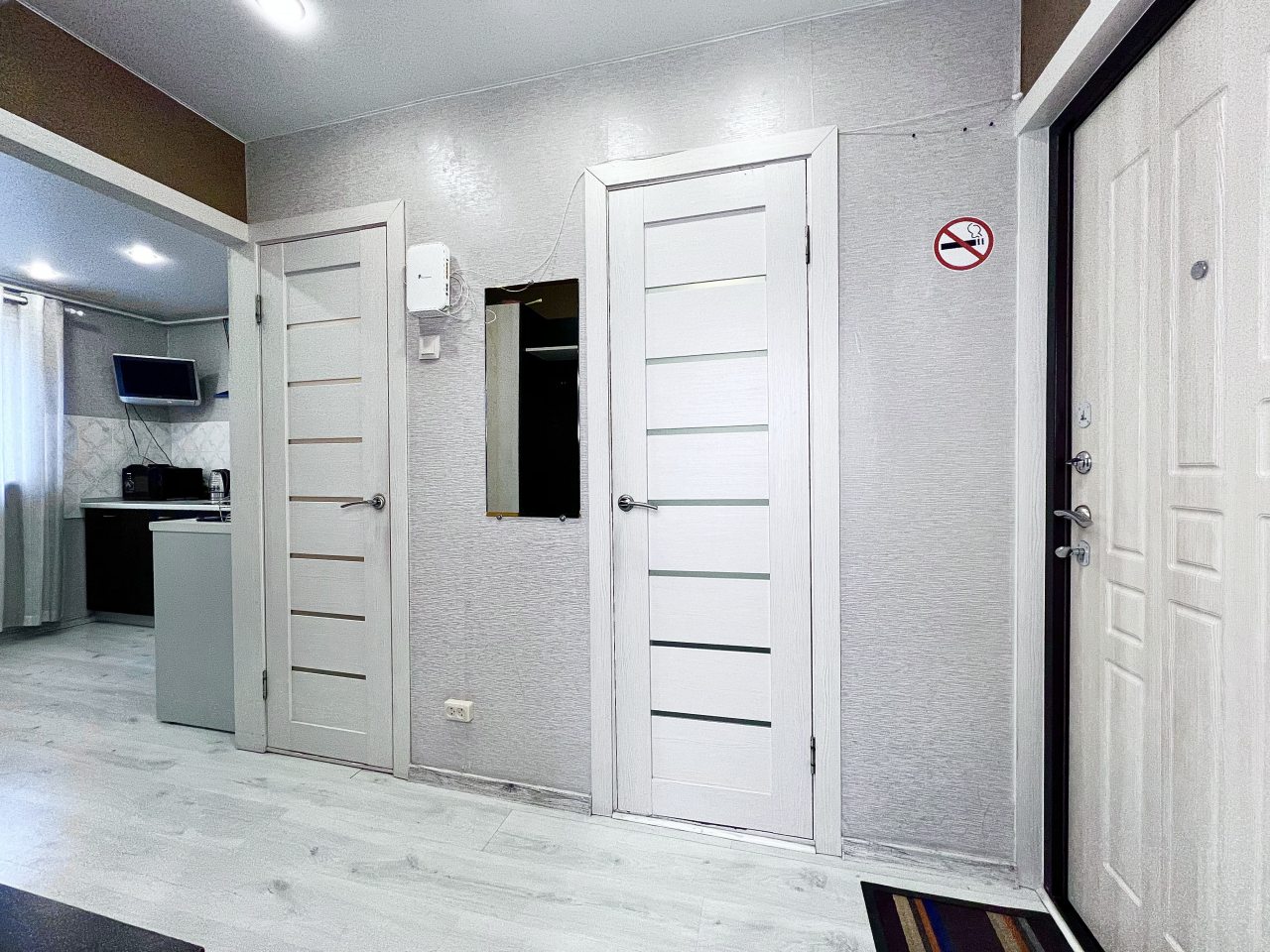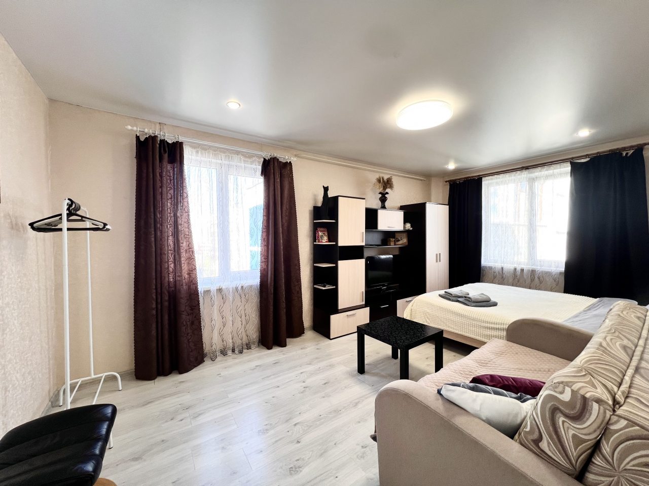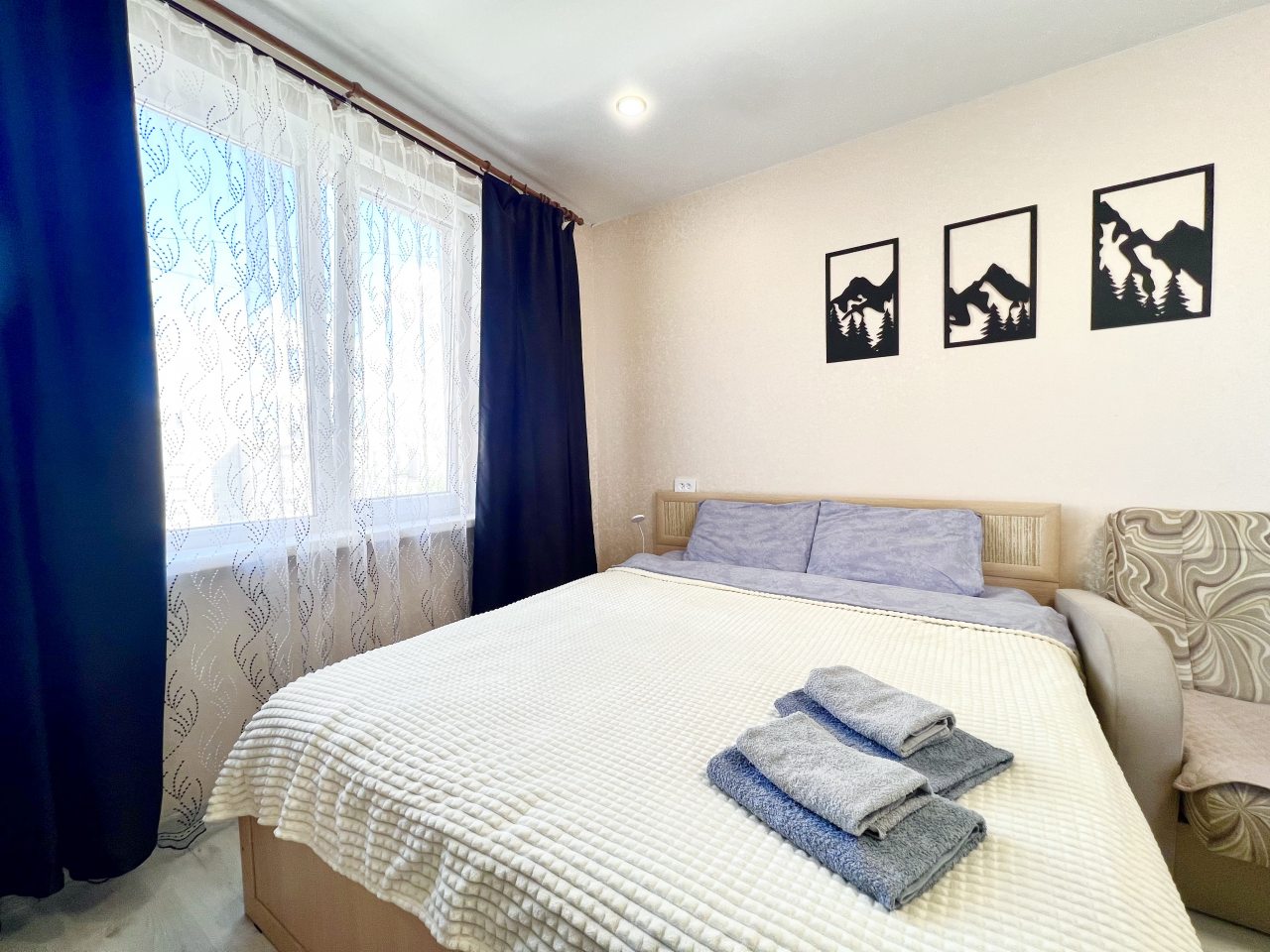 Внутри гостей ожидает качественная мебель и техника, включая кровать с удобным матрасом, мягкий диван, телевидение, прикроватную лампу, различные зоны для хранения вещей, полноценную ванну и стиральную машину.