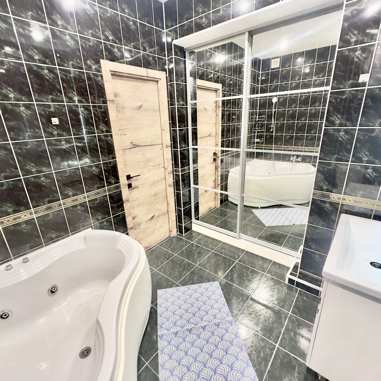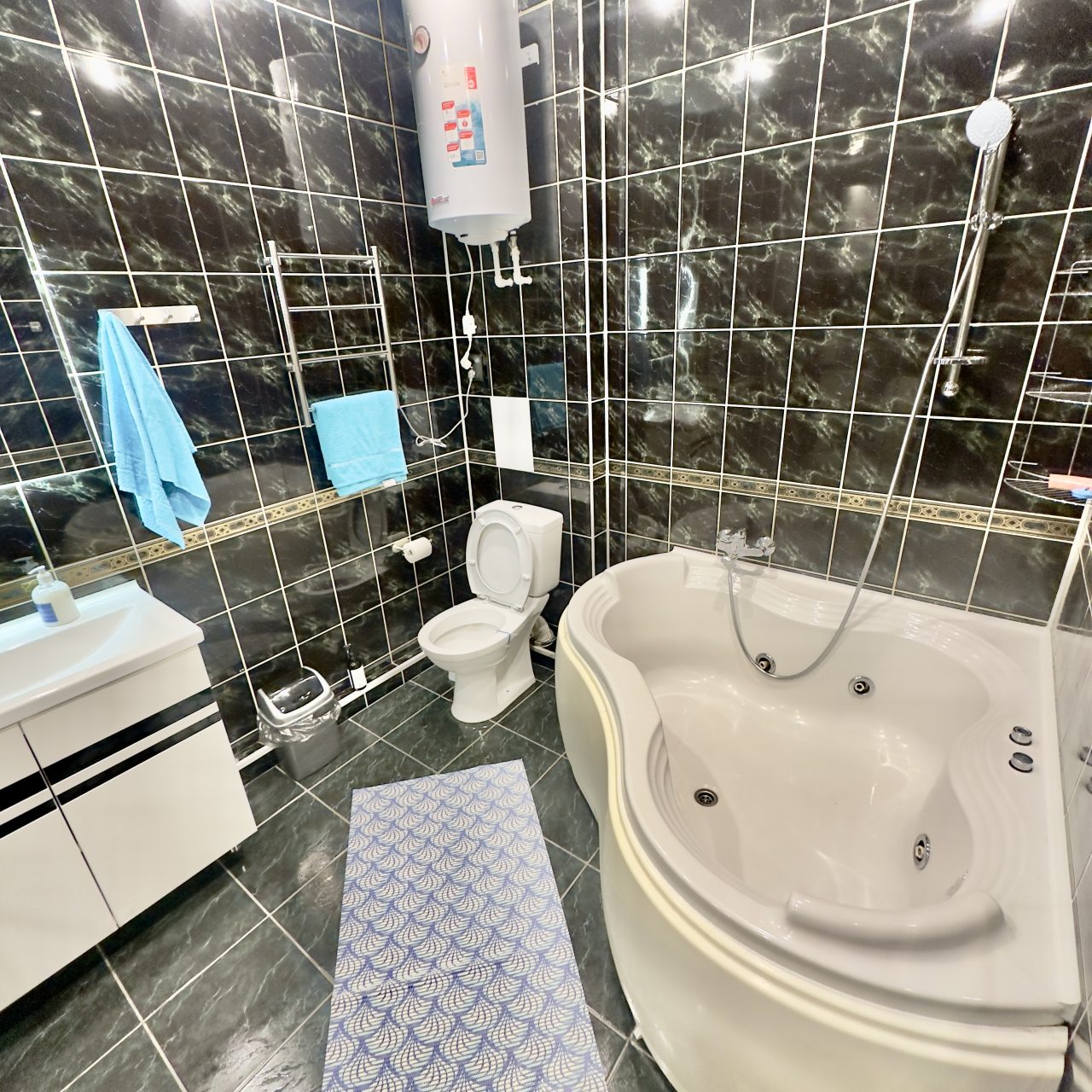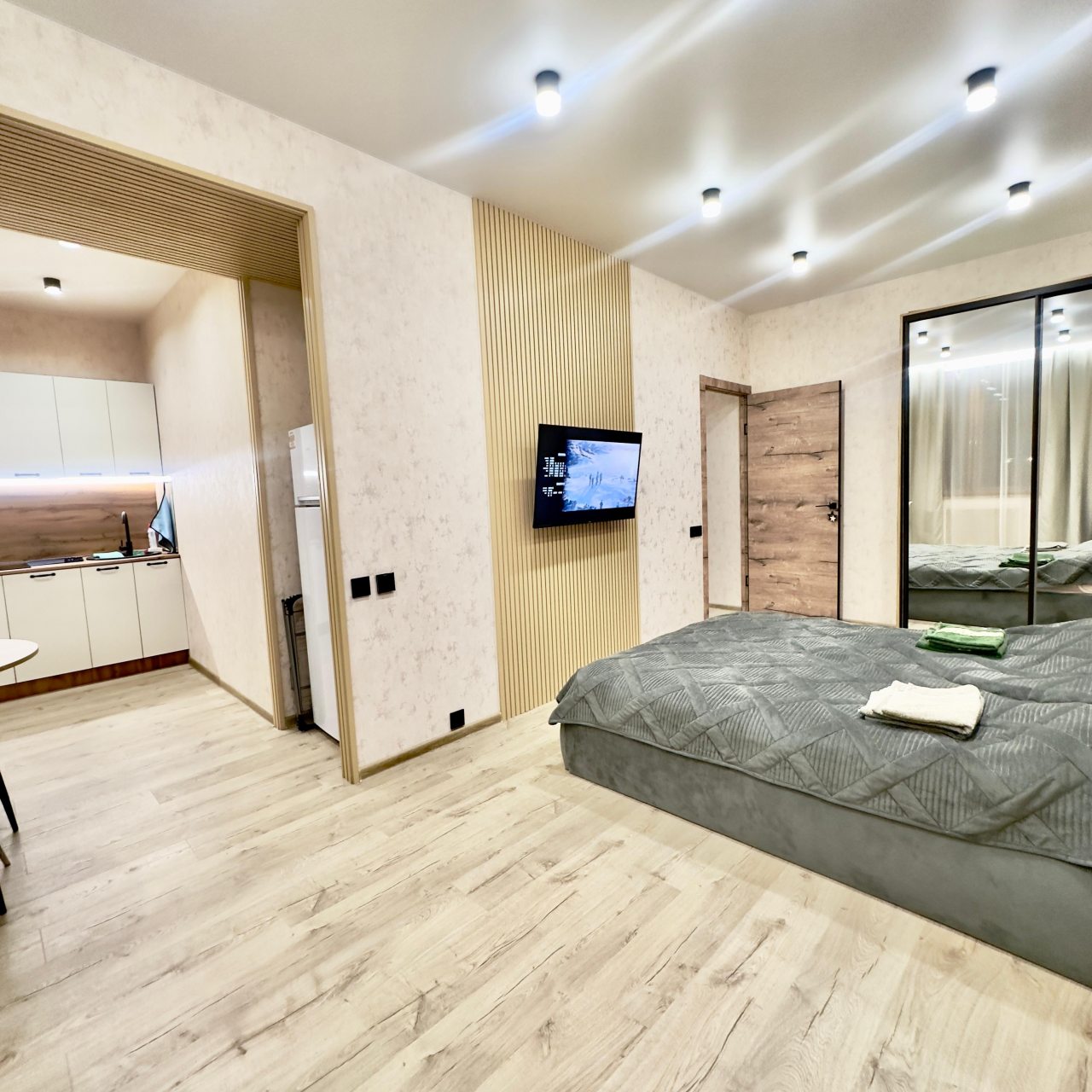 В светлой и просторной квартире есть шкаф-купе, телевизор, двуспальная кровать, в отдельной ванной комнате: туалет, ванная с гидромассажем, раковина.