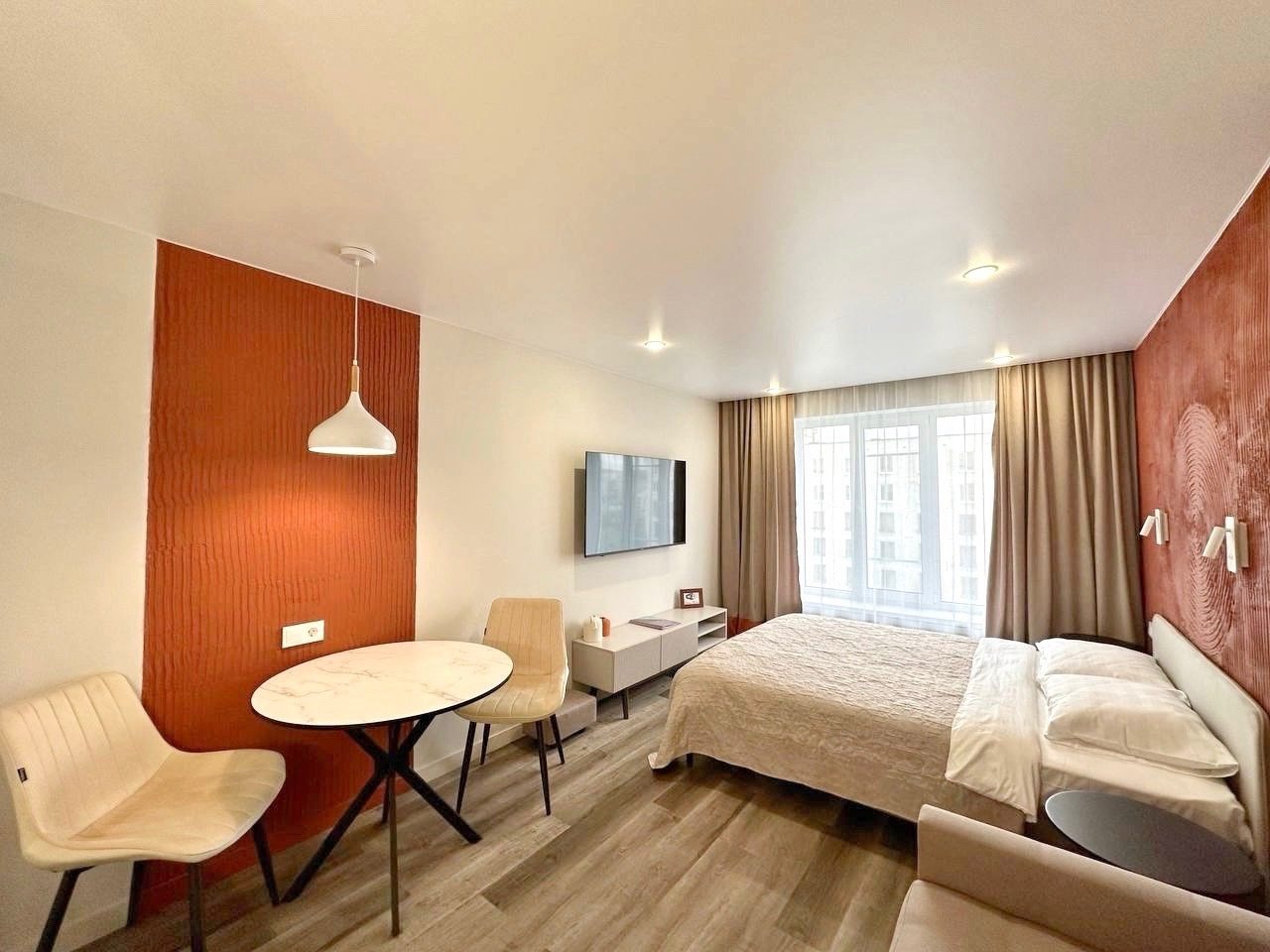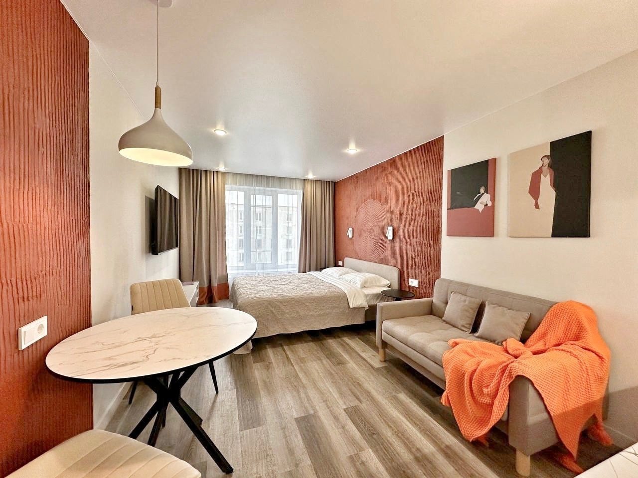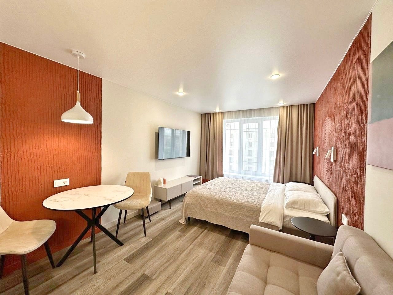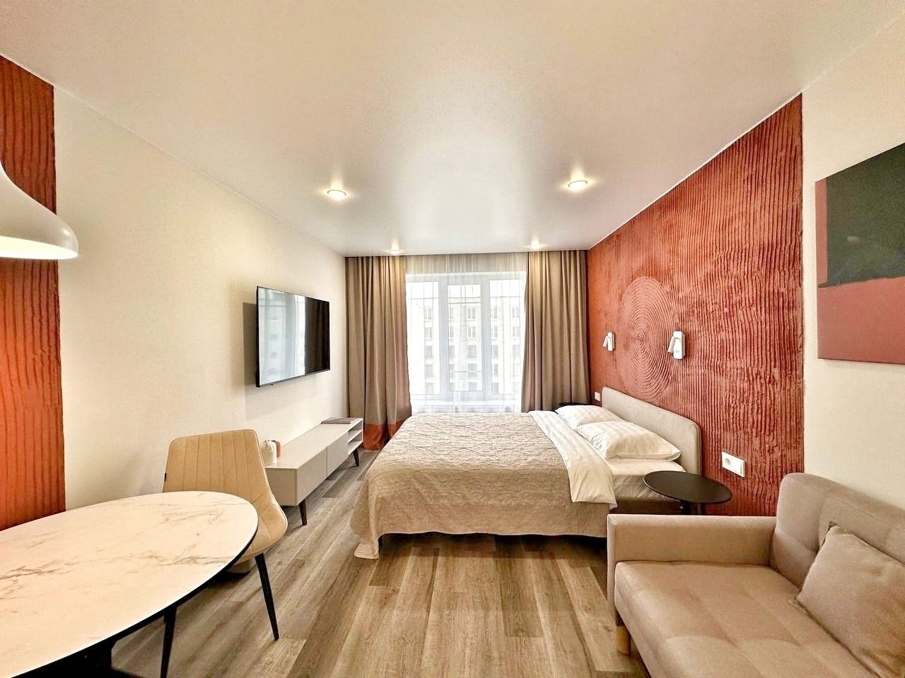 Квартира выполнена в современном стиле и предлагает всё необходимое для проживания. Просторная комната оборудована удобной кроватью, диваном и телевизором. В квартире имеется современная техника и высокоскоростной интернет.