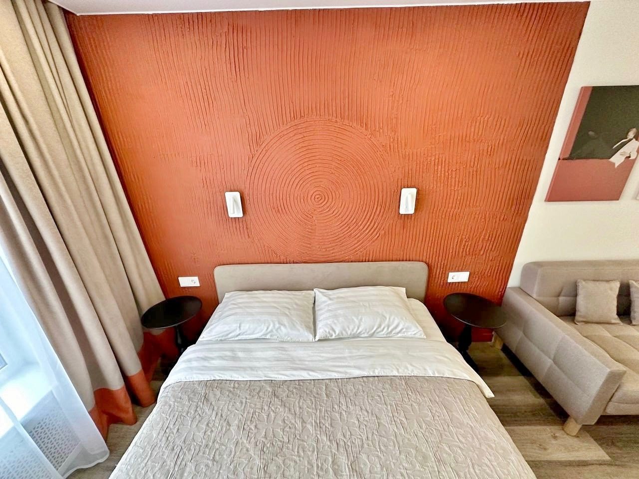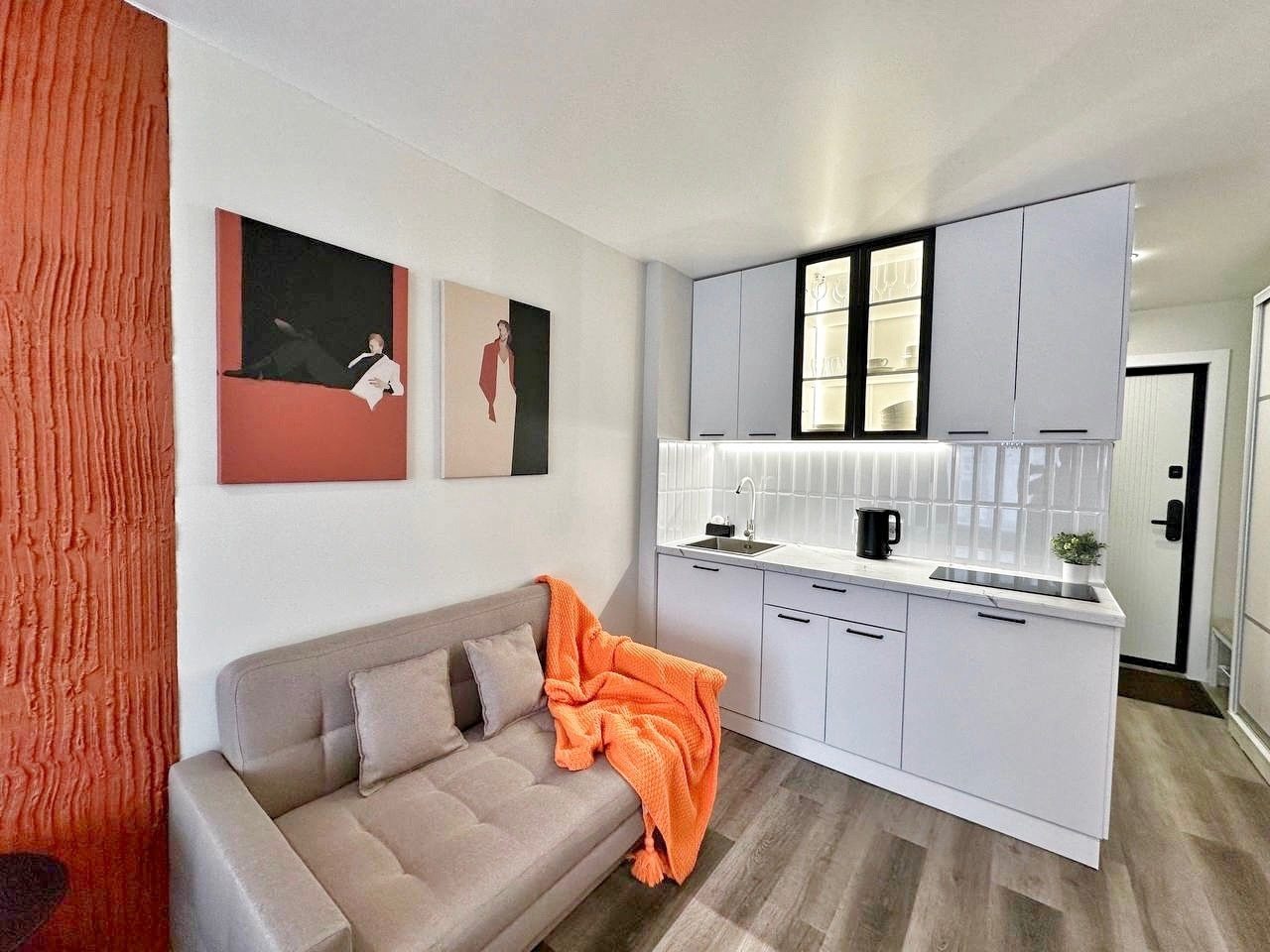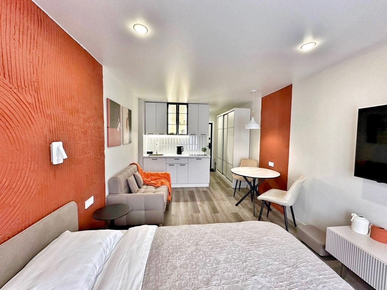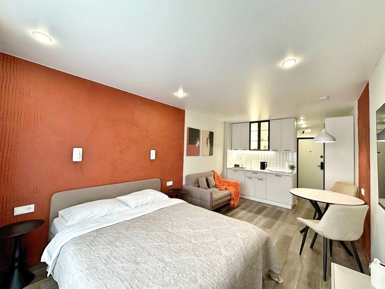 Квартира выполнена в современном стиле и предлагает всё необходимое для проживания. Просторная комната оборудована удобной кроватью, диваном и телевизором. В квартире имеется современная техника и высокоскоростной интернет.