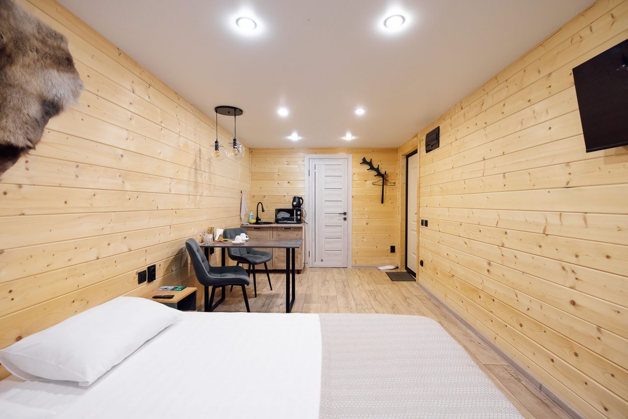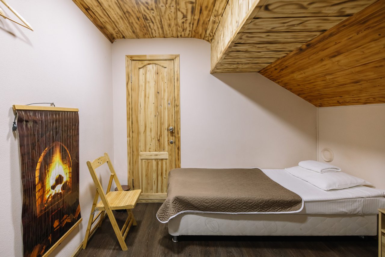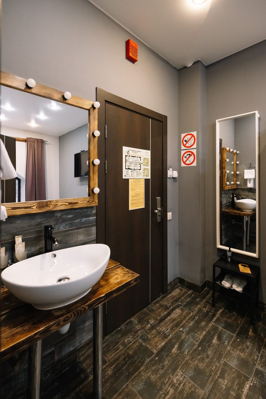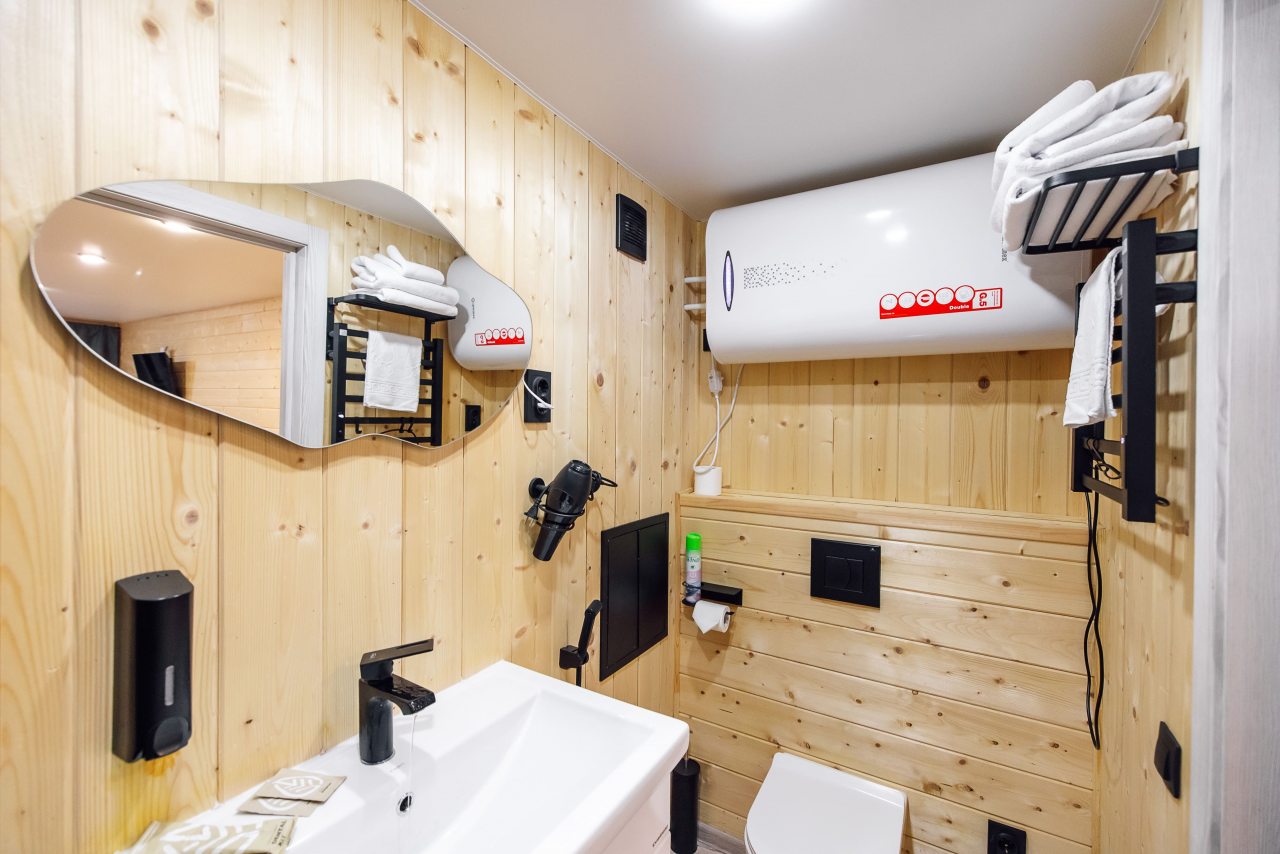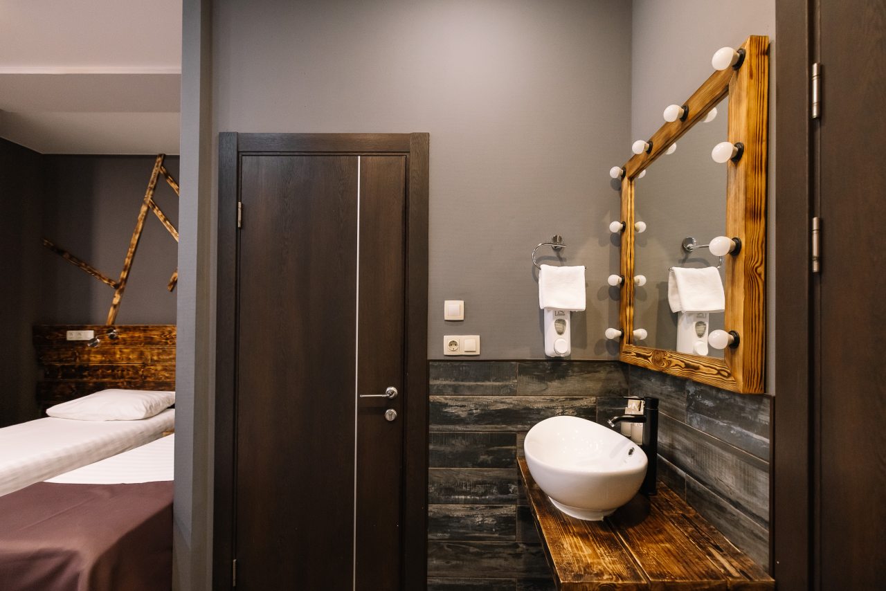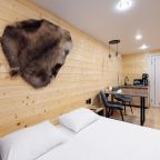 У нас номер Комфорт. Номер хороший, удобная кровать и эргономика соблюдена. Санузел чистый. Отель преимущественно оформлен в дереве, экологически чистый. Считаю это хорошим выбором для тех, кому нужен ночлег в Мурманске.