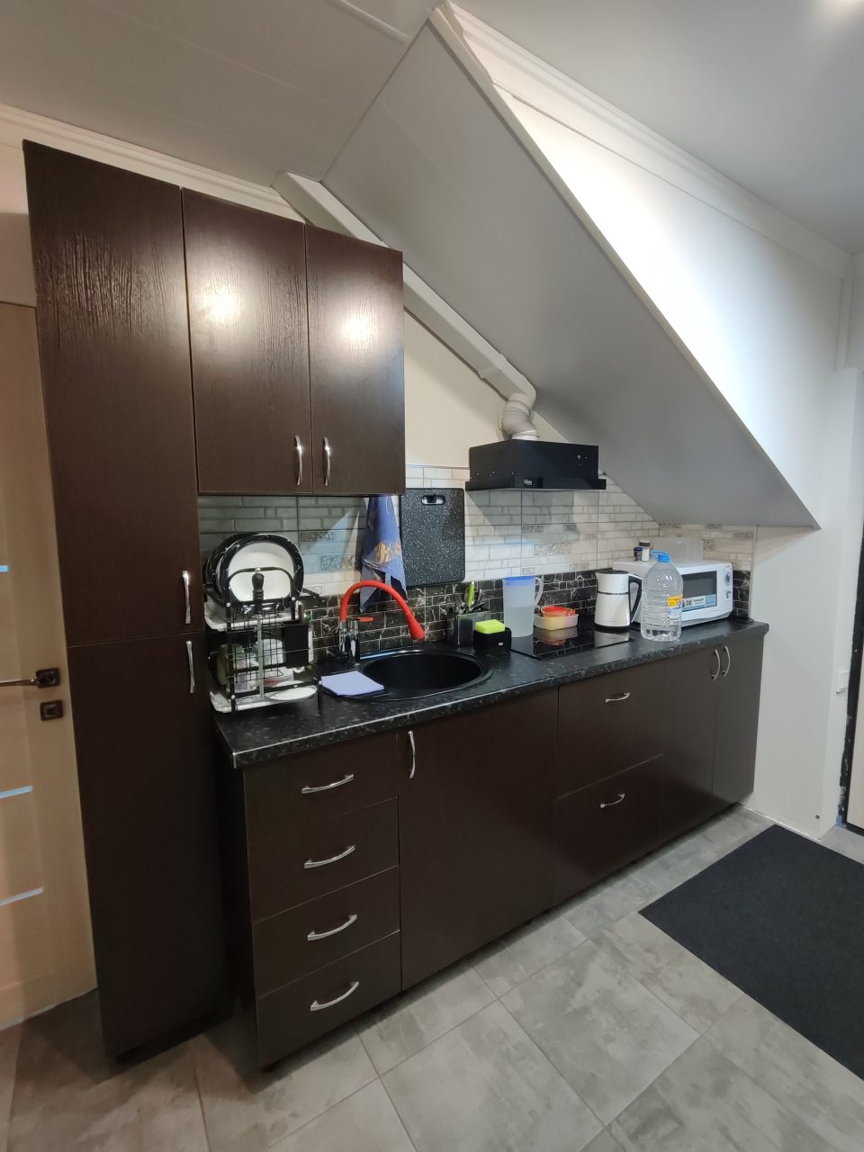 Кухонная зона оснащена гарнитуром и комплектом бытовой техники, такой как: микроволновая печь, электрочайник, холодильник и др. Пообедать можно в ближайшем кафе.