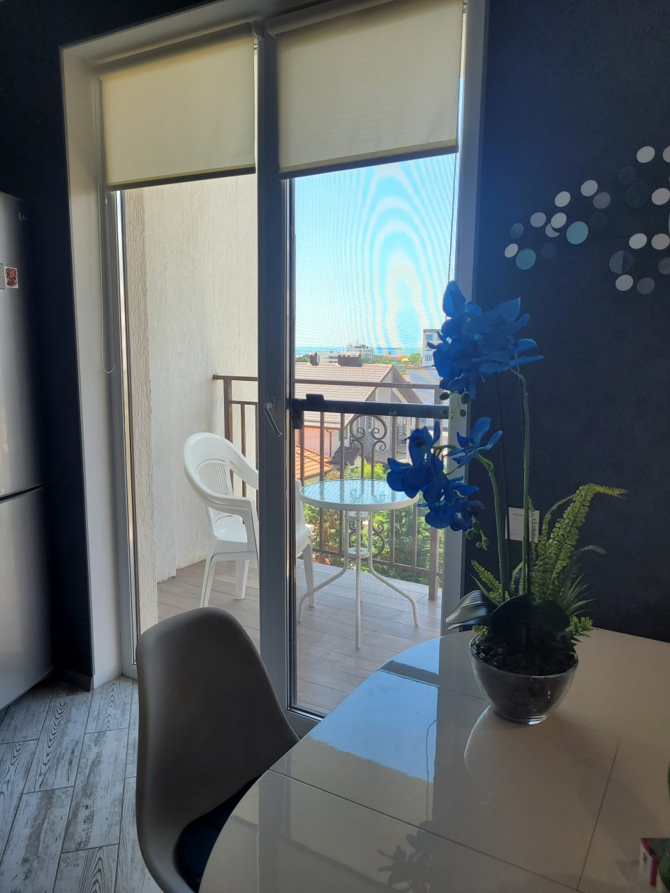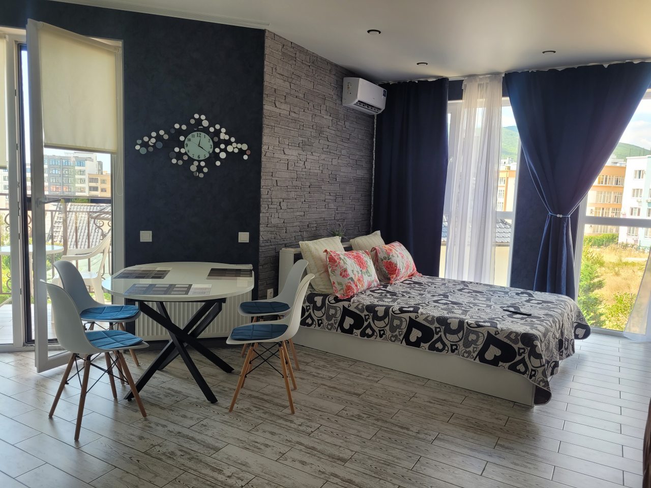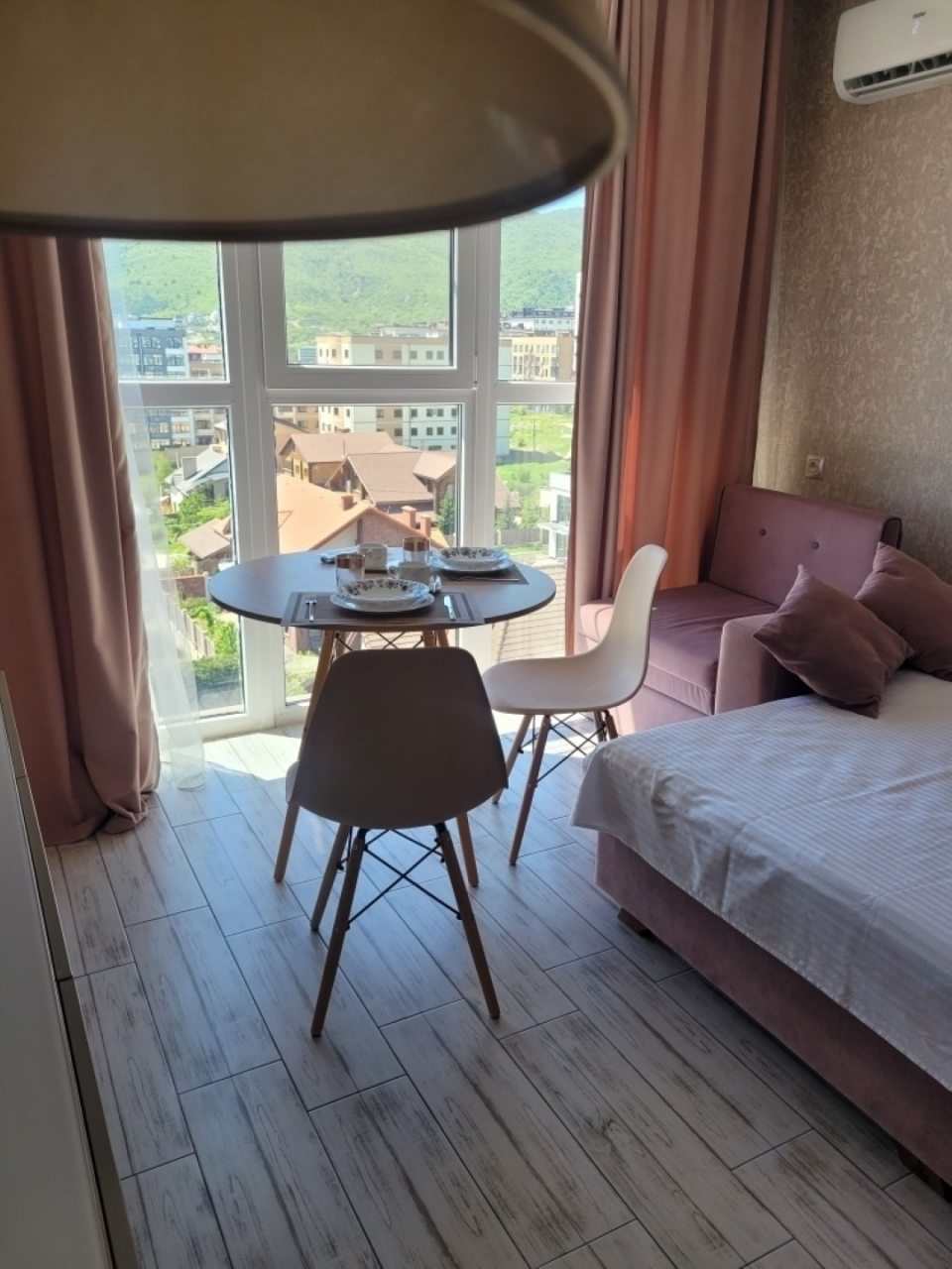 Стильная студия с панорамными окнами обустроена удобными спальными местами, кондиционером, стиральной машиной, телевизором, Wi-Fi. С балкона открывается красивый вид на море.
