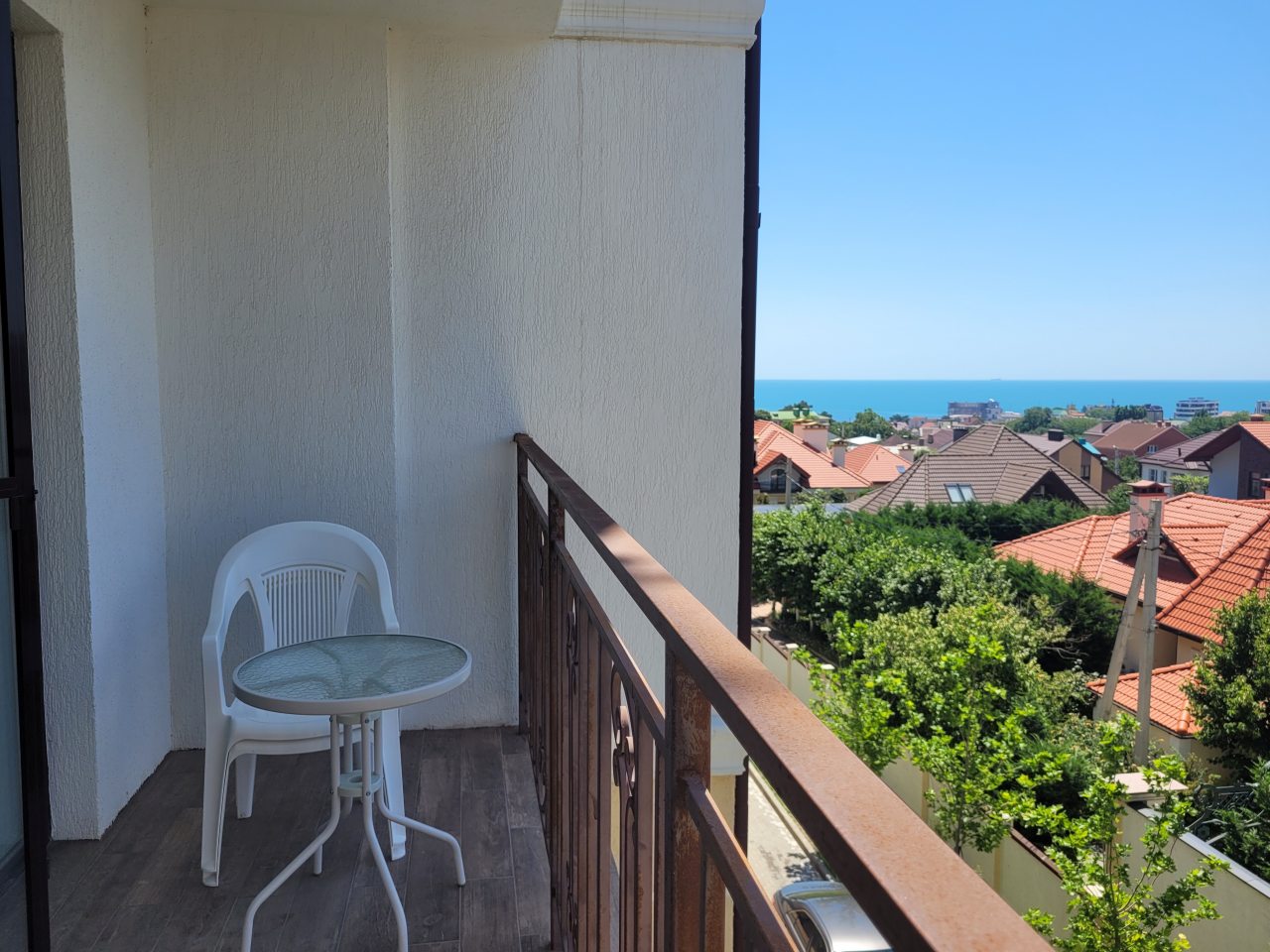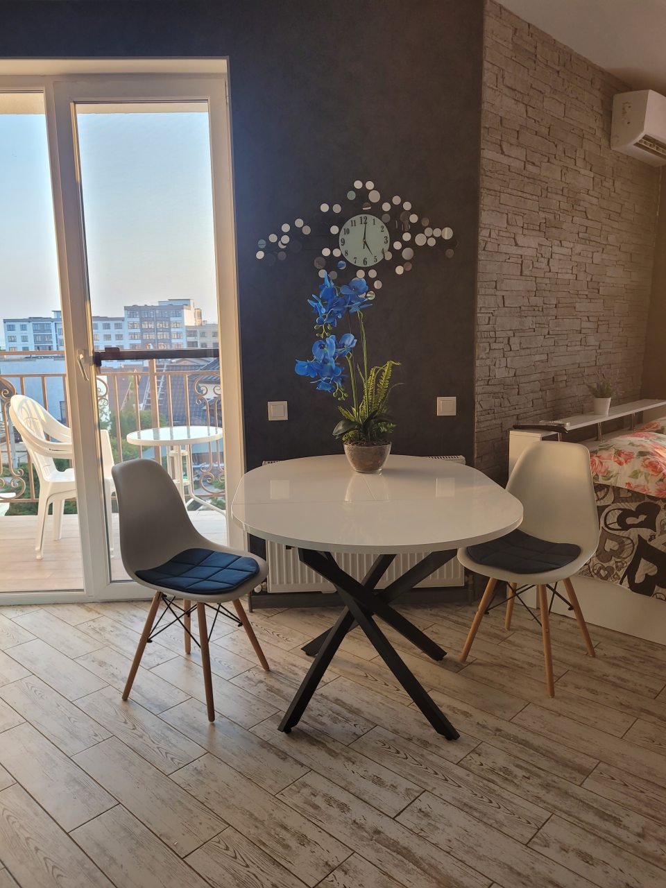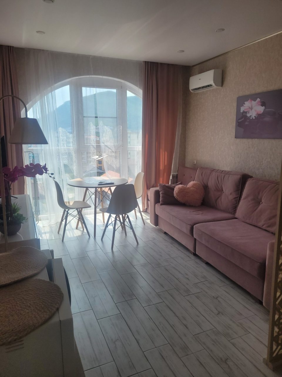 Стильная студия с панорамными окнами обустроена удобными спальными местами, кондиционером, стиральной машиной, телевизором, Wi-Fi. С балкона открывается красивый вид на море.