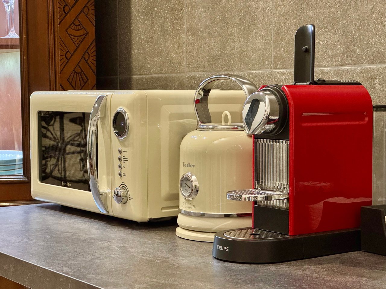 Набор столовых приборов и посуды, разделочные доски, штопор, чайник, микроволновая печь, мини-холодильник.