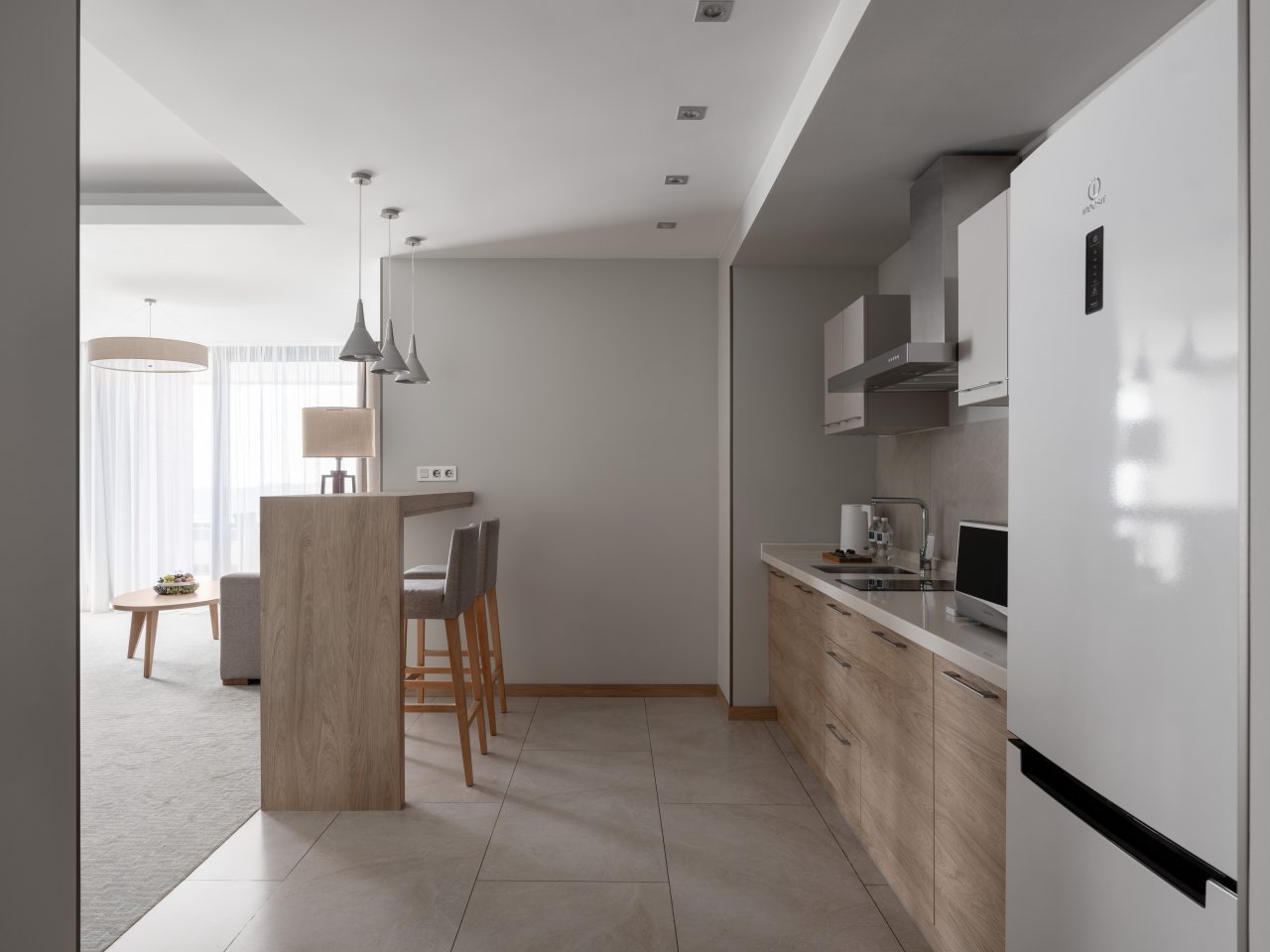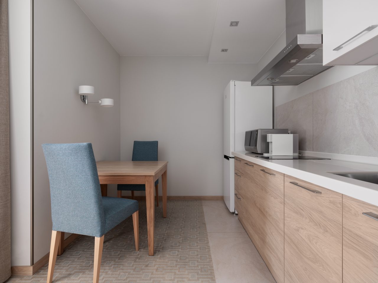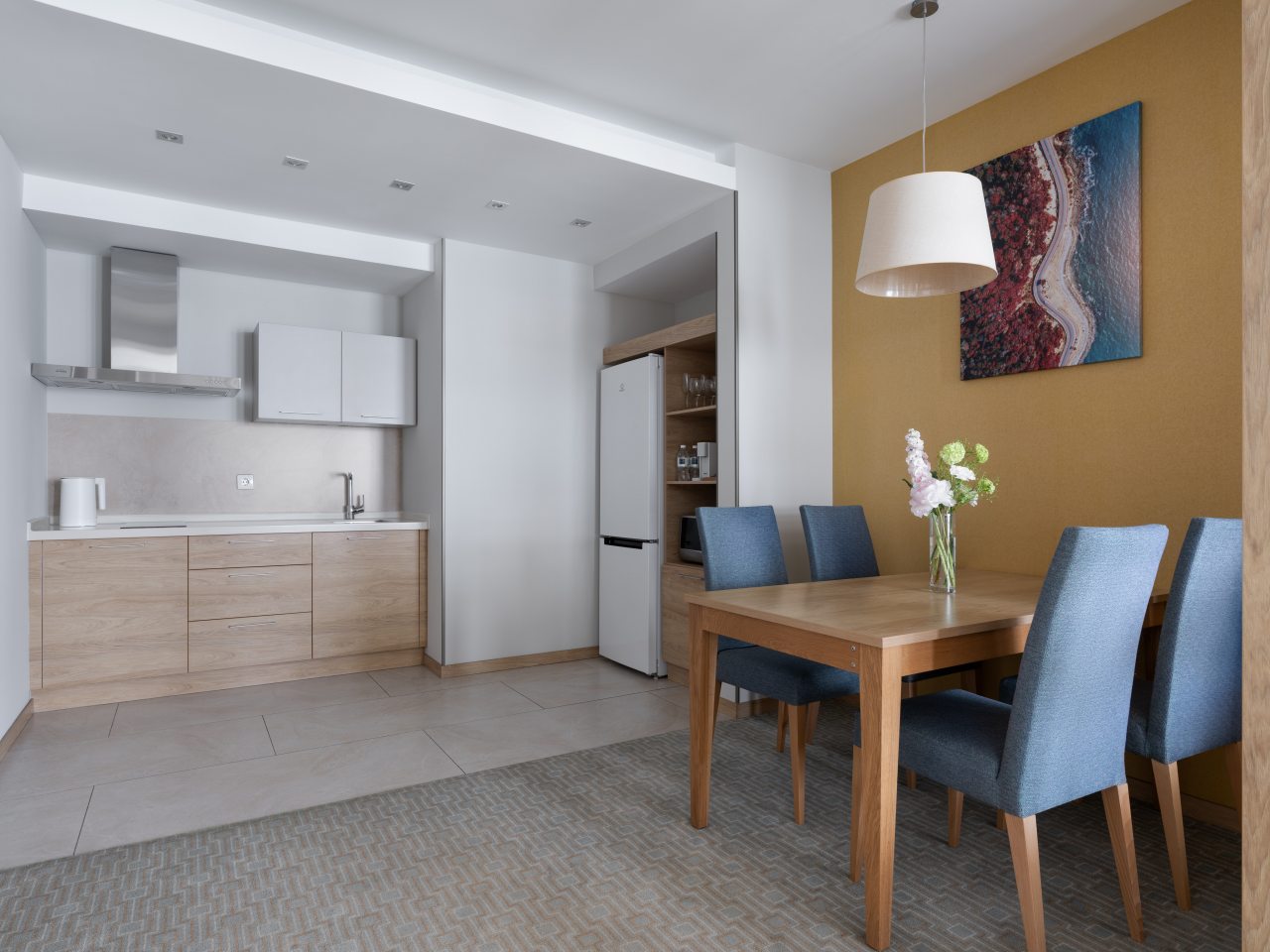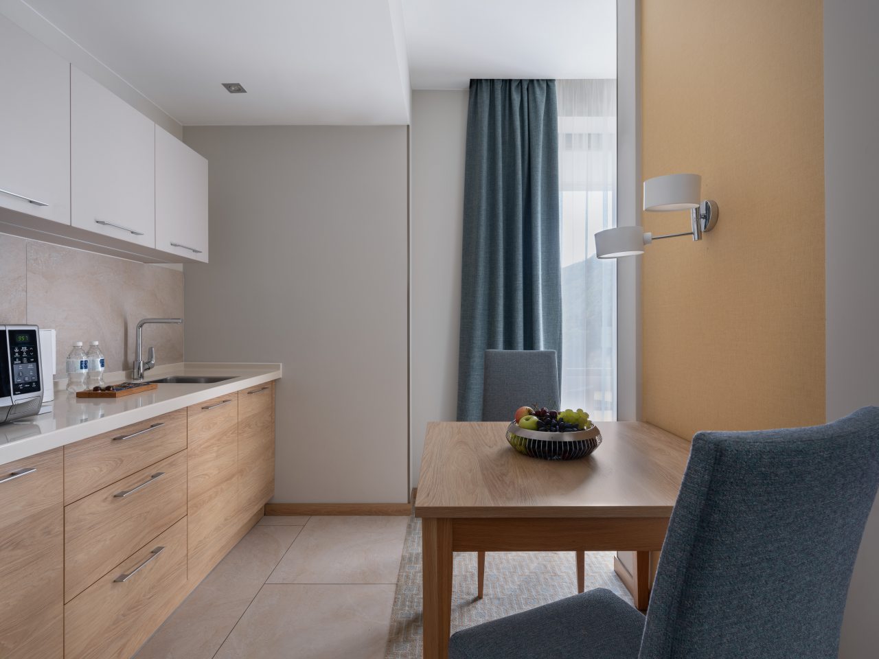 Для дополнительного комфорта в номерах предусмотрена кухонная зона с чайником, холодильником, СВЧ. А в ресторане при апарт-отеле вы сможете попробовать изысканные напитки и блюда.
