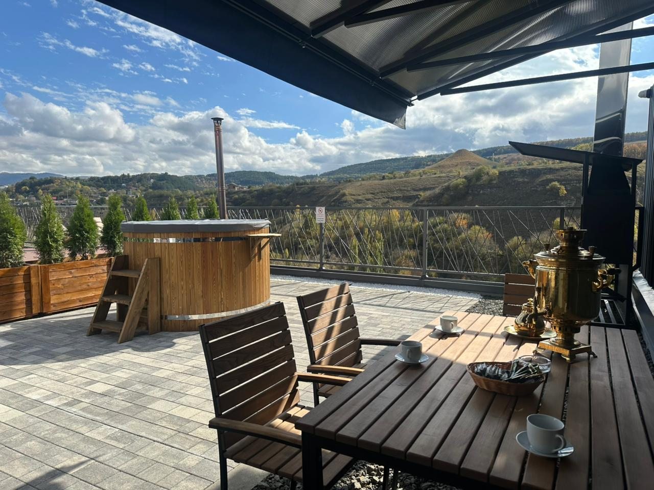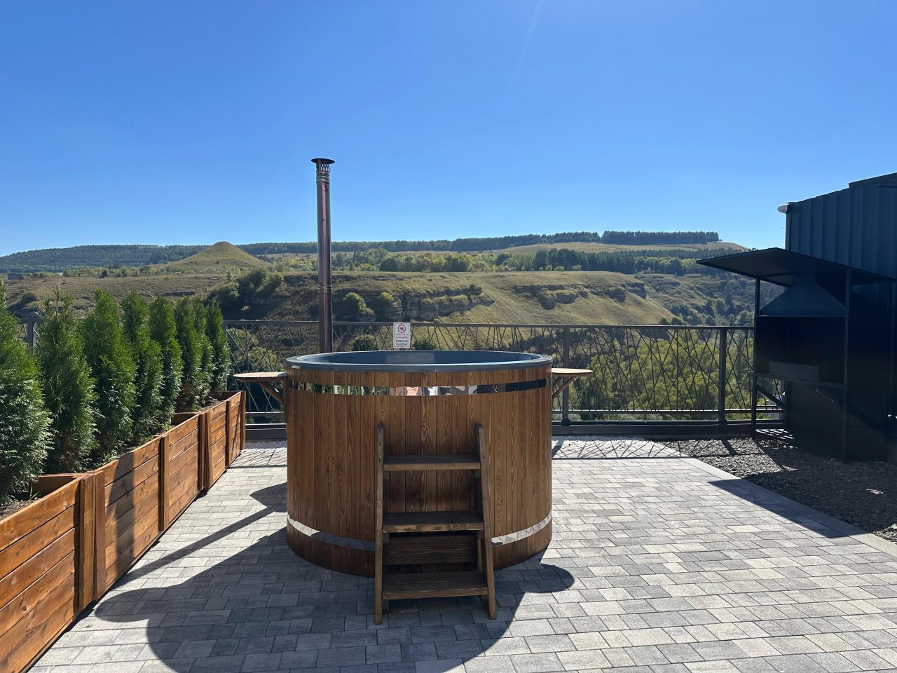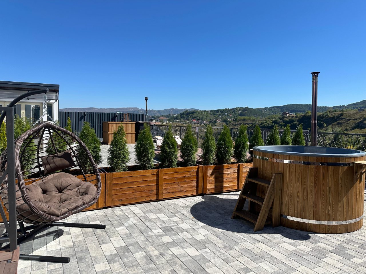 Кухонная зона оборудована бытовой техникой и всей необходимой посудой для приготовления и сервировки вкусных домашних блюд, приготовленных собственными руками. Также можно воспользоваться мангалом и принадлежностями для барбекю. Благодаря невероятно красивым видам, открывающимся с террасы, готовить будет вдвойне приятно.
