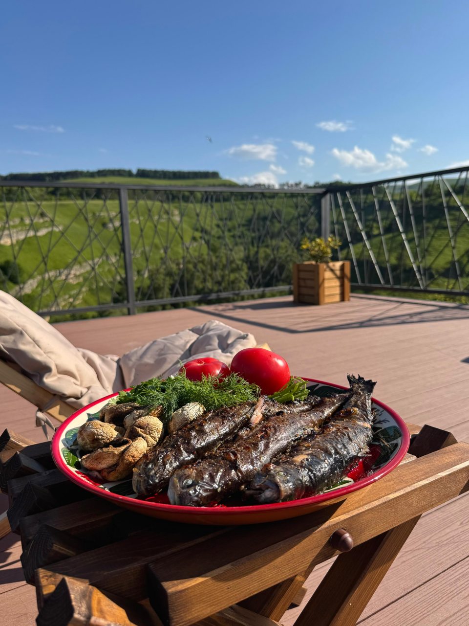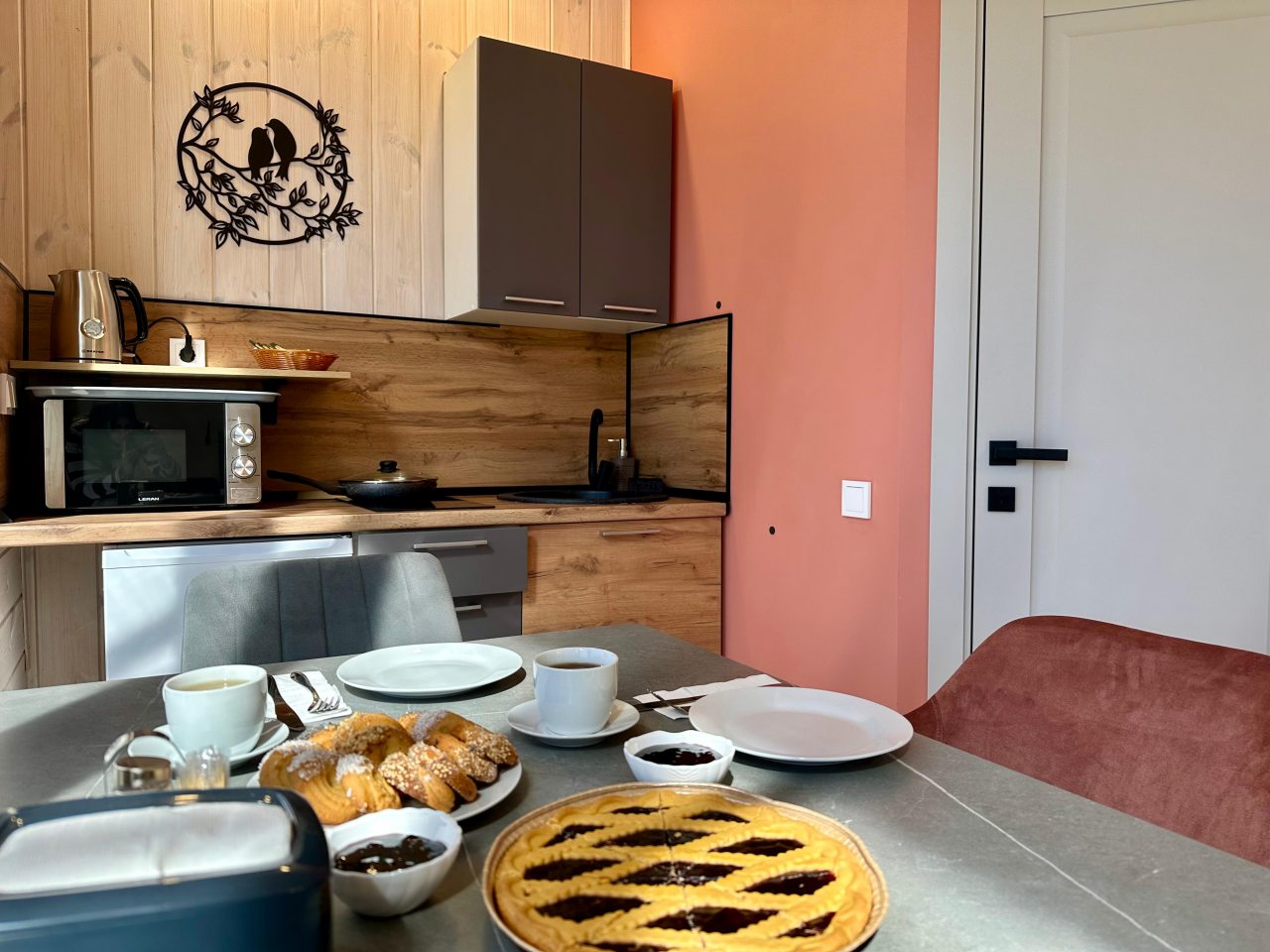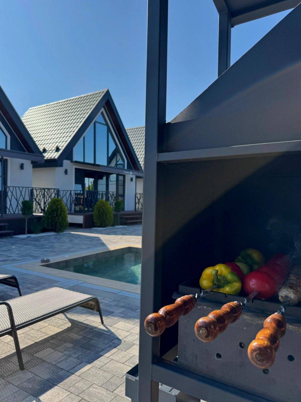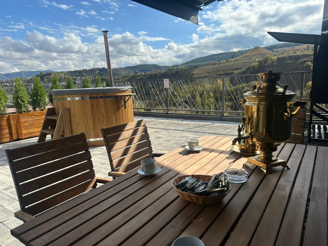 Кухонная зона оборудована бытовой техникой и всей необходимой посудой для приготовления и сервировки вкусных домашних блюд, приготовленных собственными руками. Также можно воспользоваться мангалом и принадлежностями для барбекю. Благодаря невероятно красивым видам, открывающимся с террасы, готовить будет вдвойне приятно.
