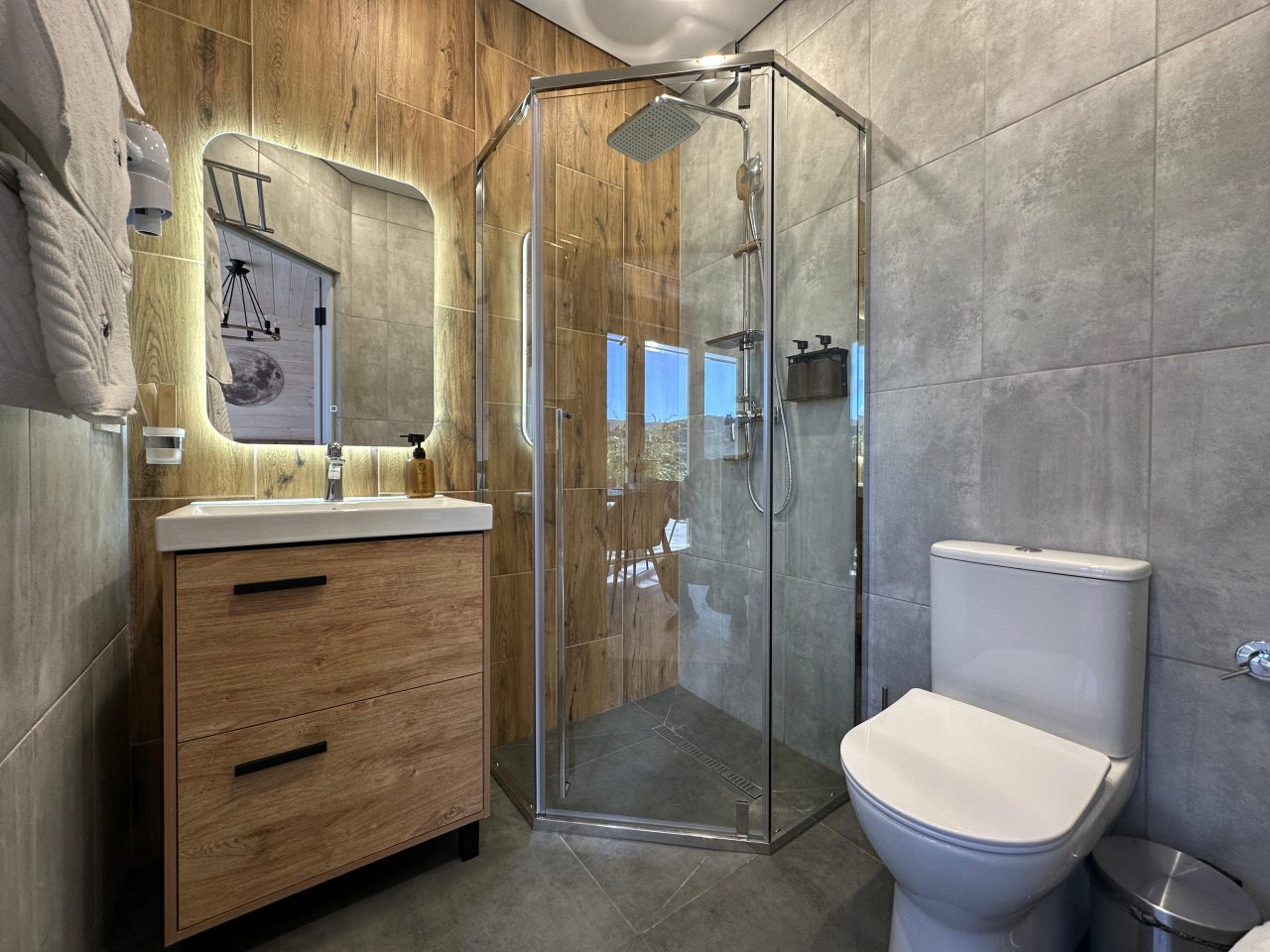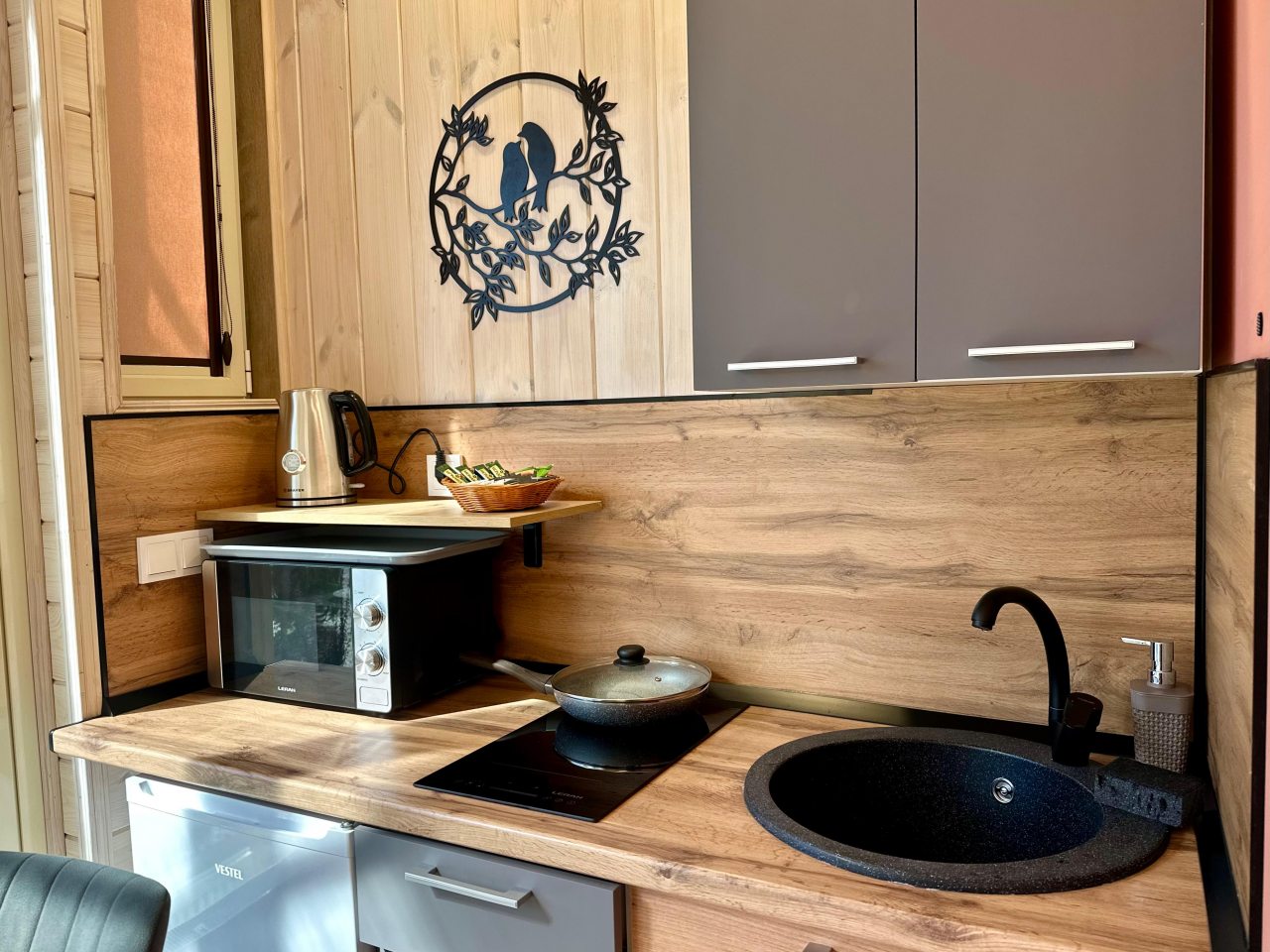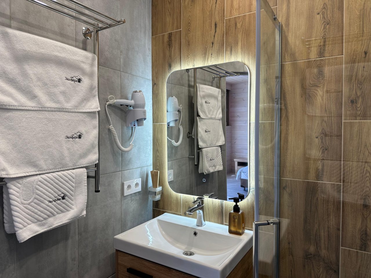 Внутри гостевого дома, выполненного в особом стиле, все продумано до мелочей: удобные кровати с мягким изголовьем, ортопедические матрасы и натуральное постельное белье из 100% хлопка, гипоаллергенные одеяла и подушки, светильники для чтения, раскладной диван, телевизор и Wi-Fi. В ванной комнате предусмотрены не только средства личной гигиены и премиальная косметика, но и фен, полотенца, тапочки, халат.