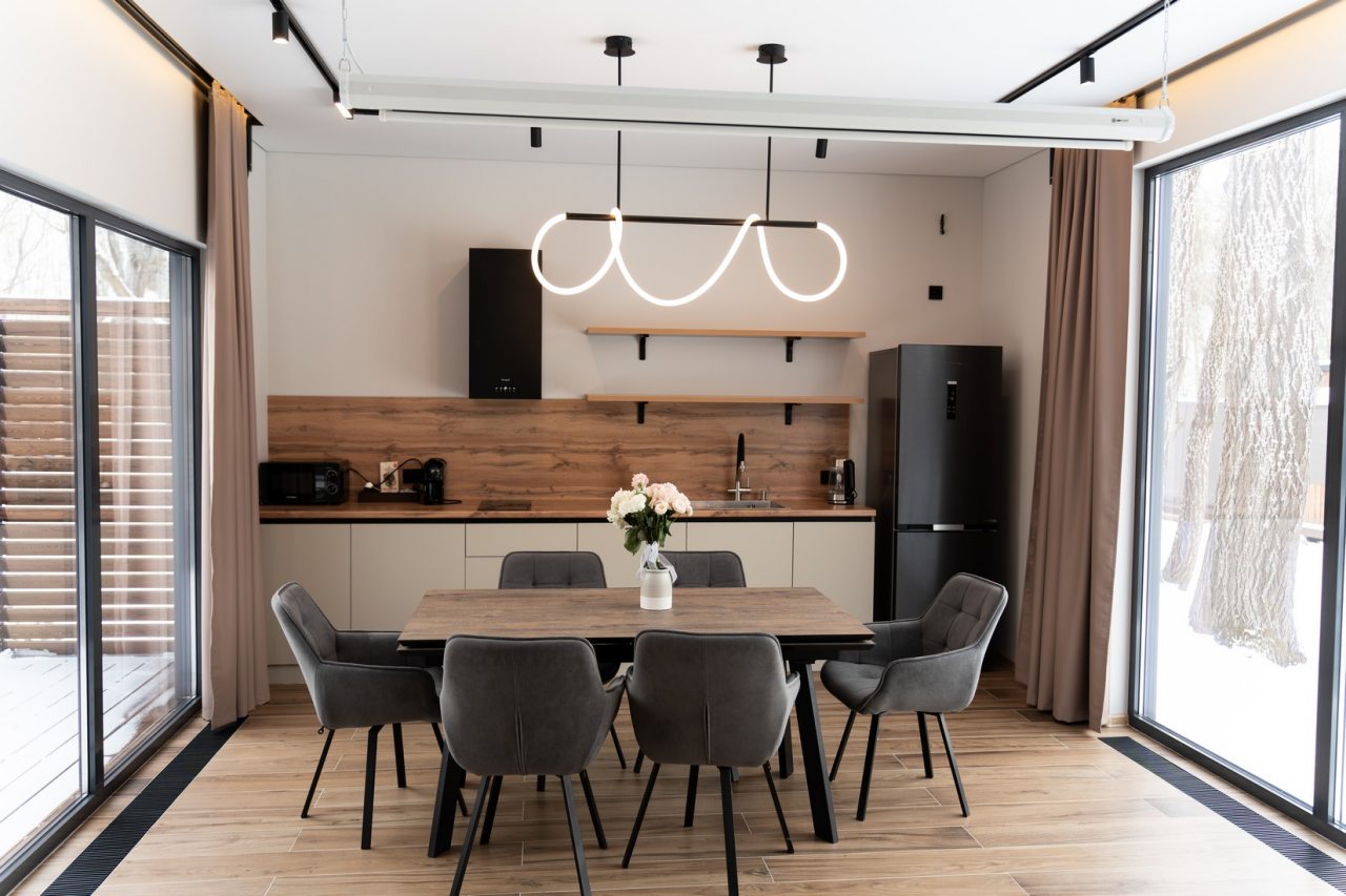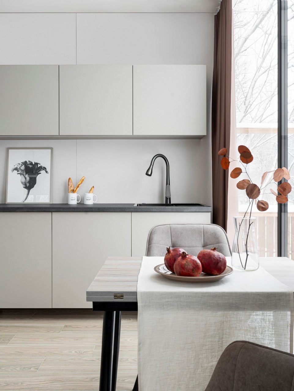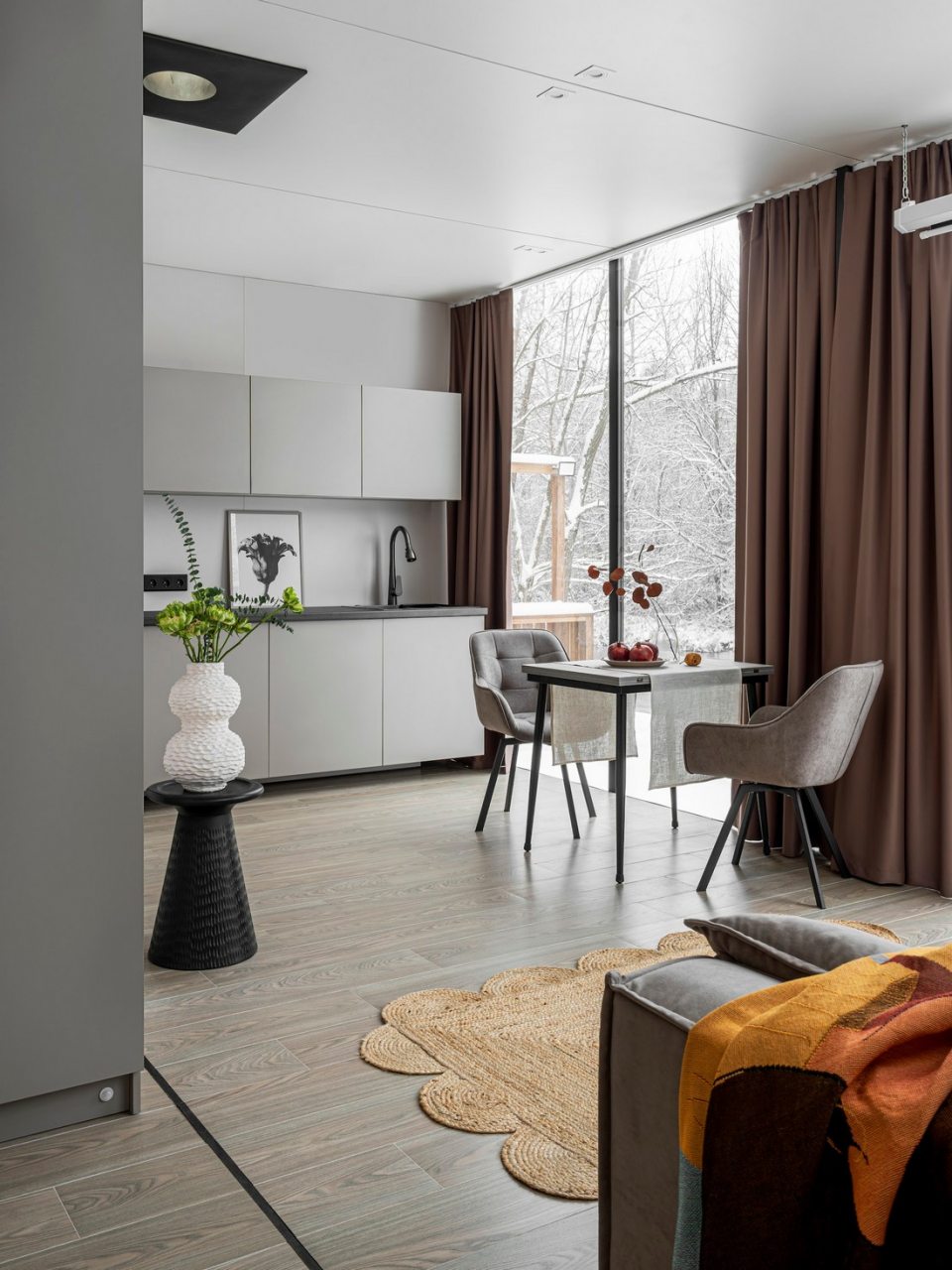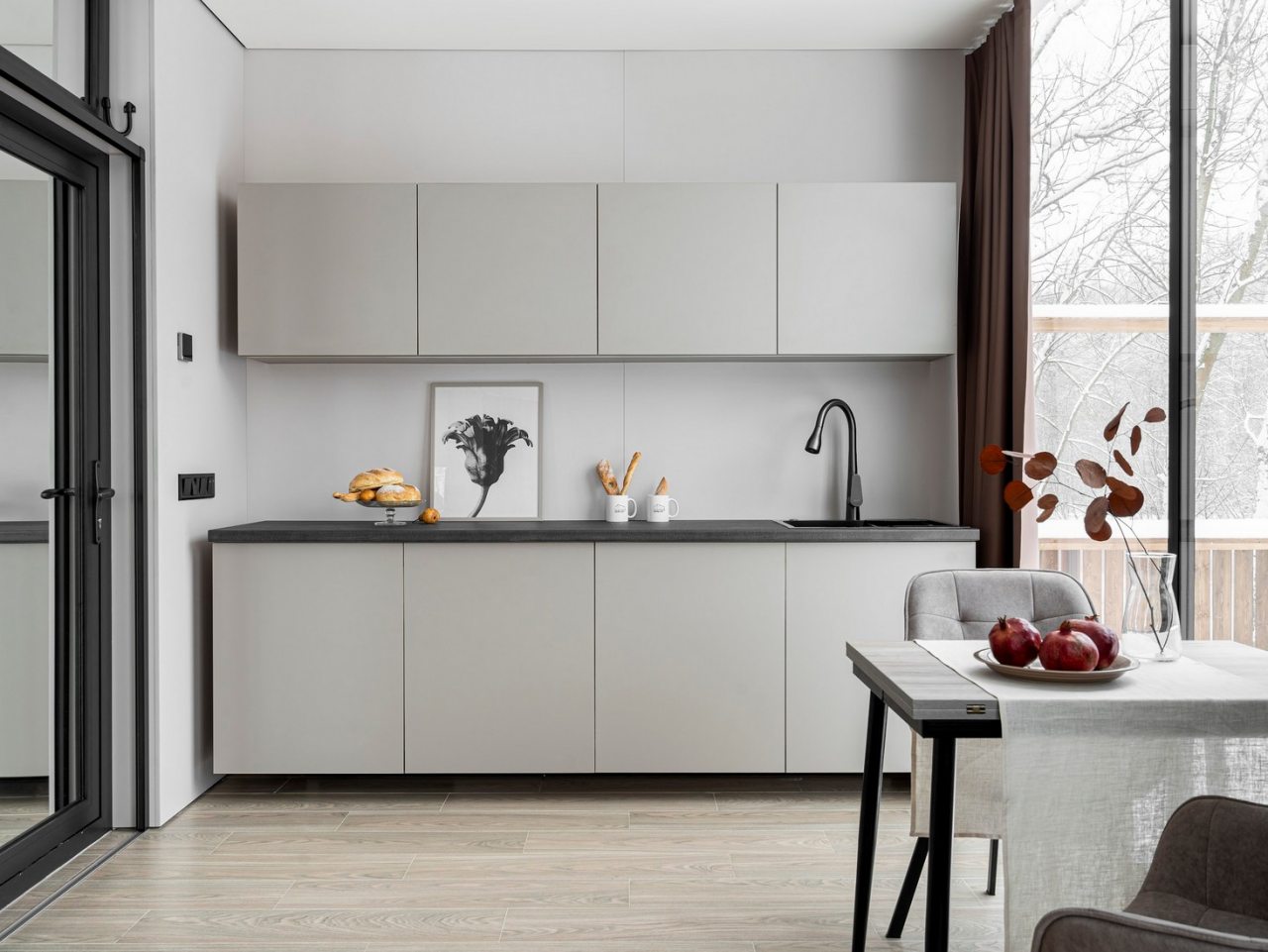 В кухне-гостиной есть обеденный стол, посуда, рабочая поверхность, навесные шкафчики и бытовые приборы для организации питания: холодильник, микроволновая печь, кофемашина, чайник, варочная панель.