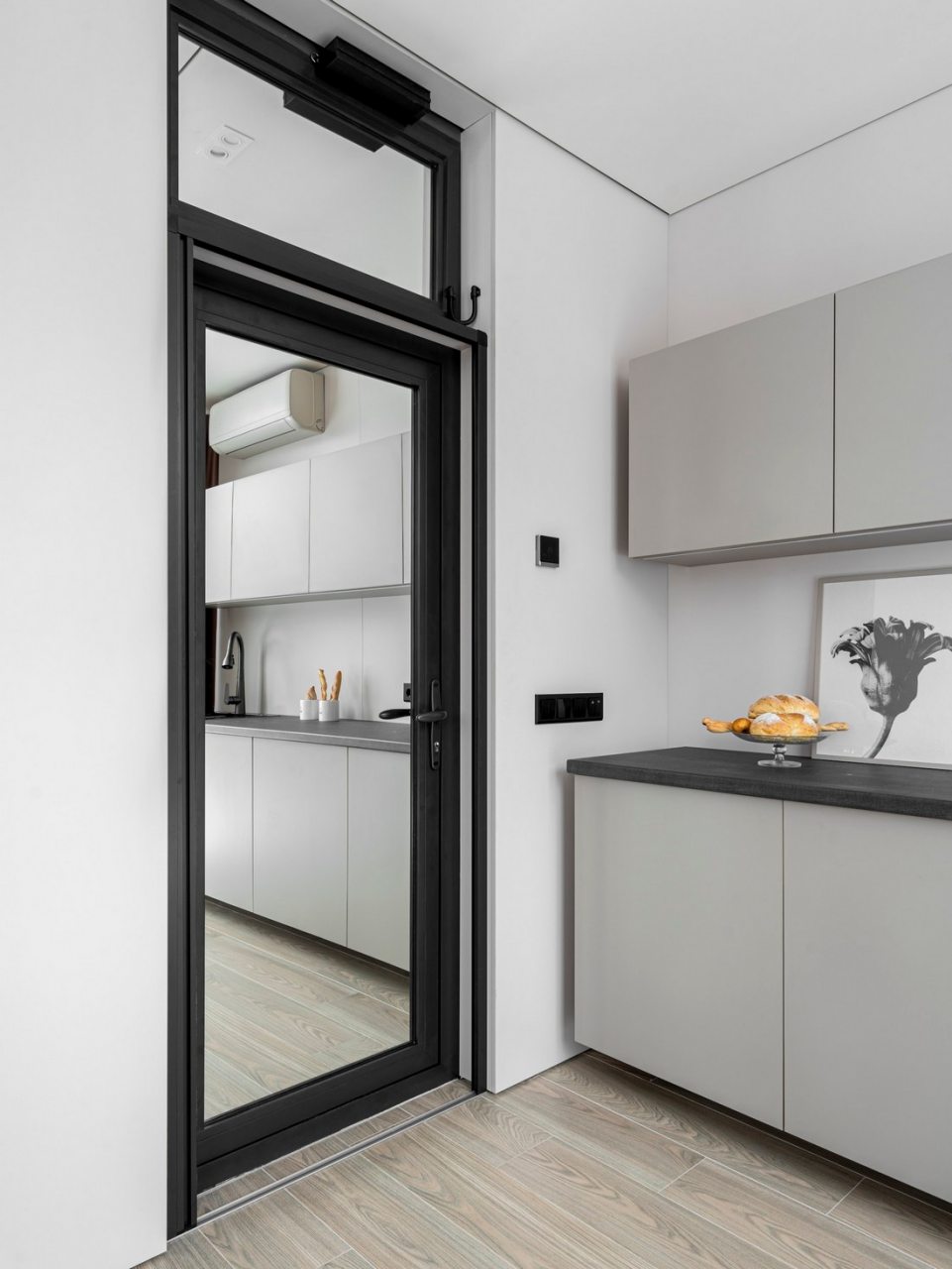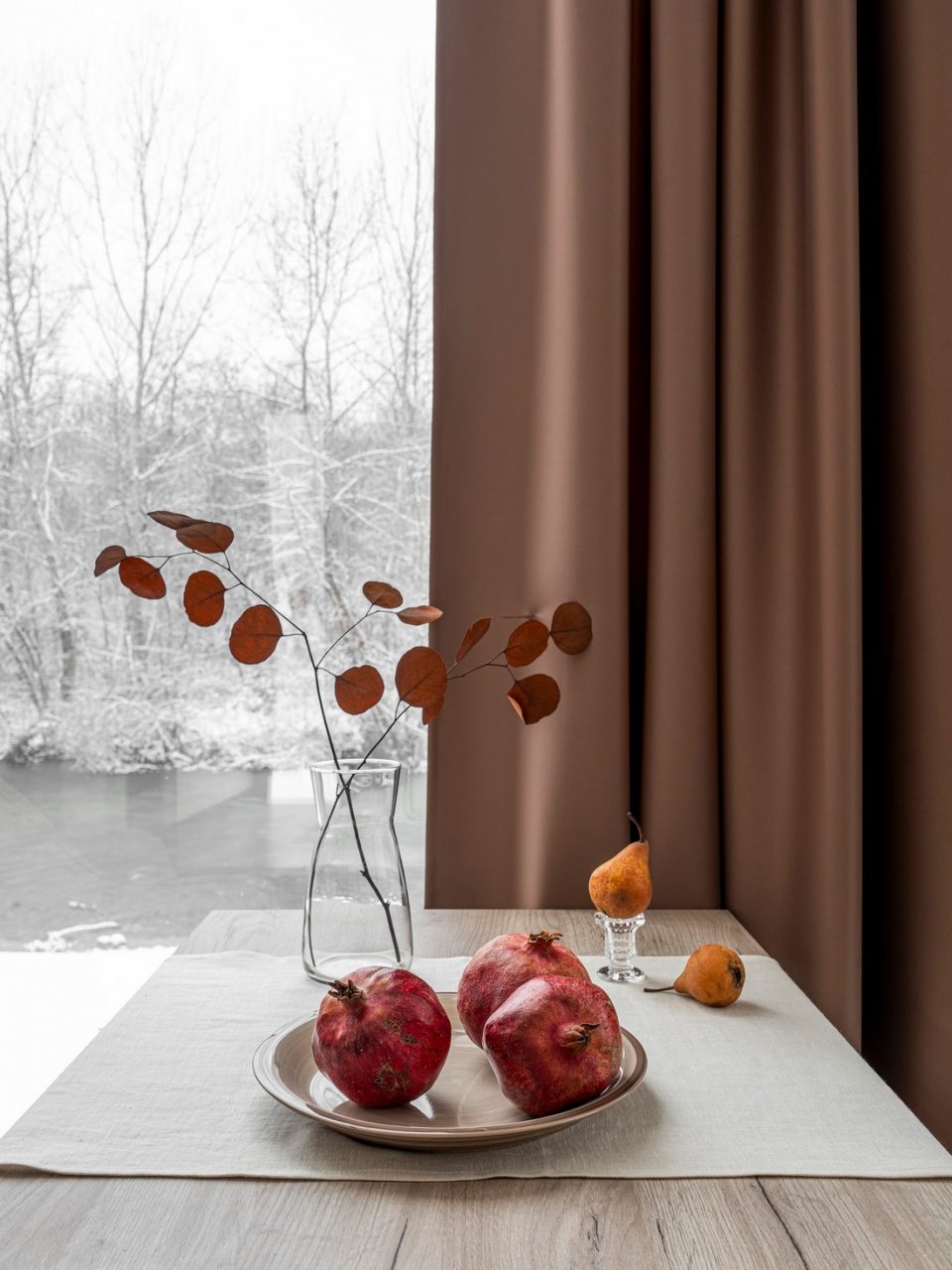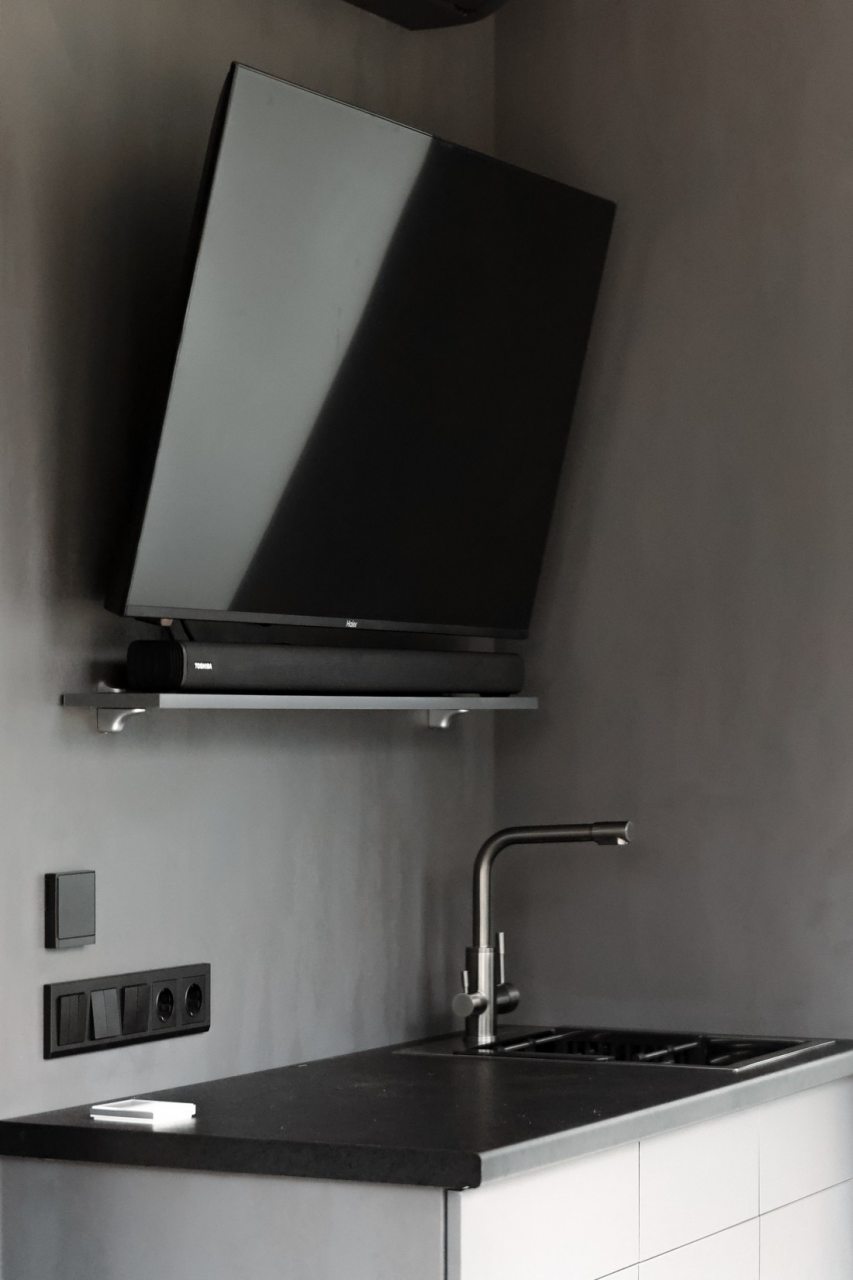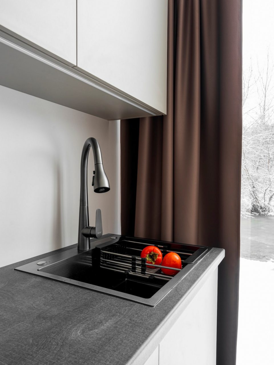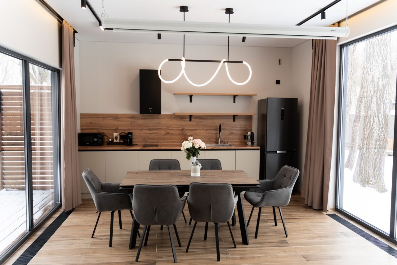 В кухне-гостиной есть обеденный стол, посуда, рабочая поверхность, навесные шкафчики и бытовые приборы для организации питания: холодильник, микроволновая печь, кофемашина, чайник, варочная панель.
