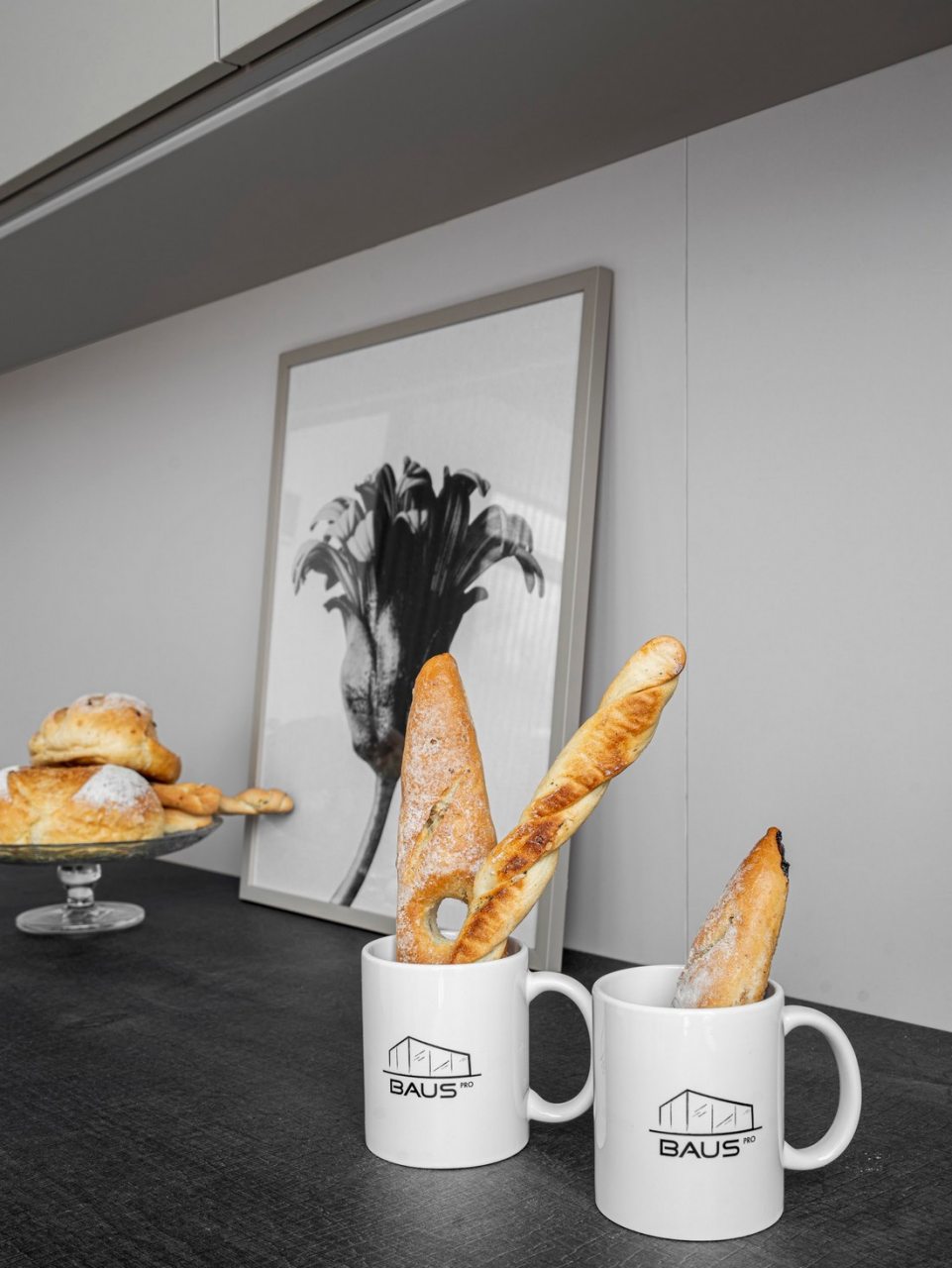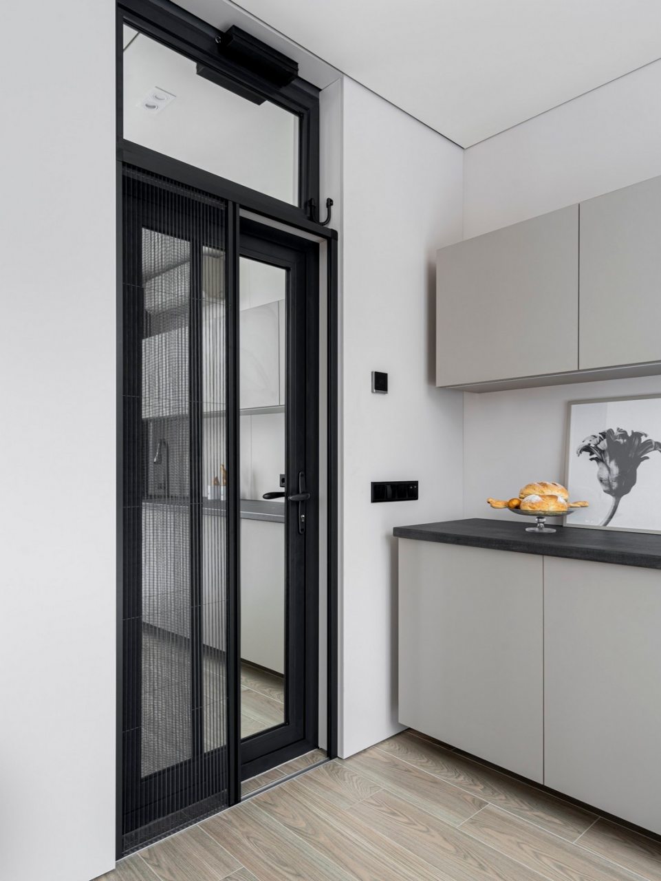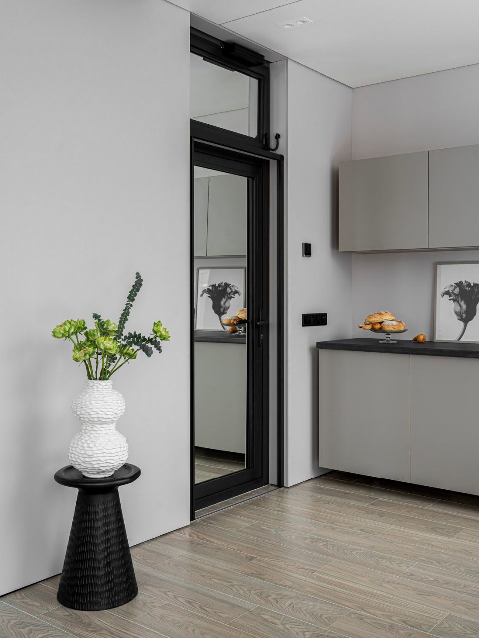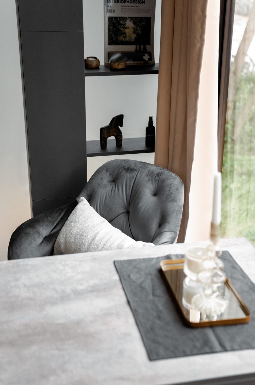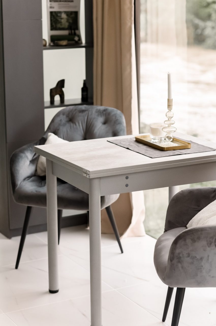 В кухне-гостиной есть обеденный стол, посуда, рабочая поверхность, навесные шкафчики и бытовые приборы для организации питания: холодильник, микроволновая печь, кофемашина, чайник, варочная панель.