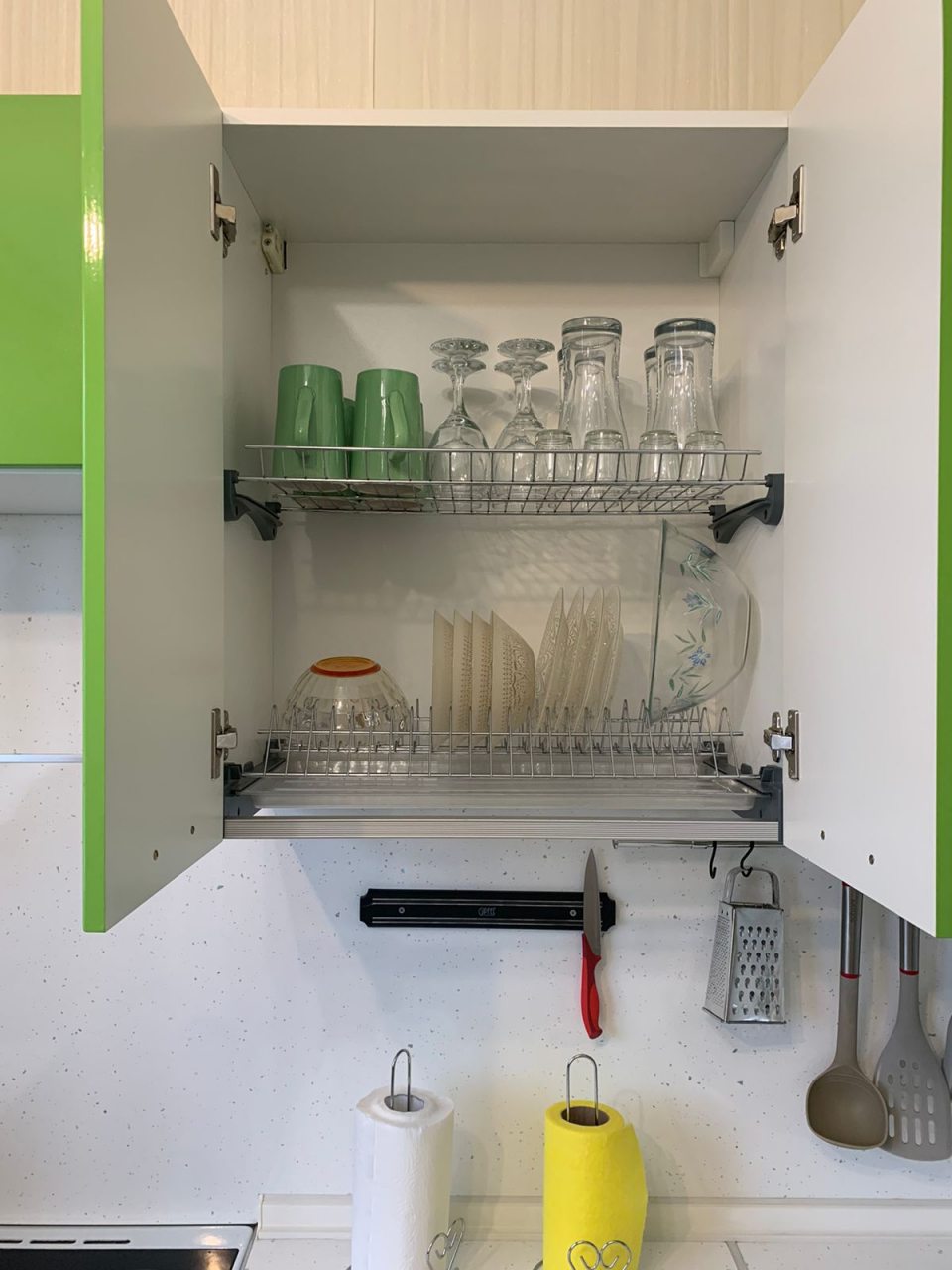 Яркая кухня оснащена бытовой техникой, необходимой для организации питания: микроволновая печь, плита, духовой шкаф, холодильник. Поблизости работают супермаркет и суши-бар, где можно перекусить, если не возникнет желания готовить.