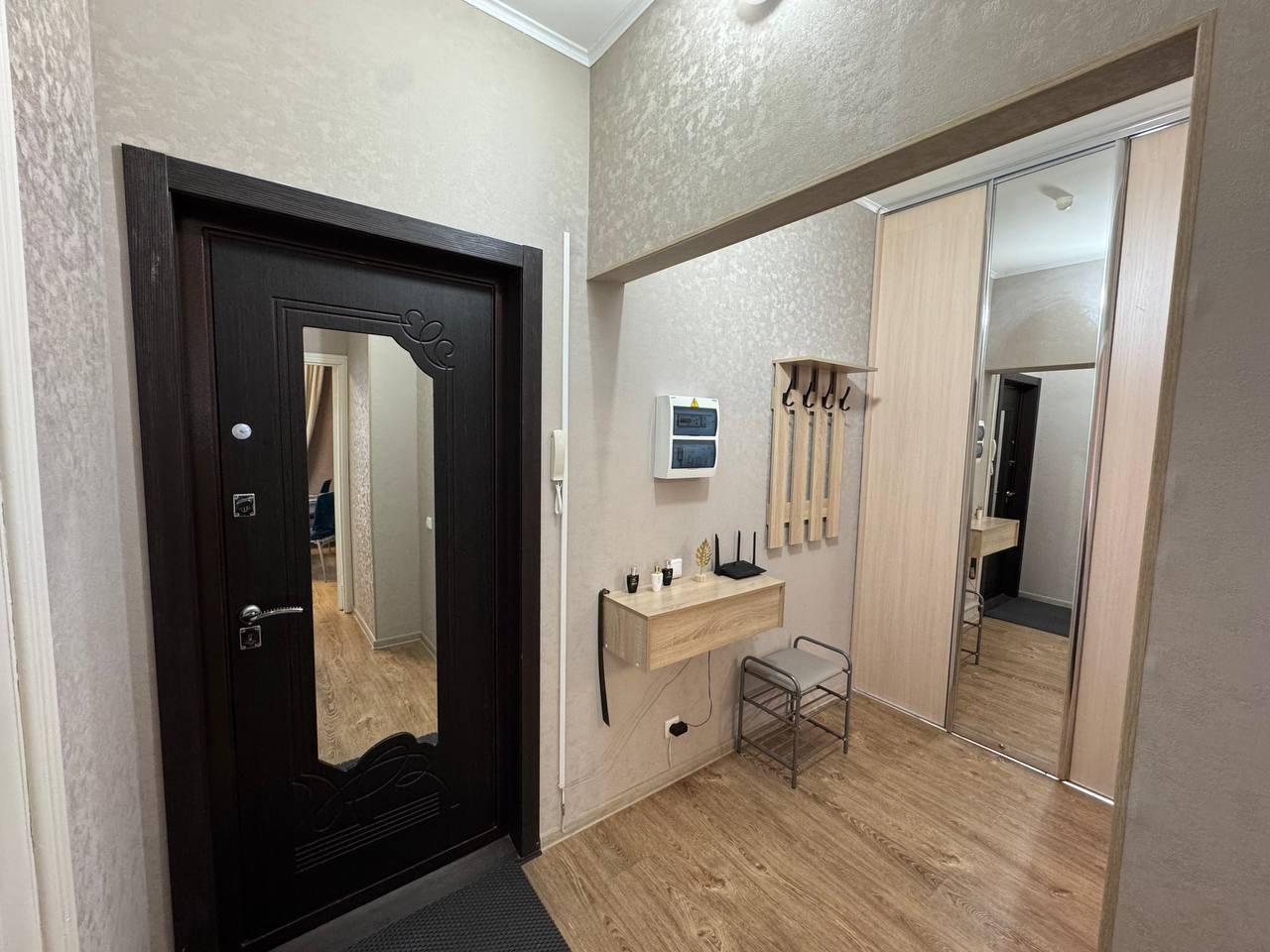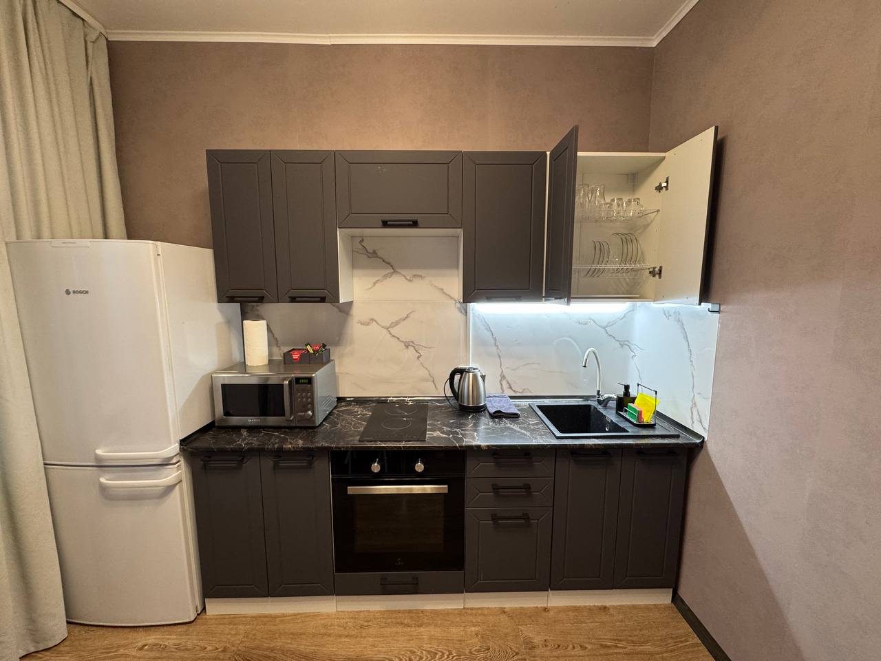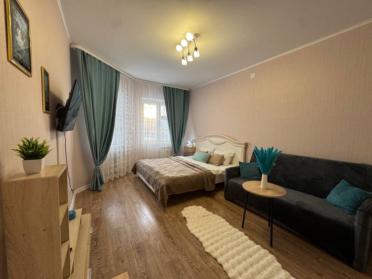 Гостям предлагается разместиться в комфортабельных апартаментах, которые имеют все необходимое для проживания. Среди удобств: плазменный телевизор, Яндекс Станция, шкаф-купе, а также затемненный шторы для комфортного сна. В личной ванной комнате установлена стиральная машина, сушильный барабан, фен. Предоставляются средства личной гигиены и набор полотенец.