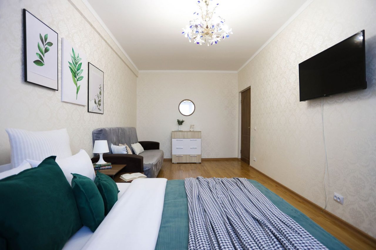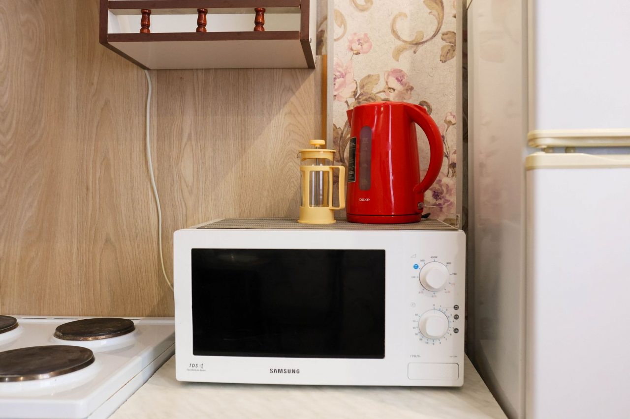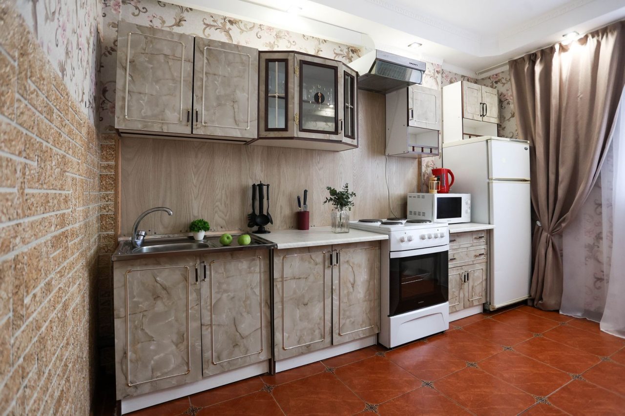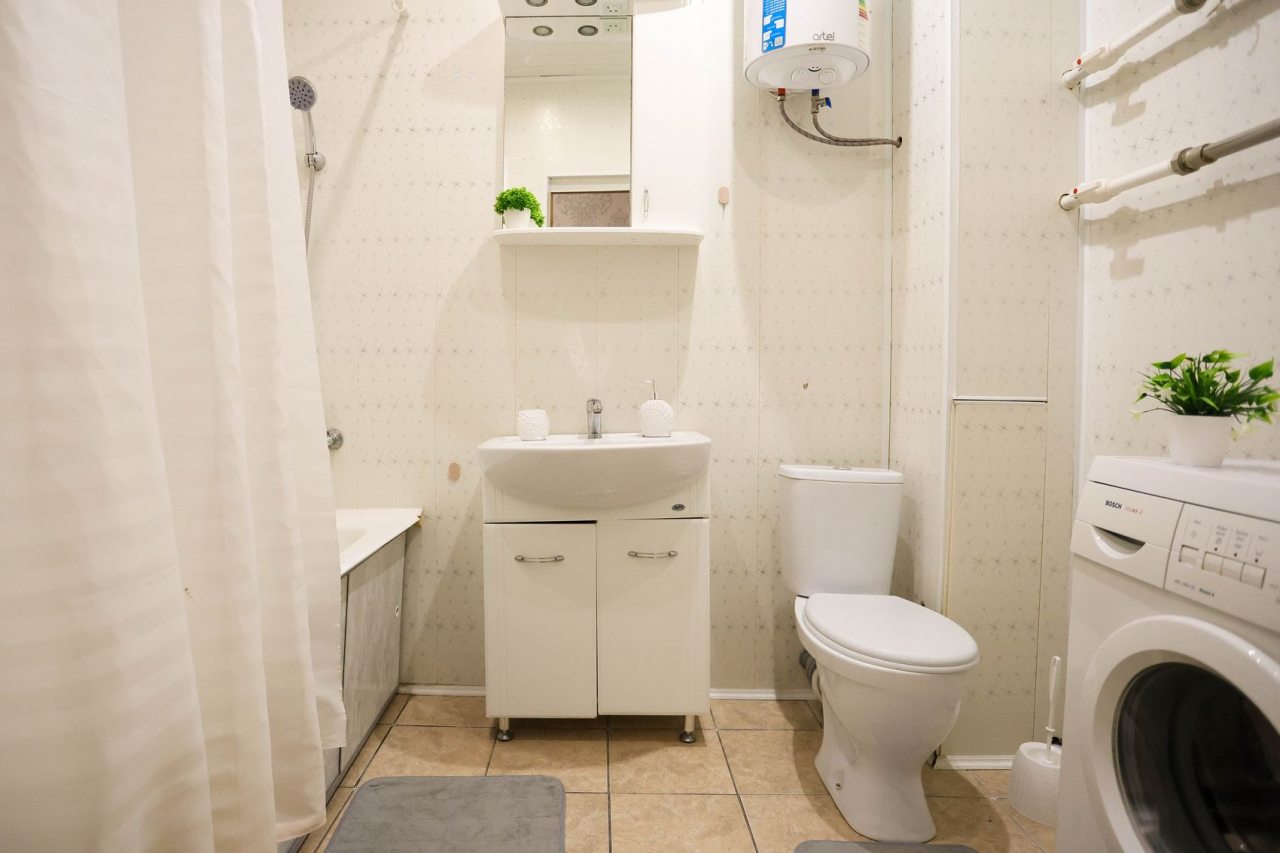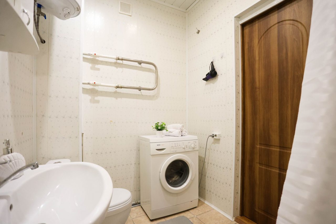 Хочу поблагодарить персонал, обслуживающий апартаменты. При заселении мы не обнаружили ни одного недостатка. Сияющая чистота покорила нас! В спальне большая кровать удобный, хотя и не новый диван. Кухня с бытовой техникой, печью. Имеется и чайник, и фильтр для питьевой воды. Санузел здесь совмещенный, но места внутри достаточно. Великолепный вариант!