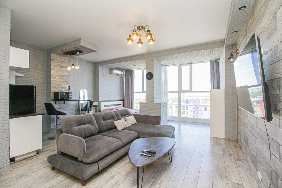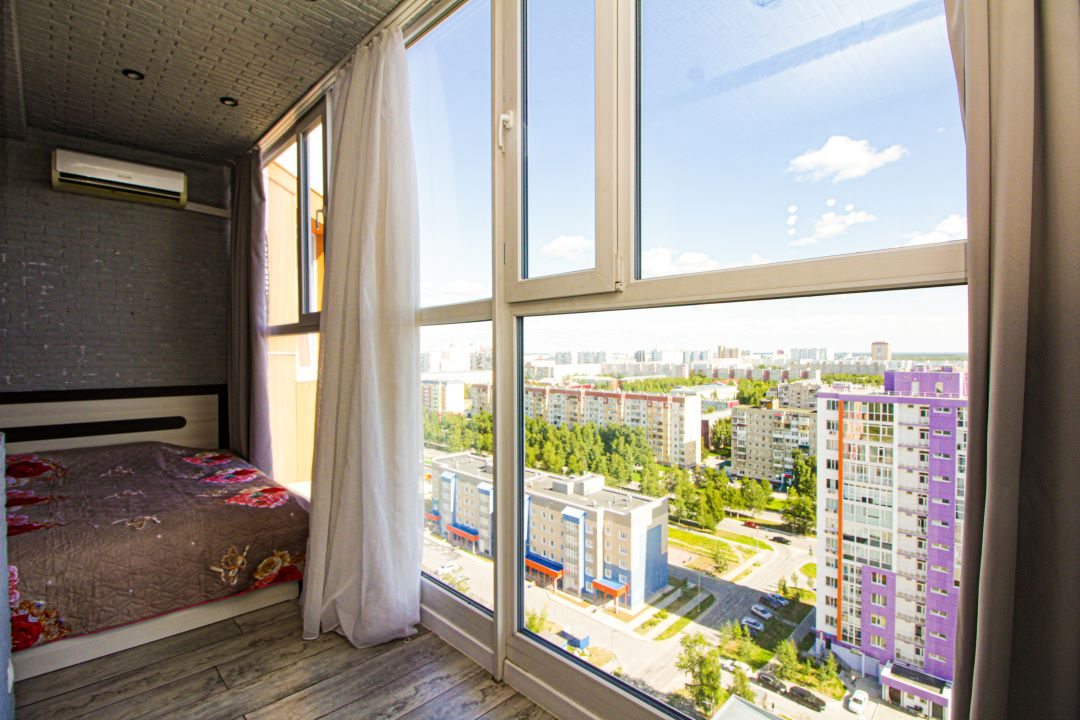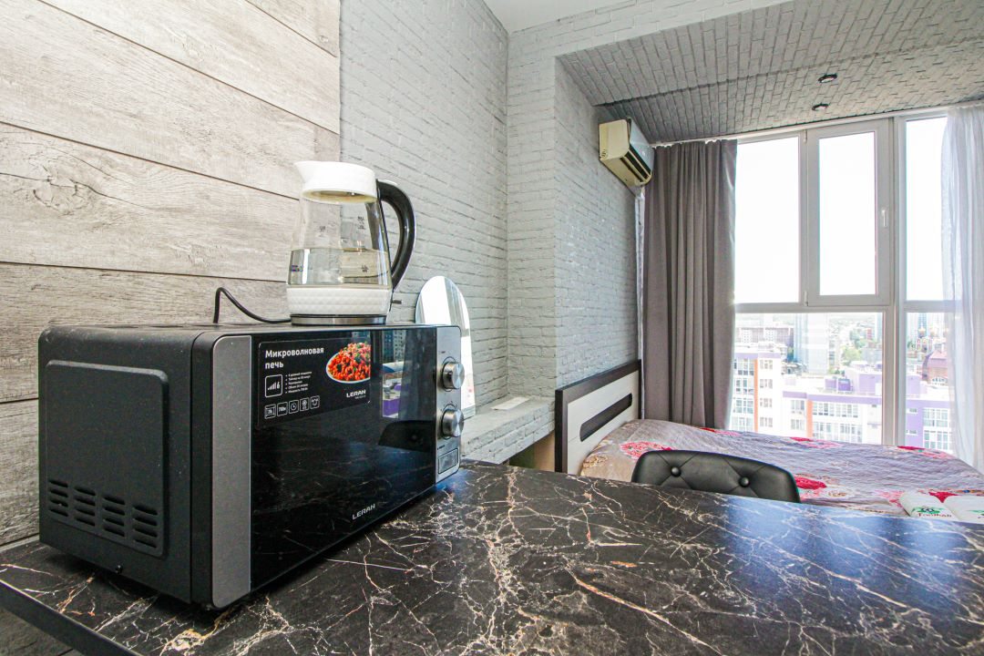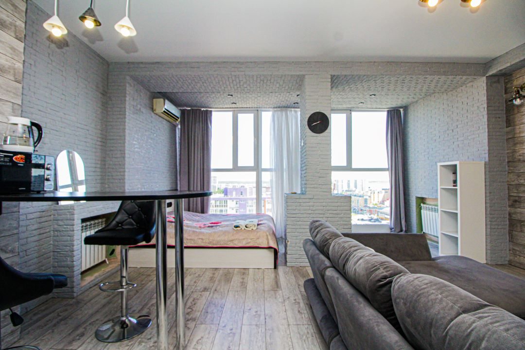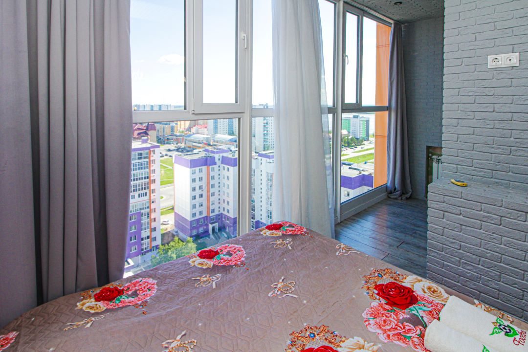 Внутри вас ожидает панорамный вид на город, удобная двуспальная кровать, мягкий диван с телевизором, сплит-система, вместительный шкаф с зеркалом в полный рост, а также санузел с душевой и средствами для личной гигиены.