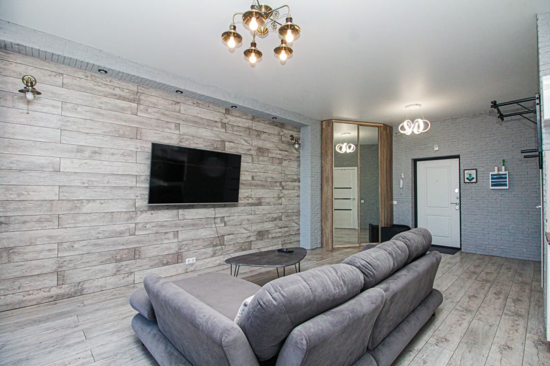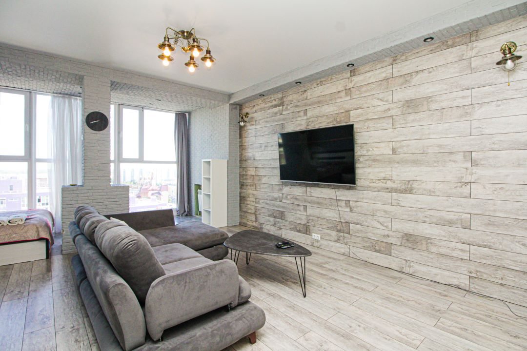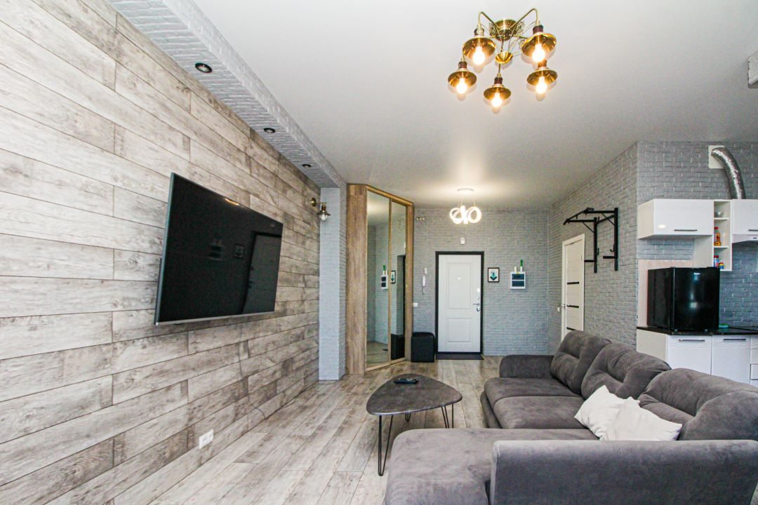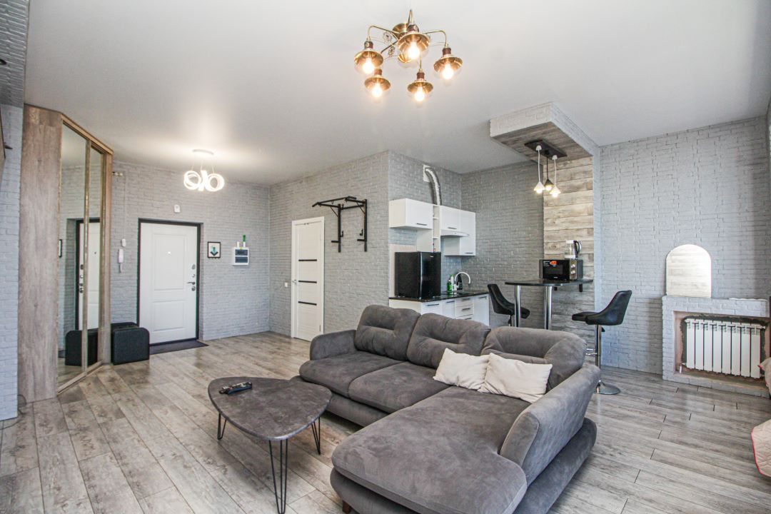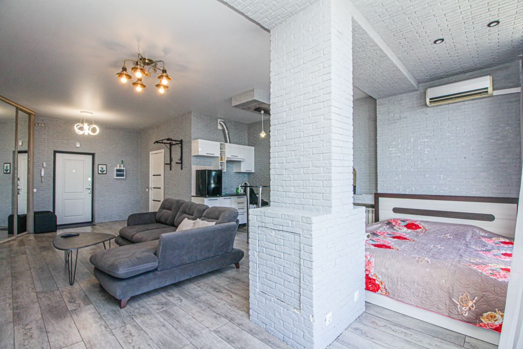 Внутри вас ожидает панорамный вид на город, удобная двуспальная кровать, мягкий диван с телевизором, сплит-система, вместительный шкаф с зеркалом в полный рост, а также санузел с душевой и средствами для личной гигиены.