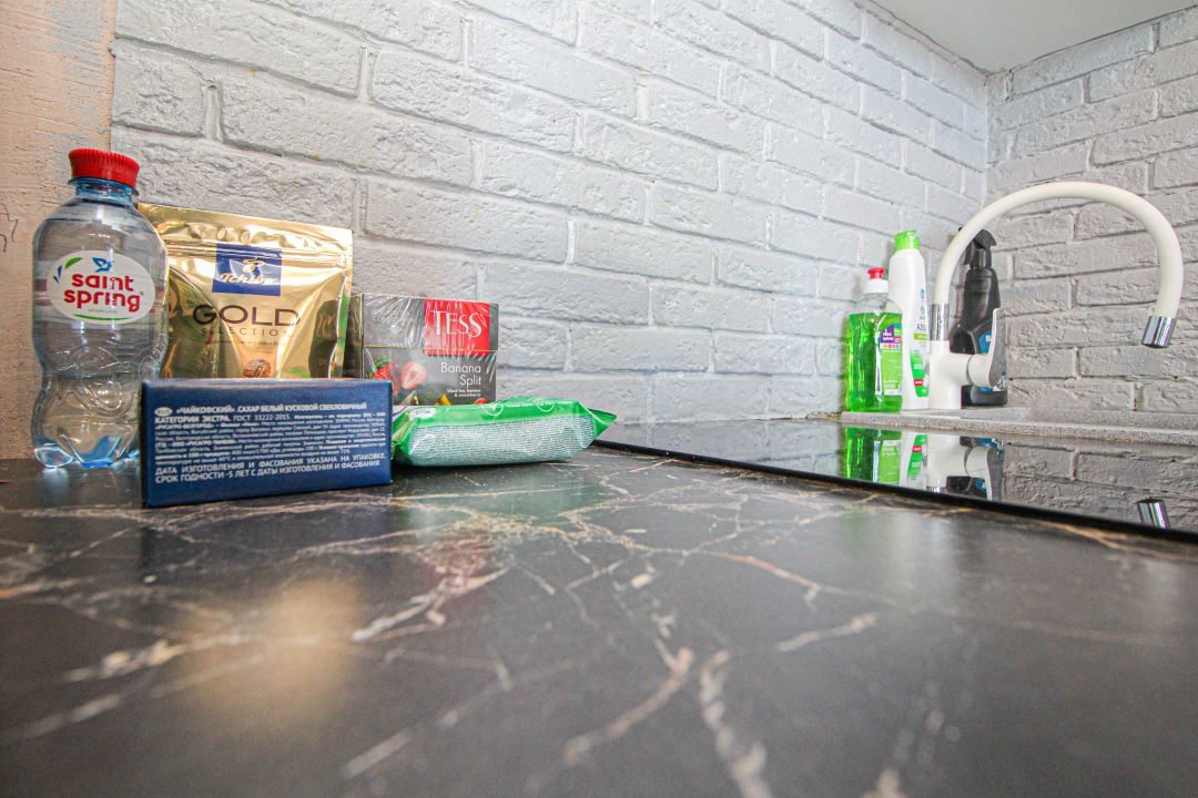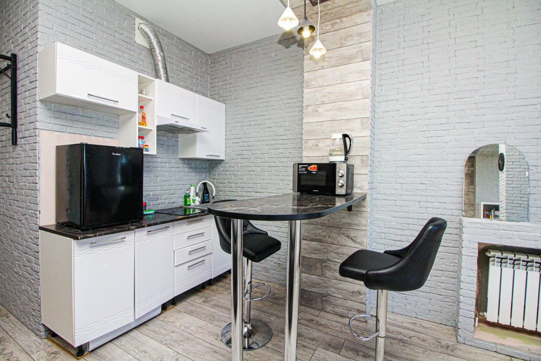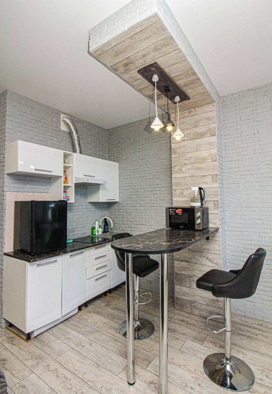 Кухонная зона укомплектована мини-холодильником, варочной панелью, СВЧ-печью, чайником, обеденной зоной.