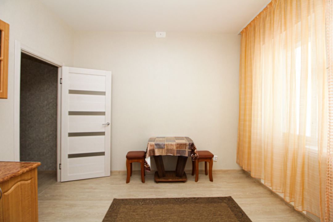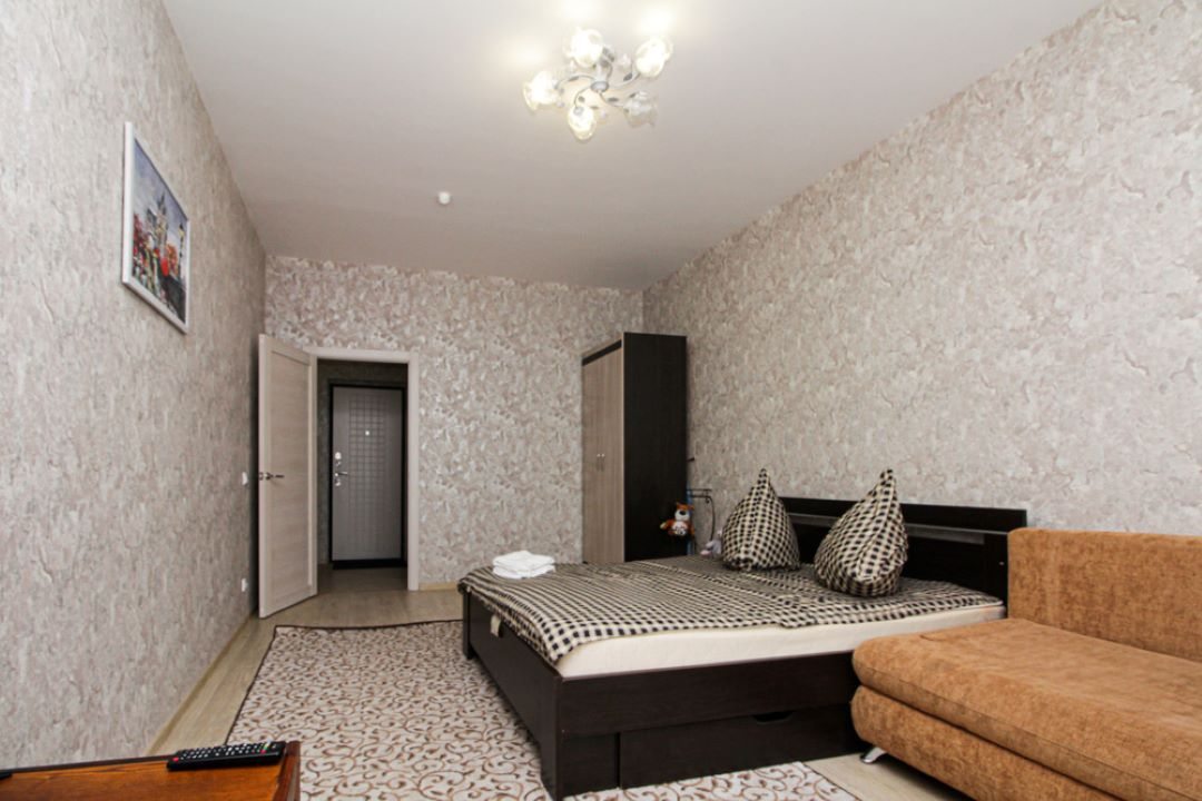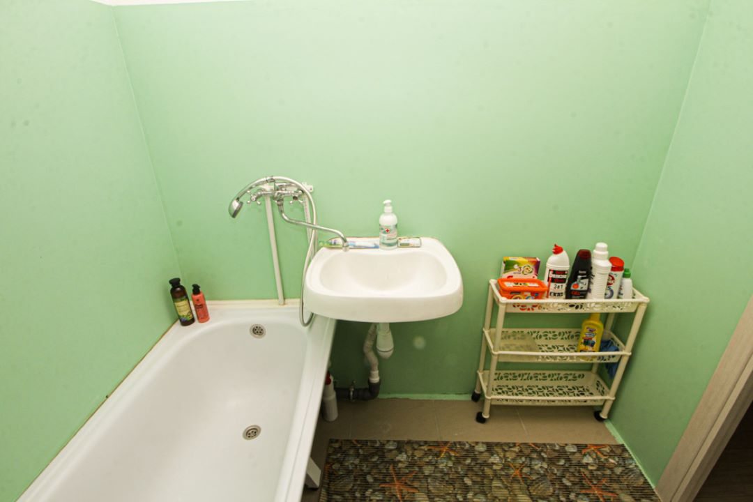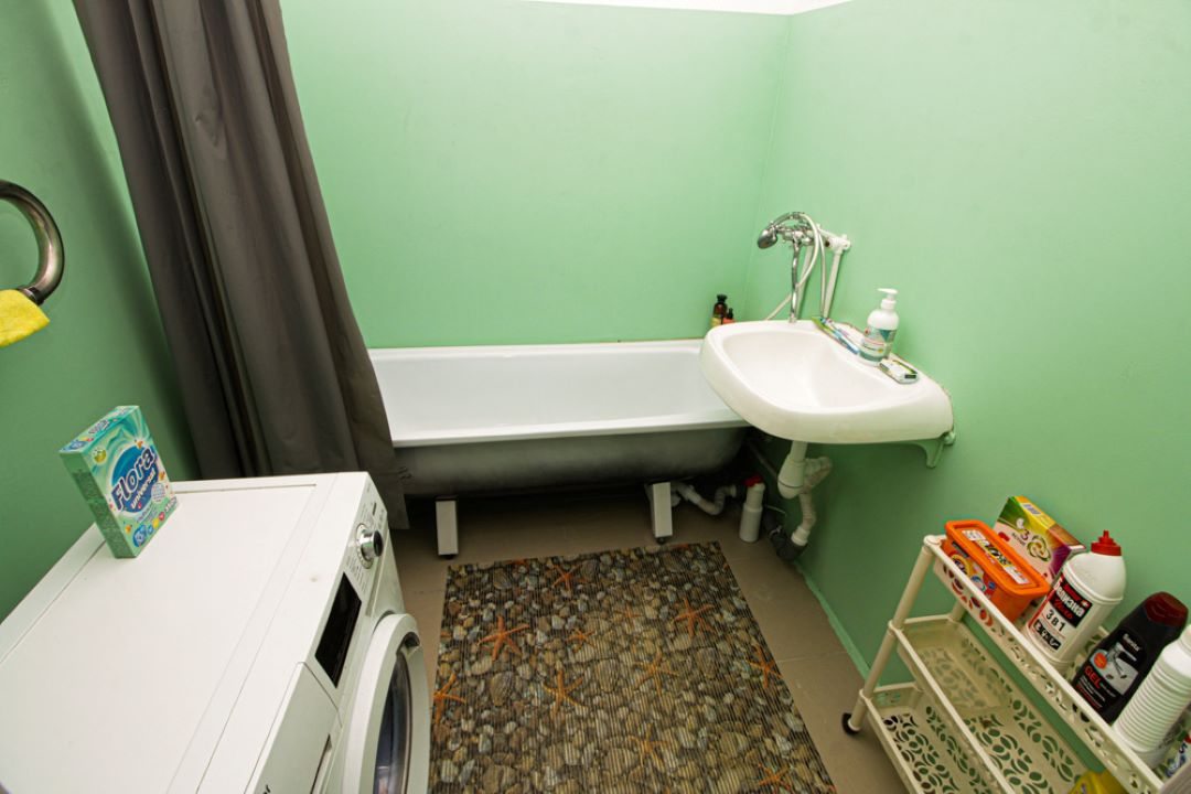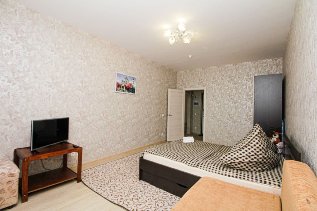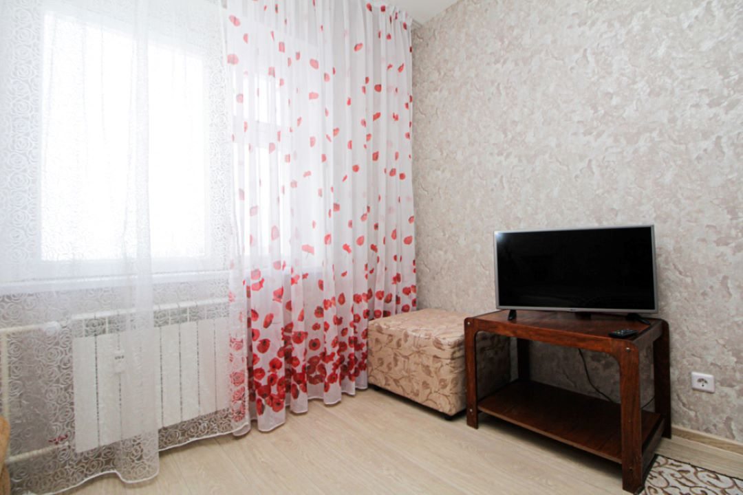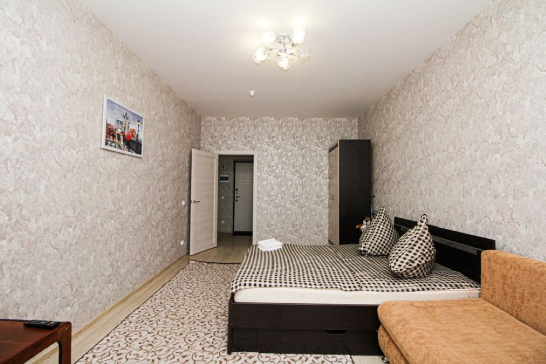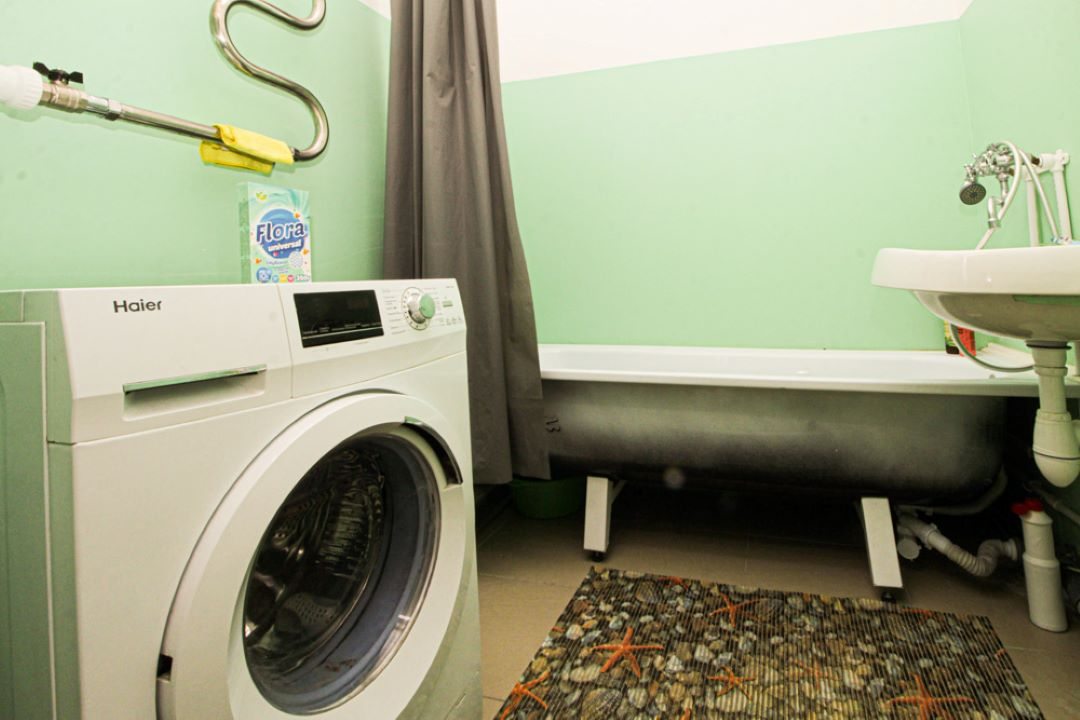 На просторной площади в 50 квадратных метров гостей ожидает удобная двуспальная кровать, мягкий диван с телевизором, вместительный шкаф, а также полноценная ванна и стиральная машина.
