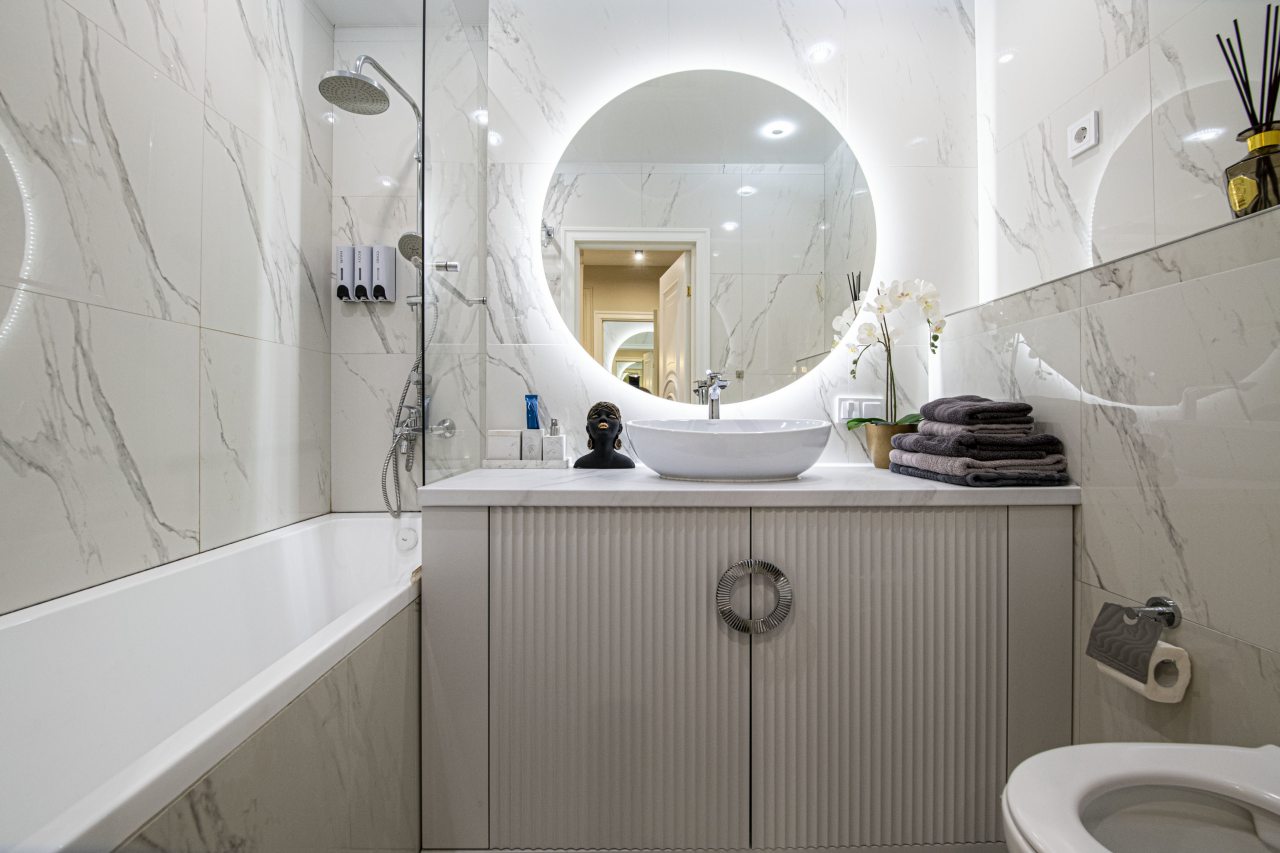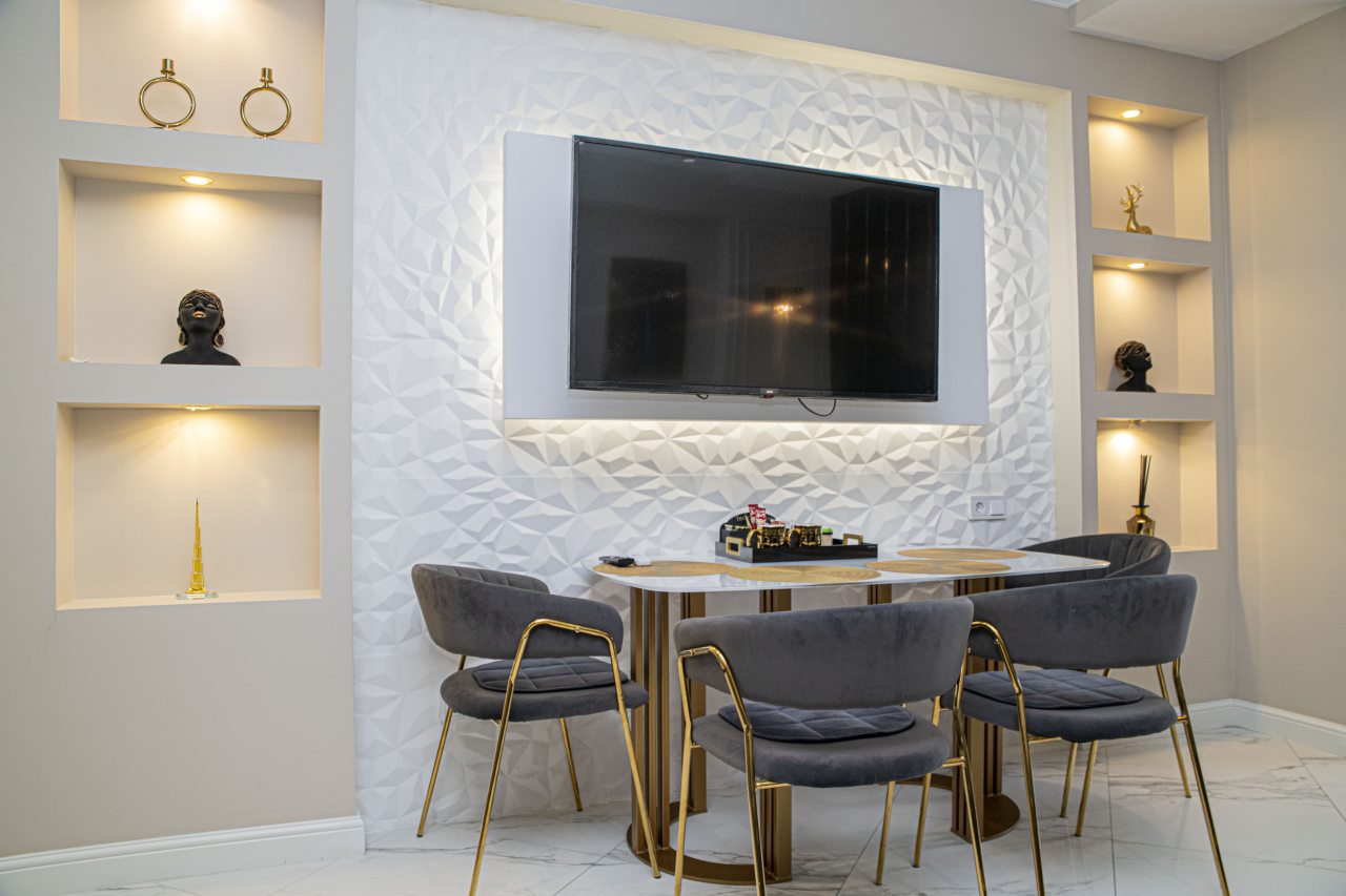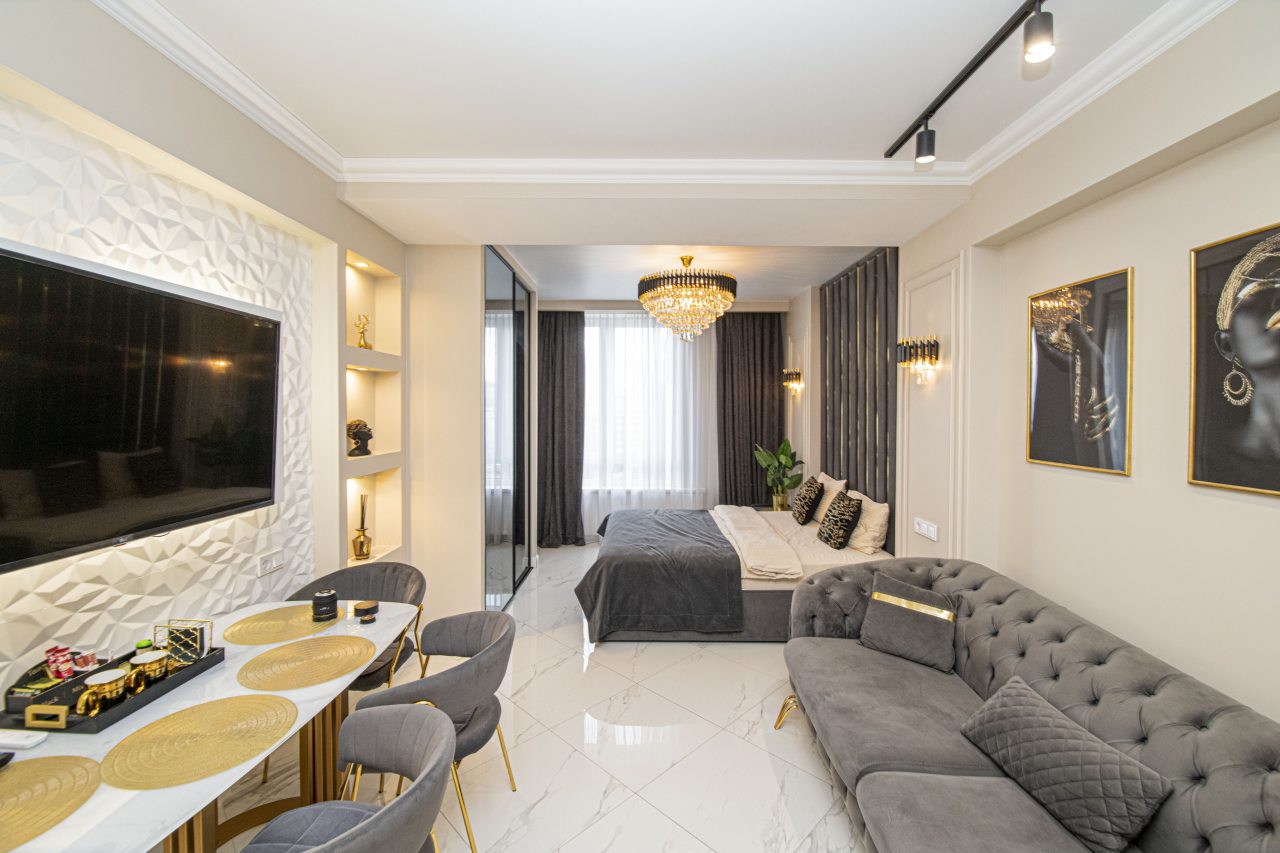 Квартиры светлые, современные, с прекрасным дизайнерским ремонтом, оснащены необходимой мебелью для комфортного проживания: кровать King-size со спальным бельём, телевизор, шкаф для хранения вещей, зеркало. Чтобы быть на связи с родными людьми работает скоростной интернет. Санузел оборудован необходимо сантехникой, есть тапочки, фен, средства личной гигиены и косметические принадлежности.