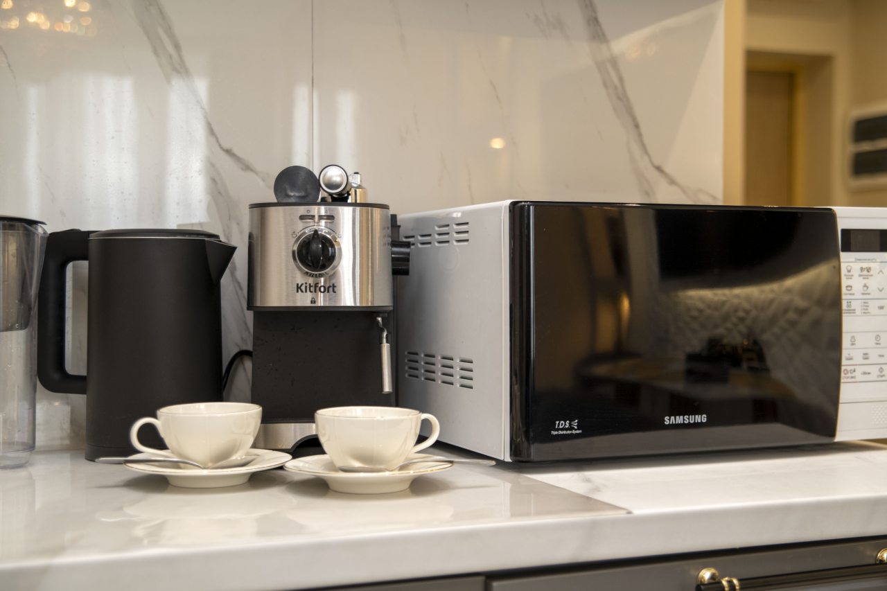Кухня вмещает в себя стол с нужными приборами и утварью. Также в каждых апартаментах есть чайник, холодильник, электроплита и микроволновая печь. В некоторых апартаментах есть кофемашина. Перекусить можно в ресторане «Стейк - Хаус Км».