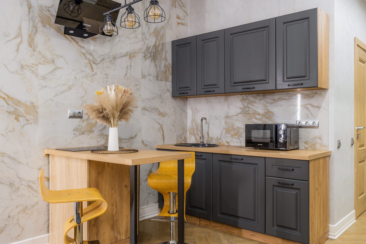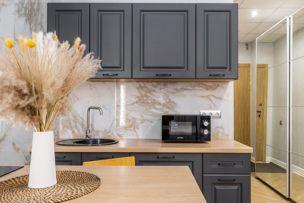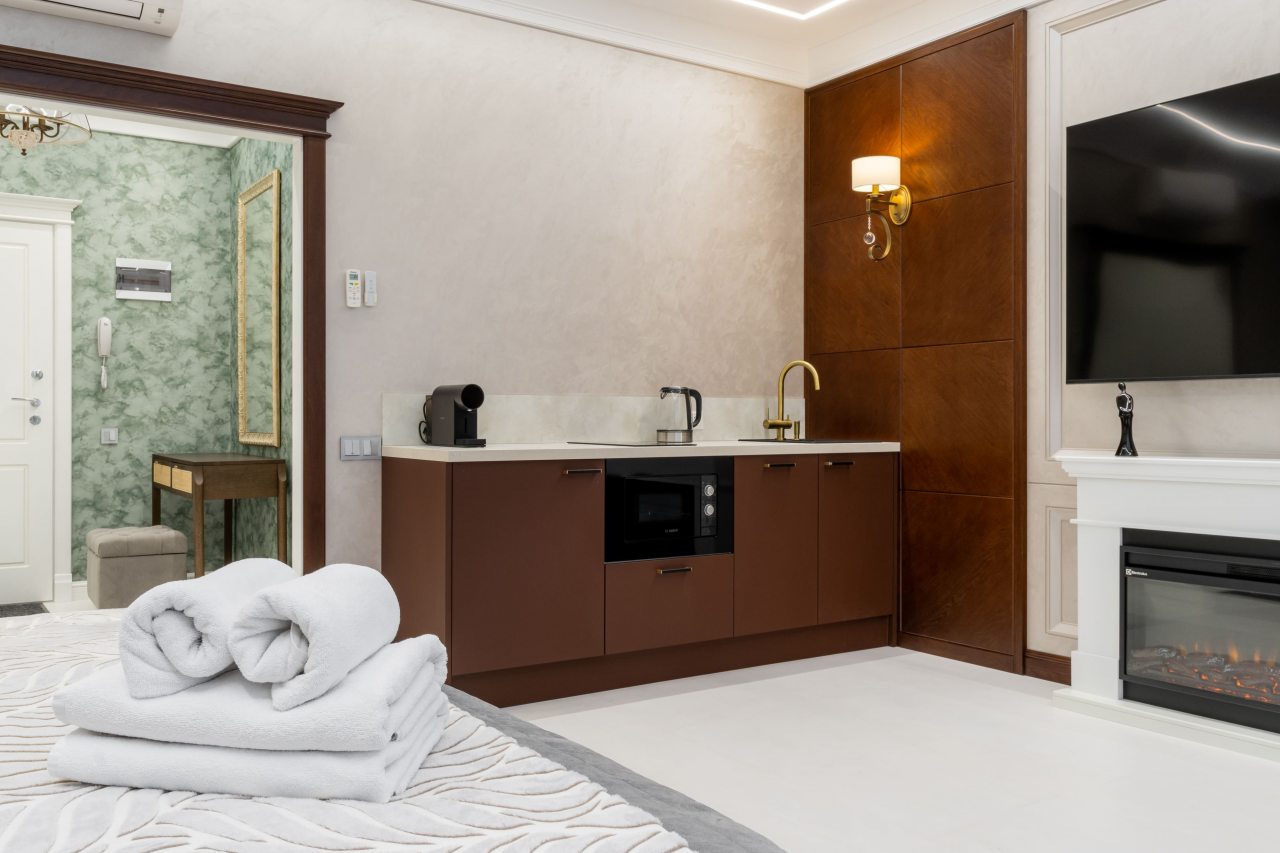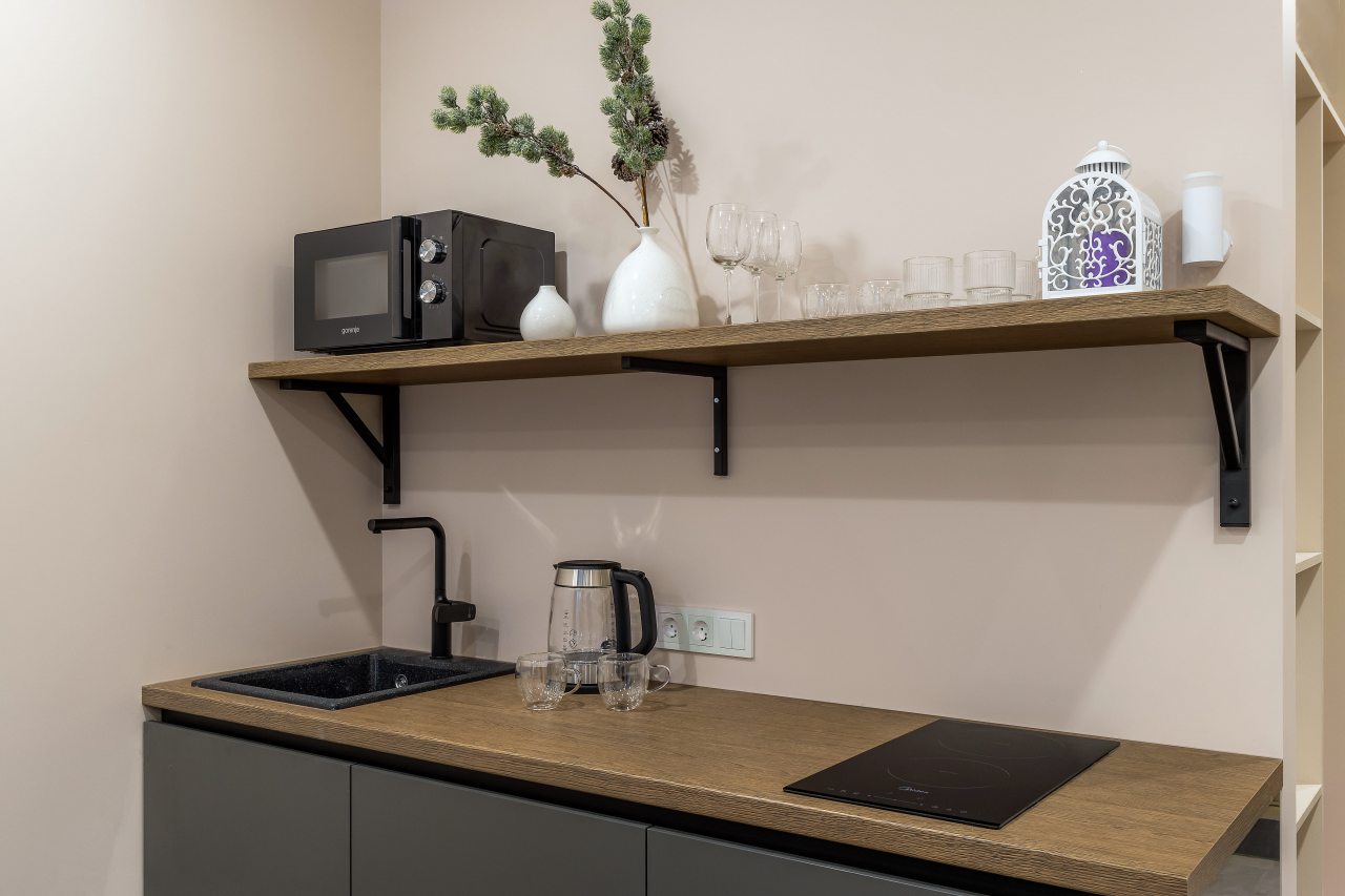 - Полностью укомплектованная кухня, где можно готовить что угодно (есть даже фильтр для воды, духовка и посудомоечная машина)