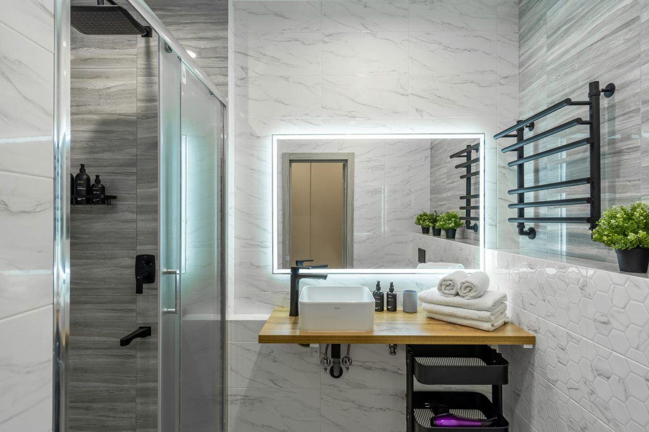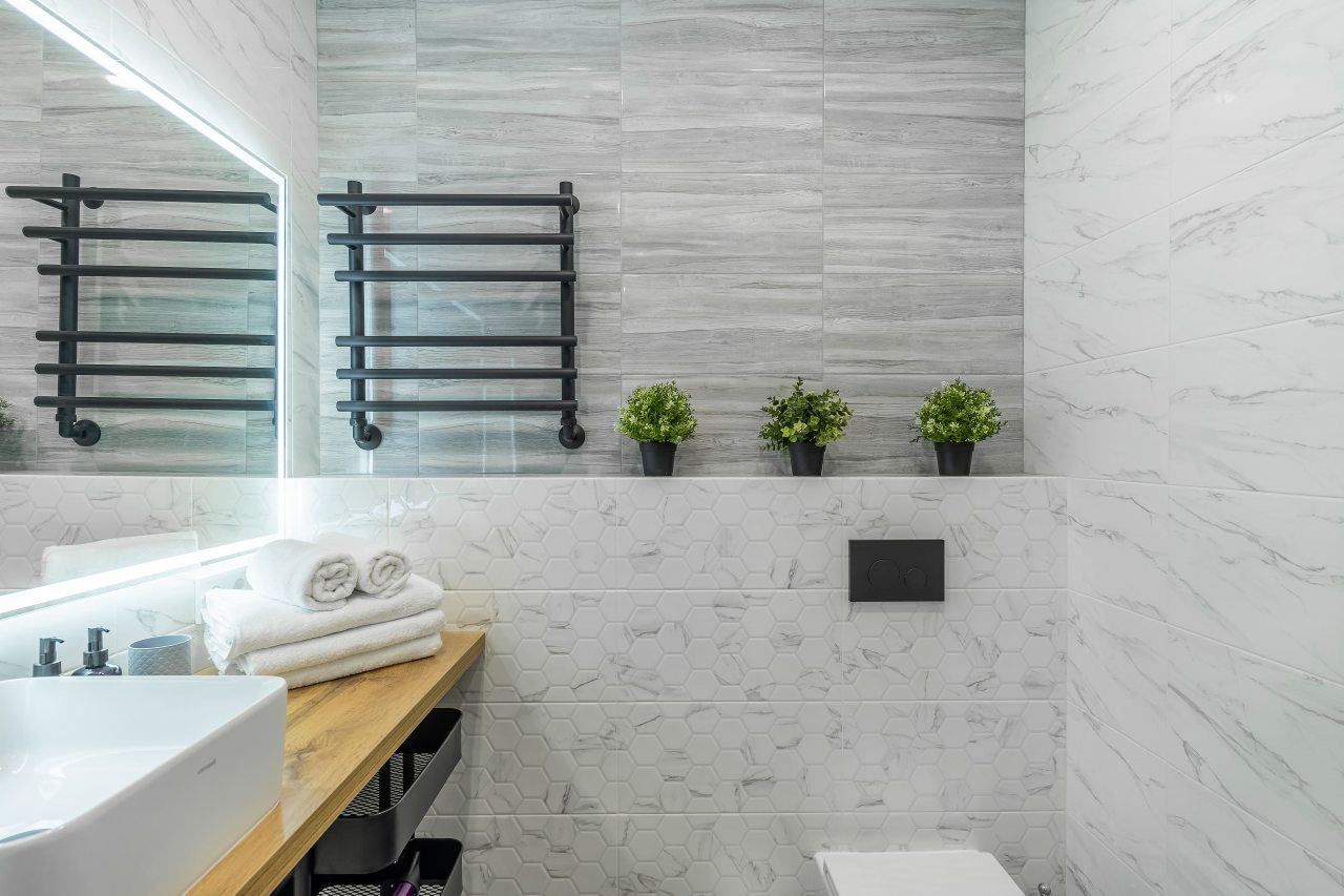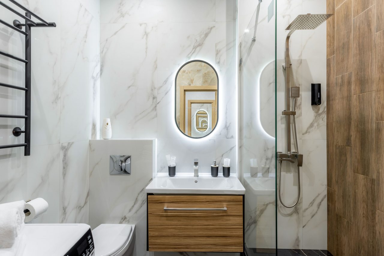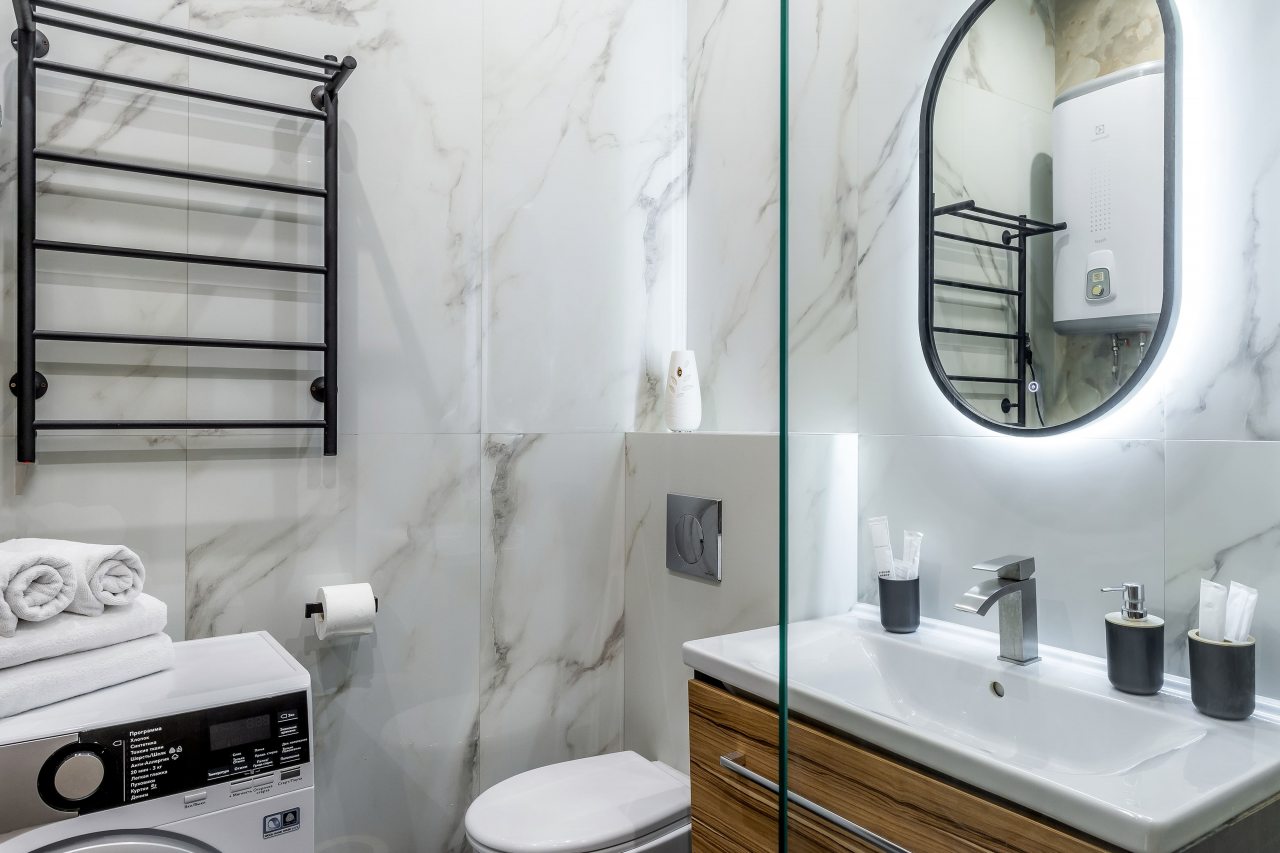 - В белоснежной ванной комнате есть даже стиральная машина и электрическая сушилка