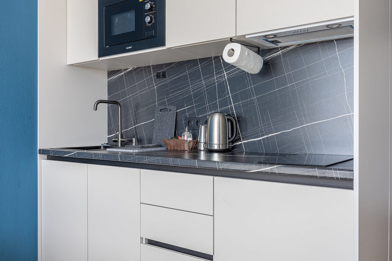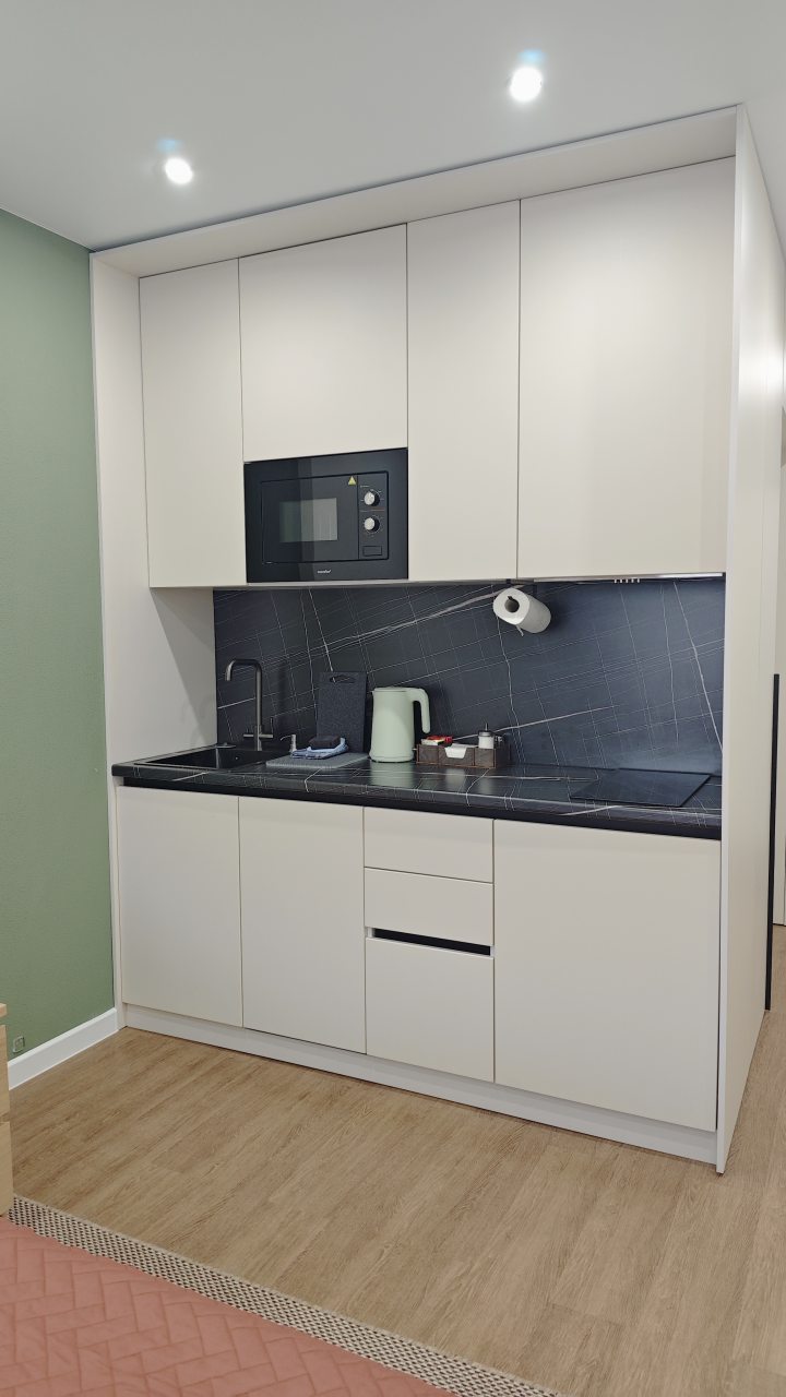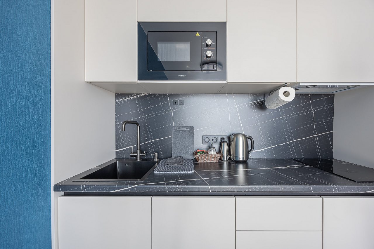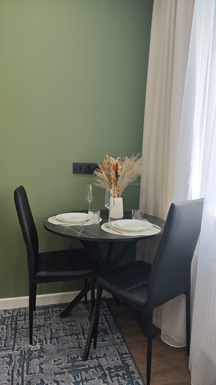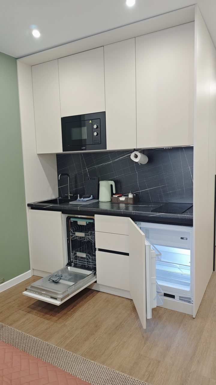 Зона кухни порадует вас всем самым необходимым. В наличии обеденный стол, посуда и бытовая техника: плита с вытяжкой, СВЧ, чайник, холодильник, посудомоечная машина.