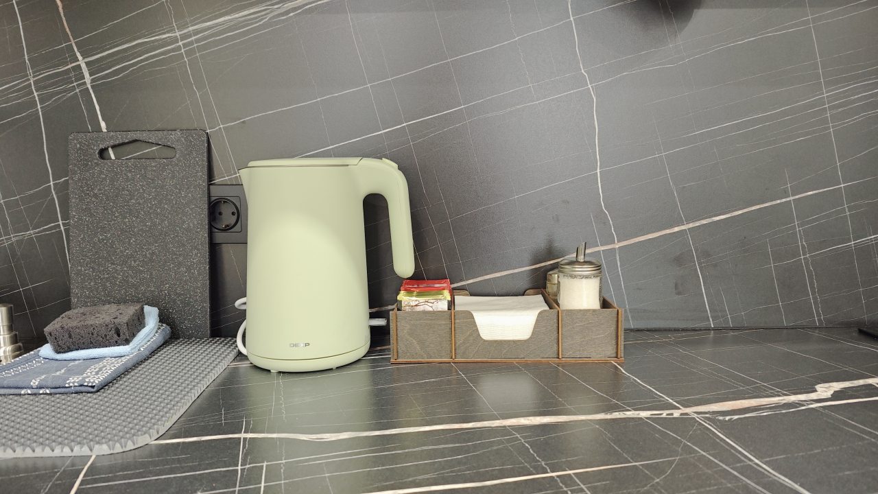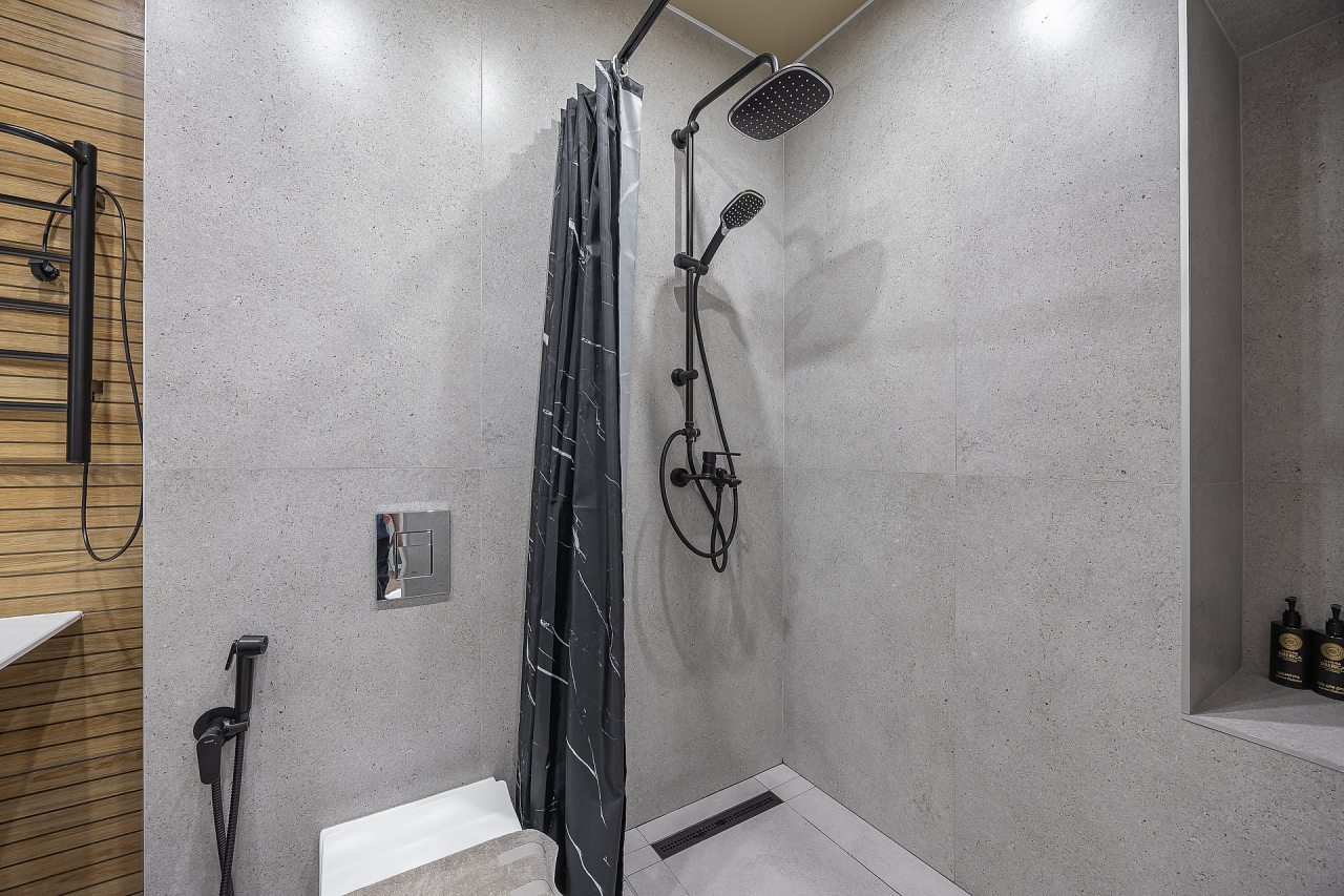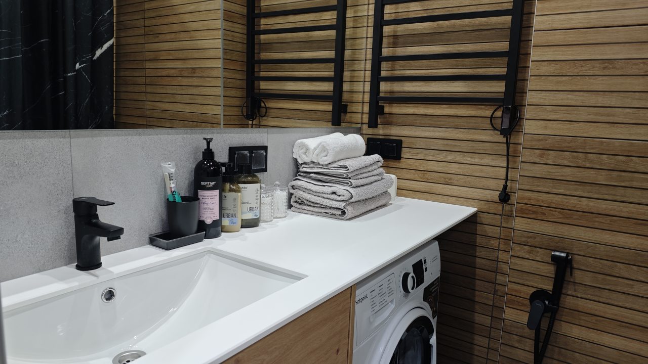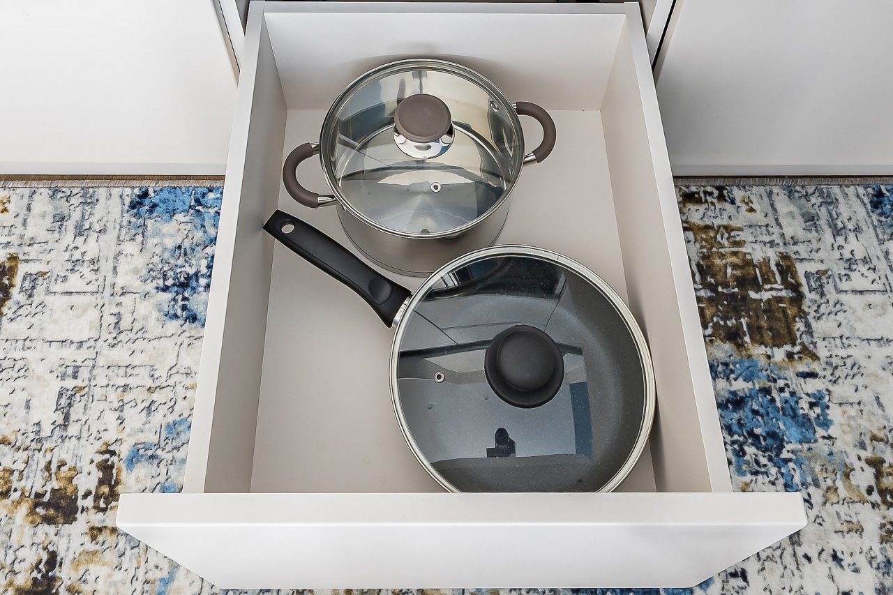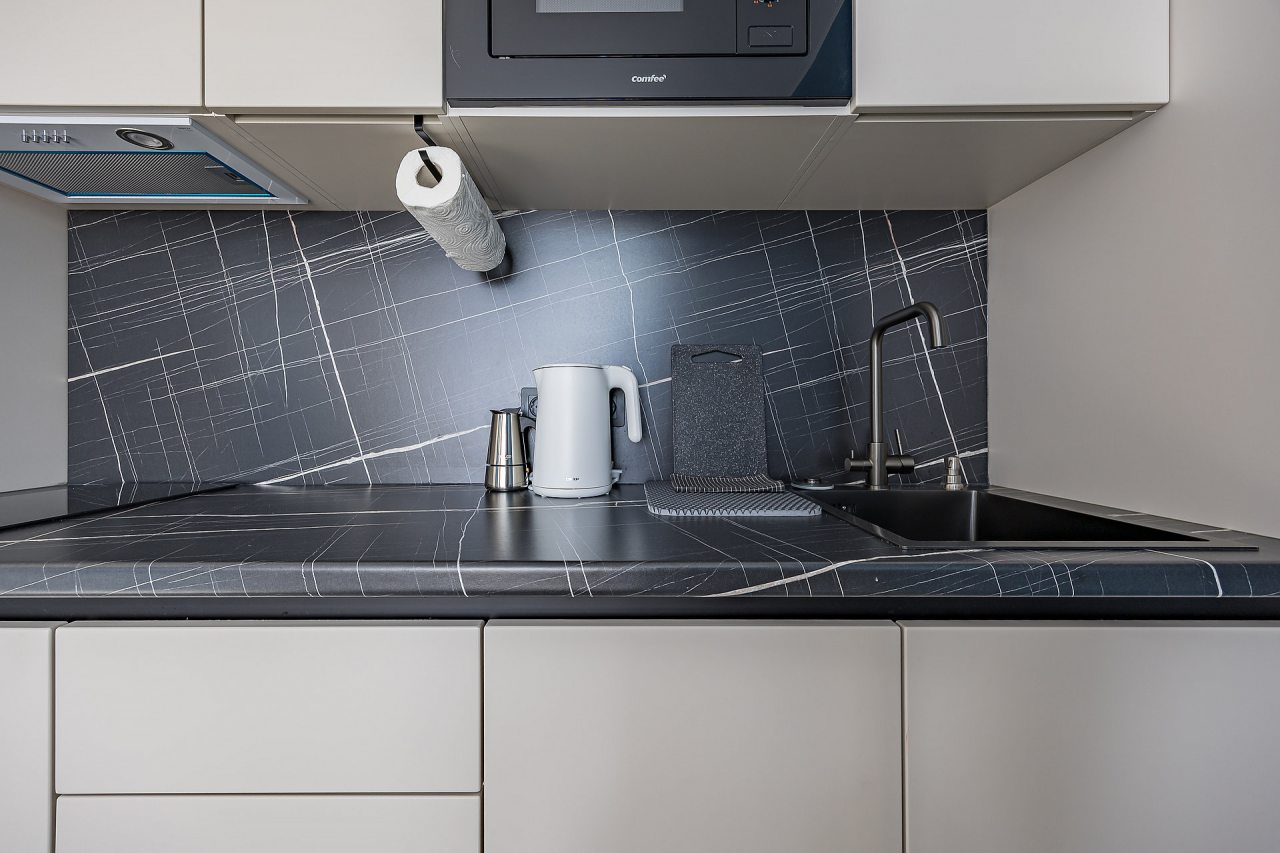 Зона кухни порадует вас всем самым необходимым. В наличии обеденный стол, посуда и бытовая техника: плита с вытяжкой, СВЧ, чайник, холодильник, посудомоечная машина.