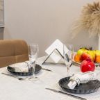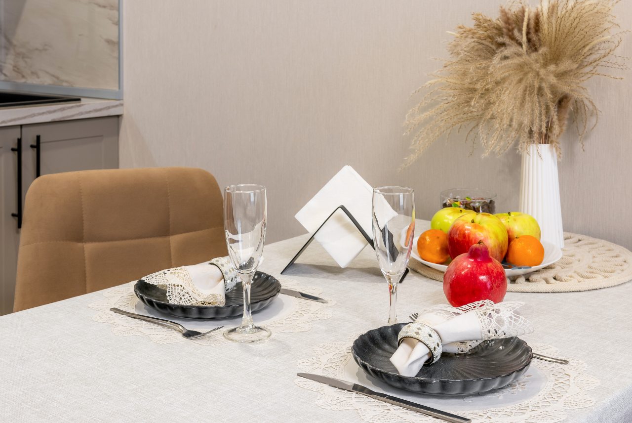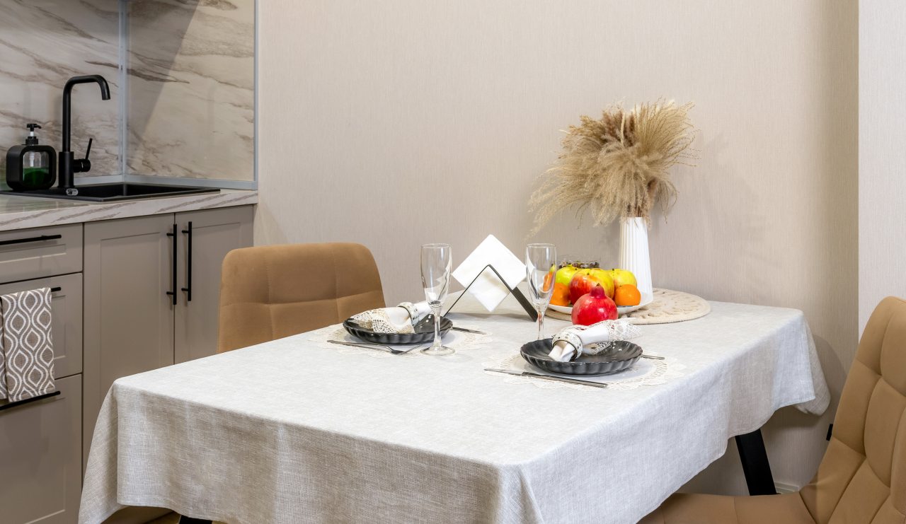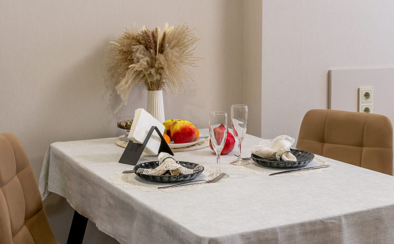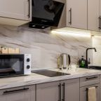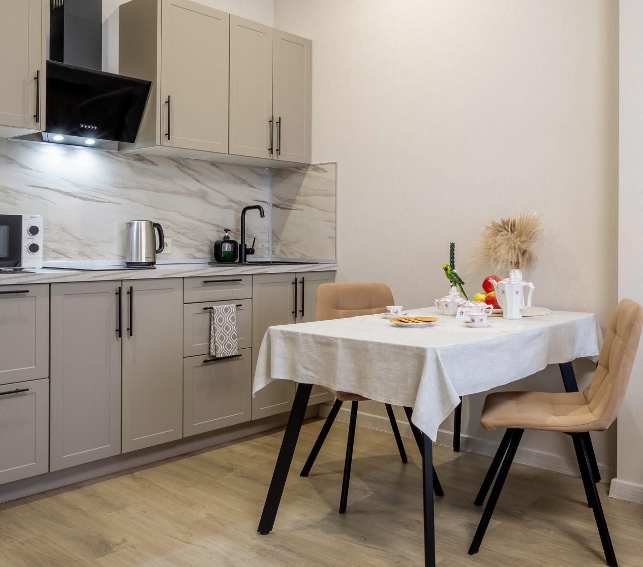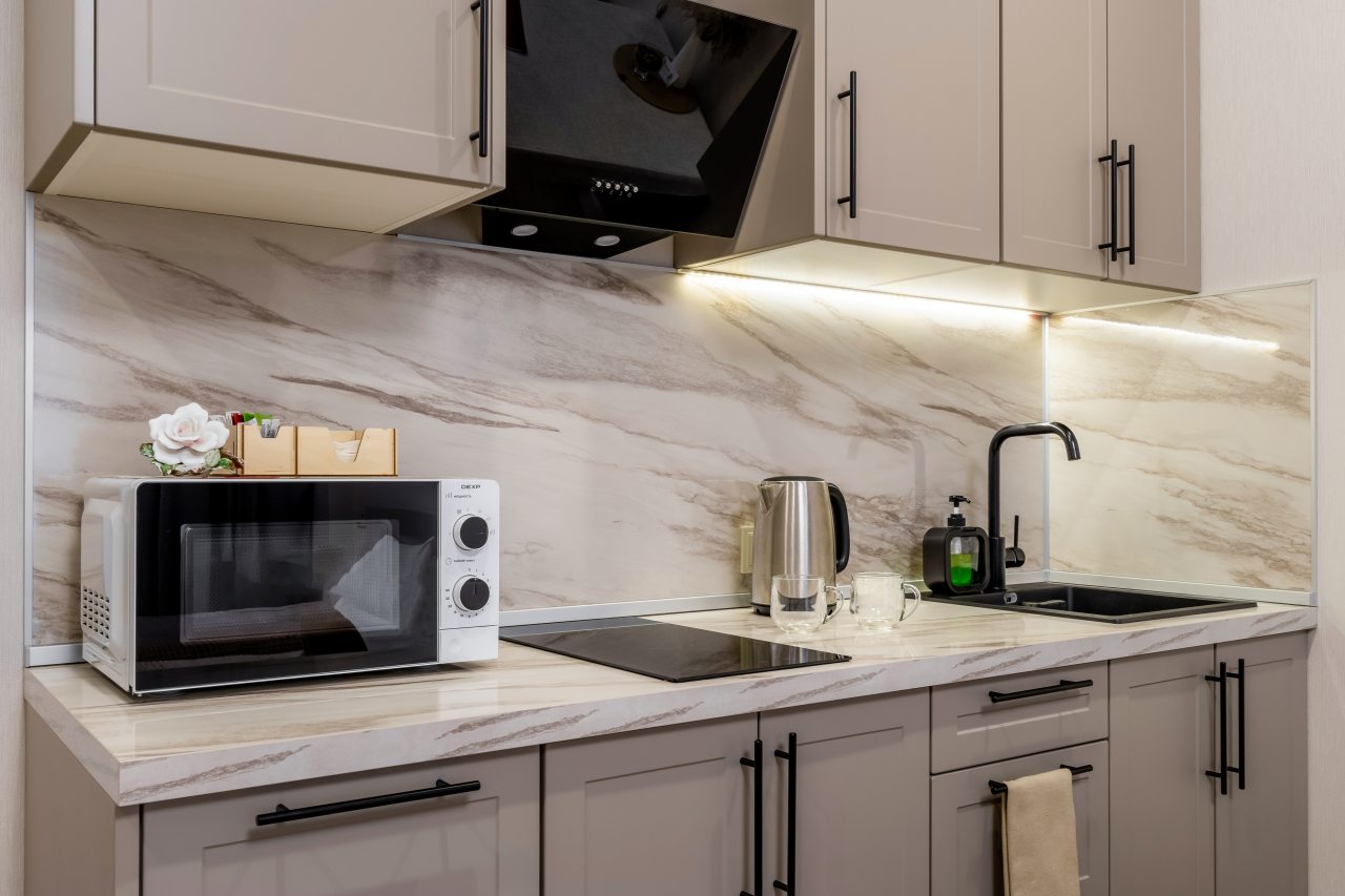 На кухне имеется всё для приготовления, в том числе варочная панель, СВЧ, чайник, вытяжка, посуда, красивая обеденная зона.