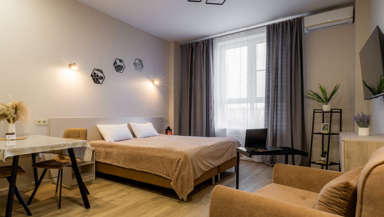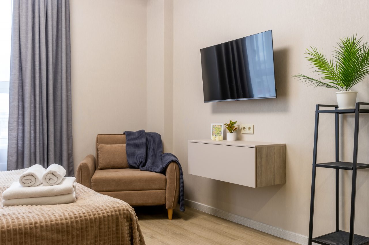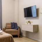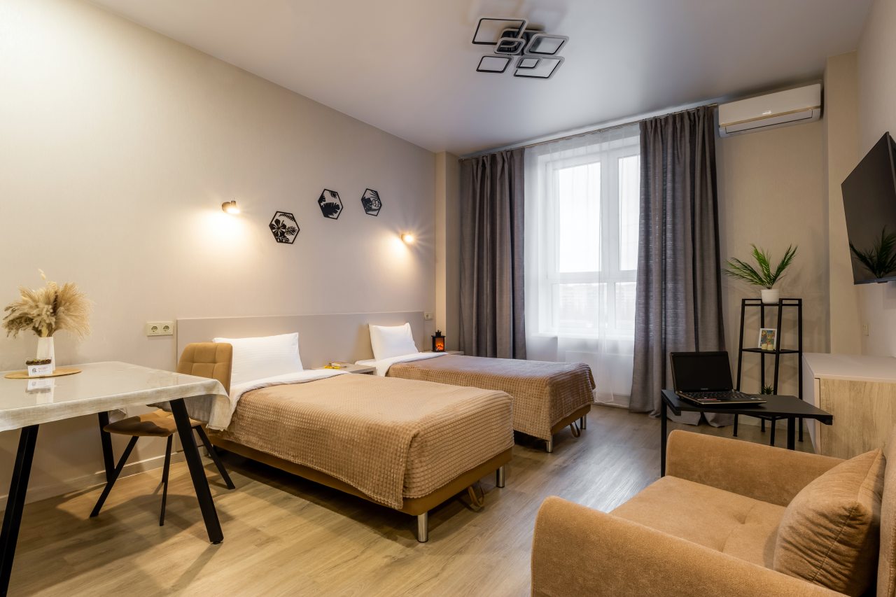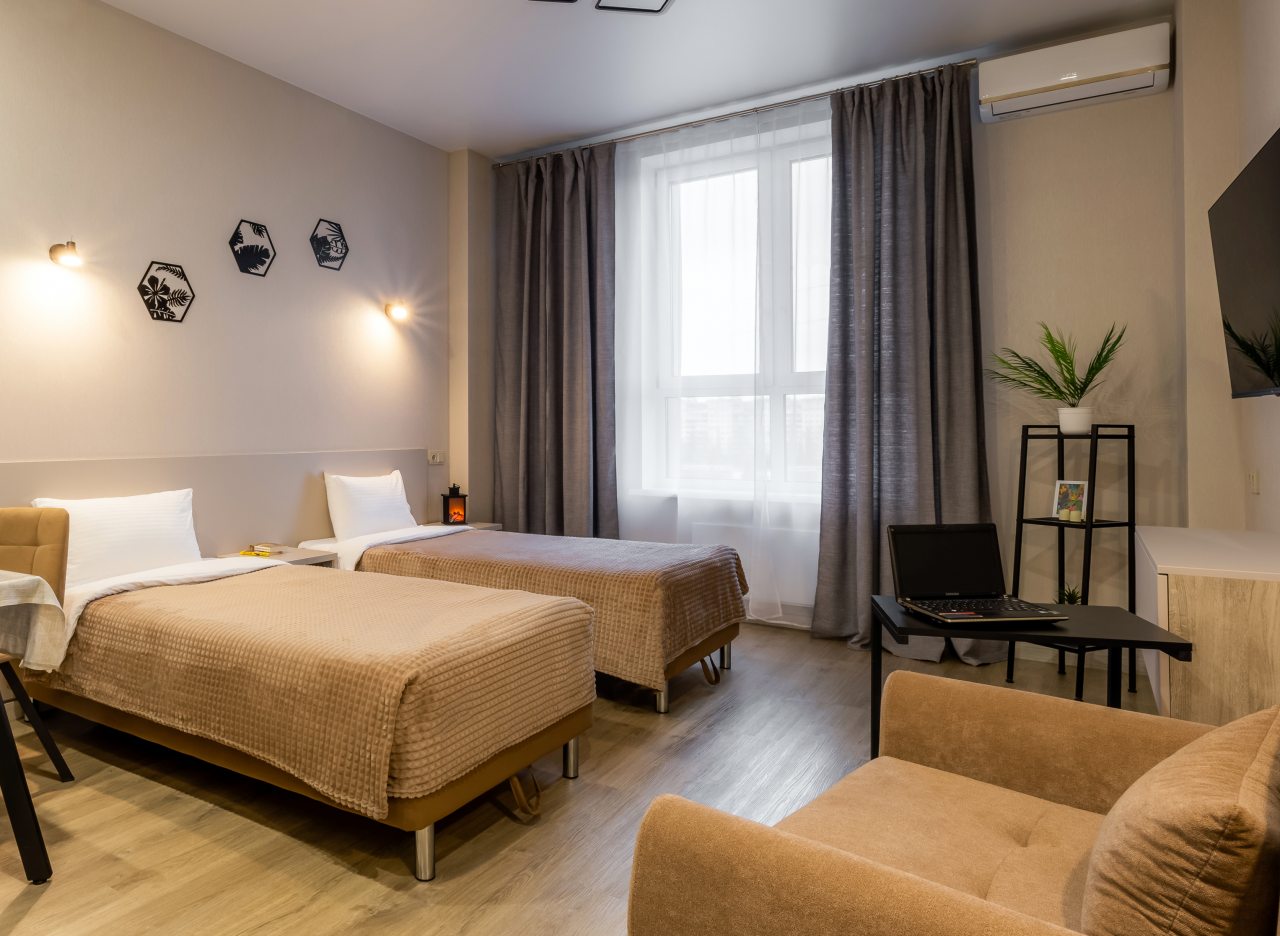 Для комфортного отдыха и размещения предусмотрены две односпальные кровати, мягкое кресло, телевизор, мини-диван, кондиционер, стильный санузел с феном, полотенцами, стиральной машиной и средствами для гигиены.
