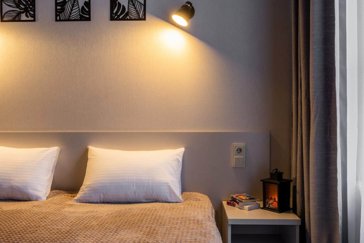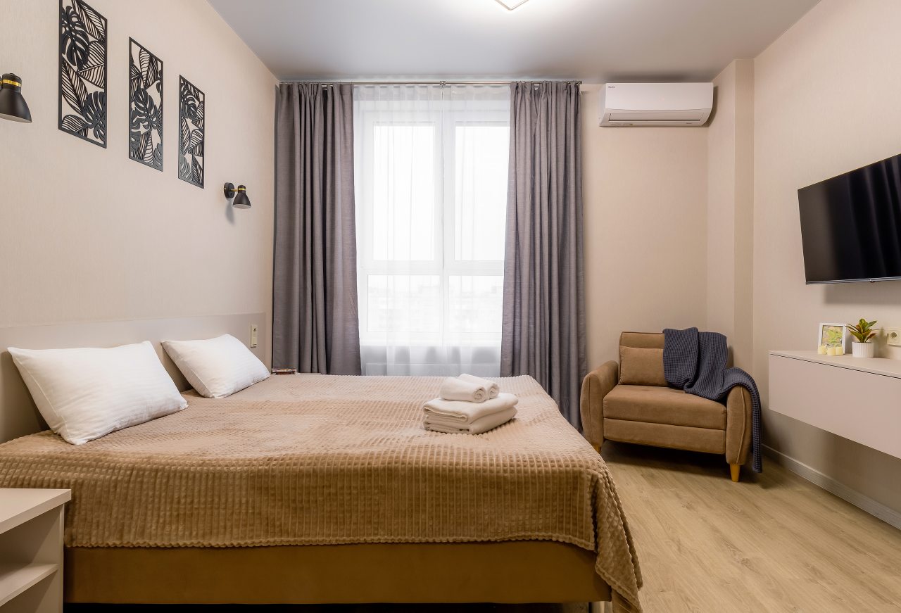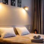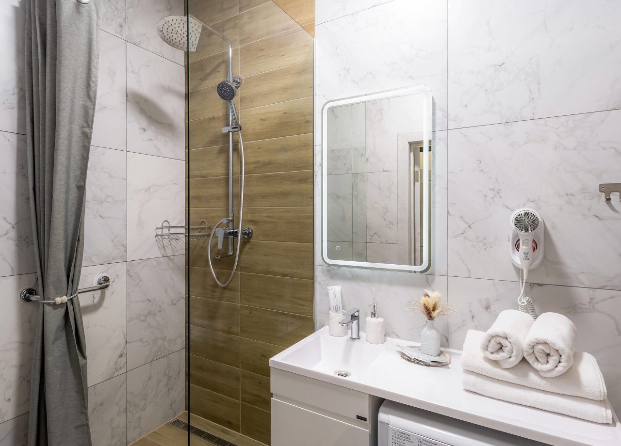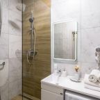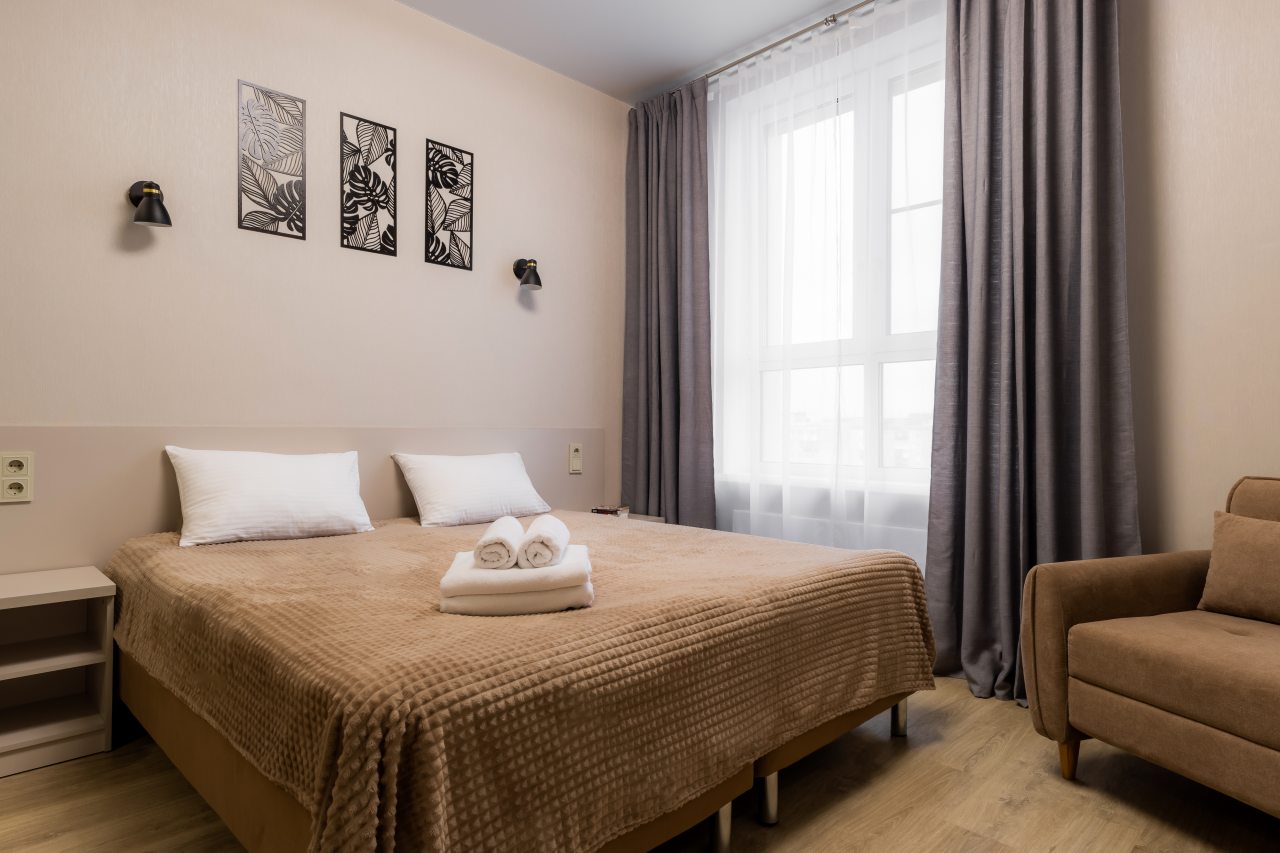 Для комфортного отдыха и размещения предусмотрены две односпальные кровати, мягкое кресло, телевизор, мини-диван, кондиционер, стильный санузел с феном, полотенцами, стиральной машиной и средствами для гигиены.
