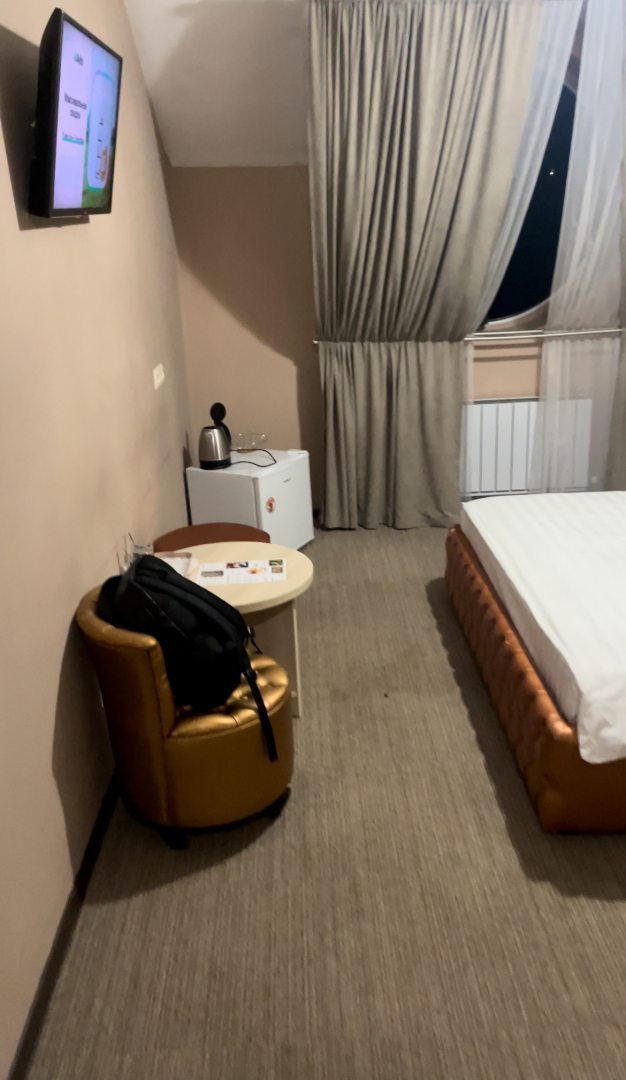 Чистенький уютный отель, заселили раньше указанного времени, мебель современная, в ванной душ, полотенца, есть все необходимое: гель для душа, шампунь, зубные щетки, тапочки. В комнате мини холодильник, чайник, 2 чашки с ложками. В коридоре кулер и микроволновка. Парковка небольшая, бесплатная. От центра удаленность чуть более 2 км, можно дойти пешком. Позавтракали в кафе в холле отеля за дополнительную плату. Отель превосходный по такой цене. У нас и у наших друзей было 2 двухместных номера на 3-м этаже. Окна панорамные. Вид из окна был на улицу, но шума мы не слышали. В нашем номере был диванчик для дополнительного спального места. Вернемся сюда снова